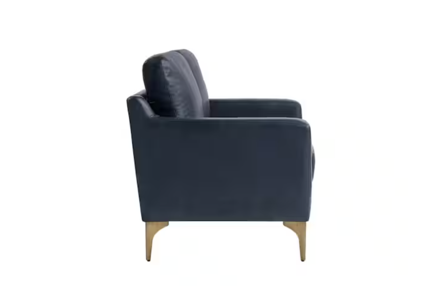 Upholstered in a navy blue faux leather Modern bronze metal legs Sturdy solid wood frame Pocket coils and high density foam seating