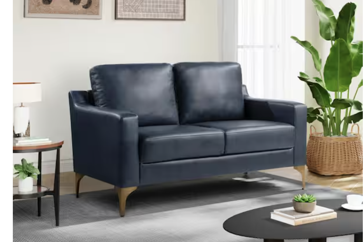 Brand new in box, unassembled, NAVY Serta, 55.5 in. Blue Faux Leather 2-Seater Loveseat Brighten up your living space with the Serta Francis sofa set. The faux leather upholstery's blue tone provides a pop of color, while the high-density foam and pocket coils within the compressed seat and back cushions ensure comfort for every guest. The solid hardwood frames give the pieces durability, and the metal legs round out the set's modern sophistication.