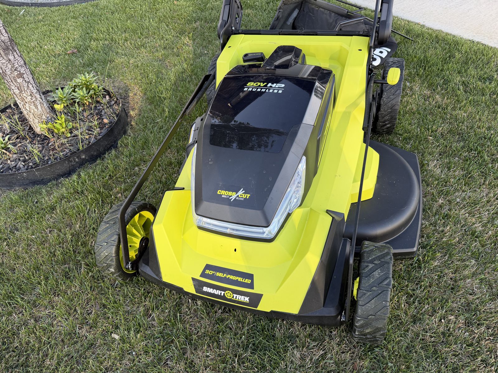 The RYOBI 80V HP Brushless 30" Self-Propelled Multi-Blade Mower delivers more power than a 223cc gas mower, making it a true gas replacement. Easily tackle up to 1 acre with up to 90 minutes of runtime per charge. Experience the industry's best 3-in-1 cutting performance with the CROSS CUT Multi-Blade System. This allows for less clumping when mulching, further & more even dispersal when side discharging, and when bagging the fine clippings fill from back to front to maximize space for less bag changes. Two premium brushless motors and advanced electronics automatically react to mowing conditions by increasing the blade speed to eliminate bogging down and powering through the toughest cut. As part of the WHISPER SERIES, this mower is engineered to be 70% quieter than gas, making it perfect for areas with noise restrictions. SMART TREK self-propelled technology allows you to easily adapt the mower's speed to your pace for less fatigue. Choose between 1"-4" cutting height with a 10-position single point height adjustment. When the job is done, the handles quickly and easily collapse for compact, vertical storage. Fully recharge your 80V 10Ah battery with the included 80V Hyper Charger in 1 hour or less.