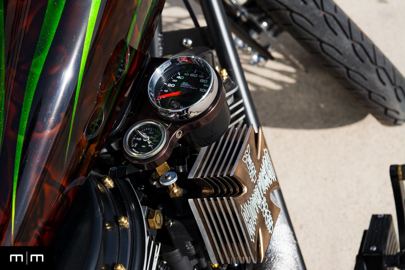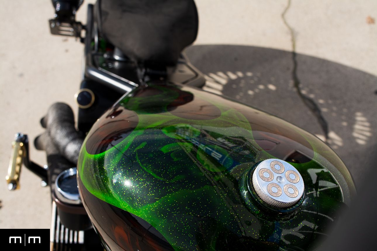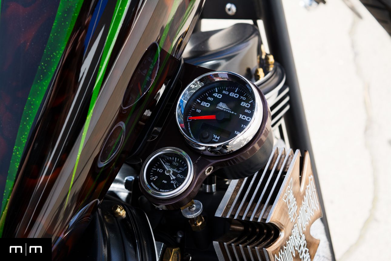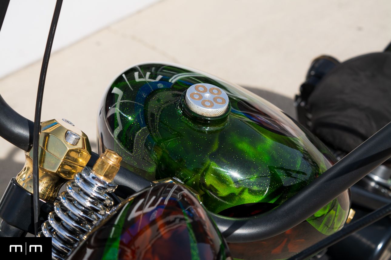 This is a true WCCH VIN and title CFL II, showing just 126 miles since completion, finished in a deep metalflake green over root beer with custom brass and black accents throughout.