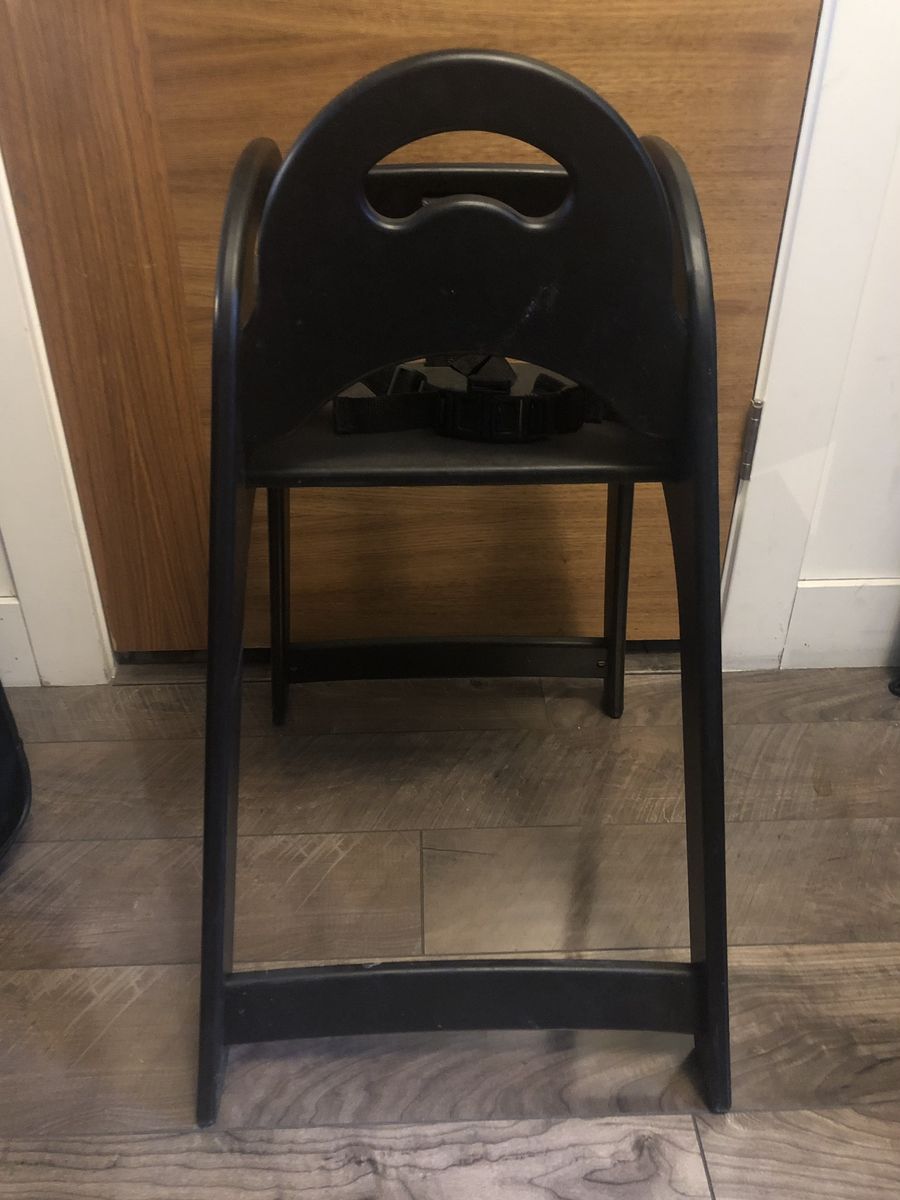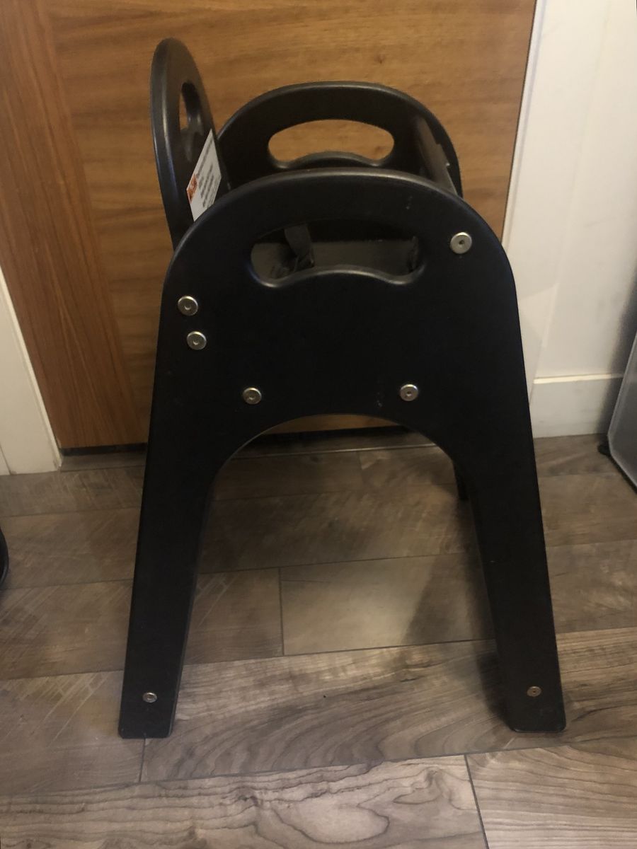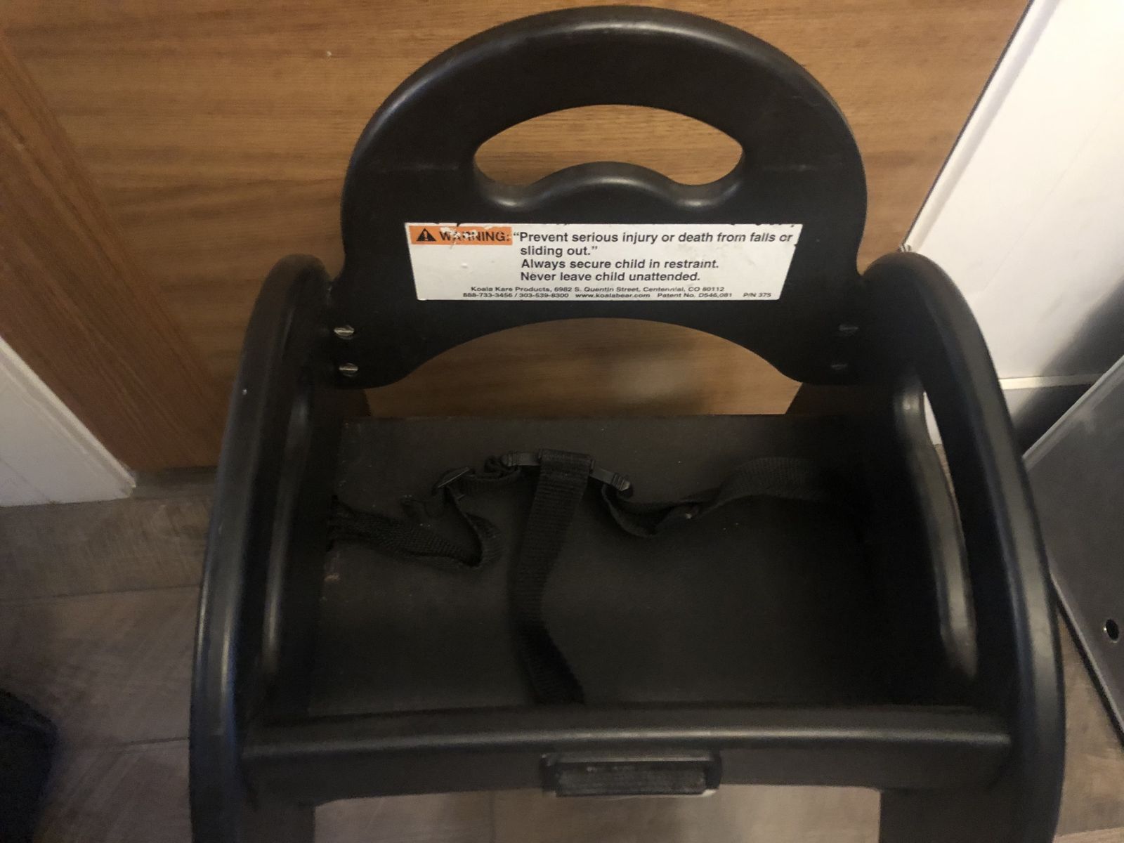 Model KB105-02 Black Color. Seat Height is 19 1/2" inches which is compatible with most tables. The overall dimensions are 22” Deep at the Base, 11 1/4” Wide, 29 1/2” Tall. Please check your table height to make sure this is the right height for yours. In Overall Excellent Condition No Issues. Seat Belt and Crotch Strap Included.