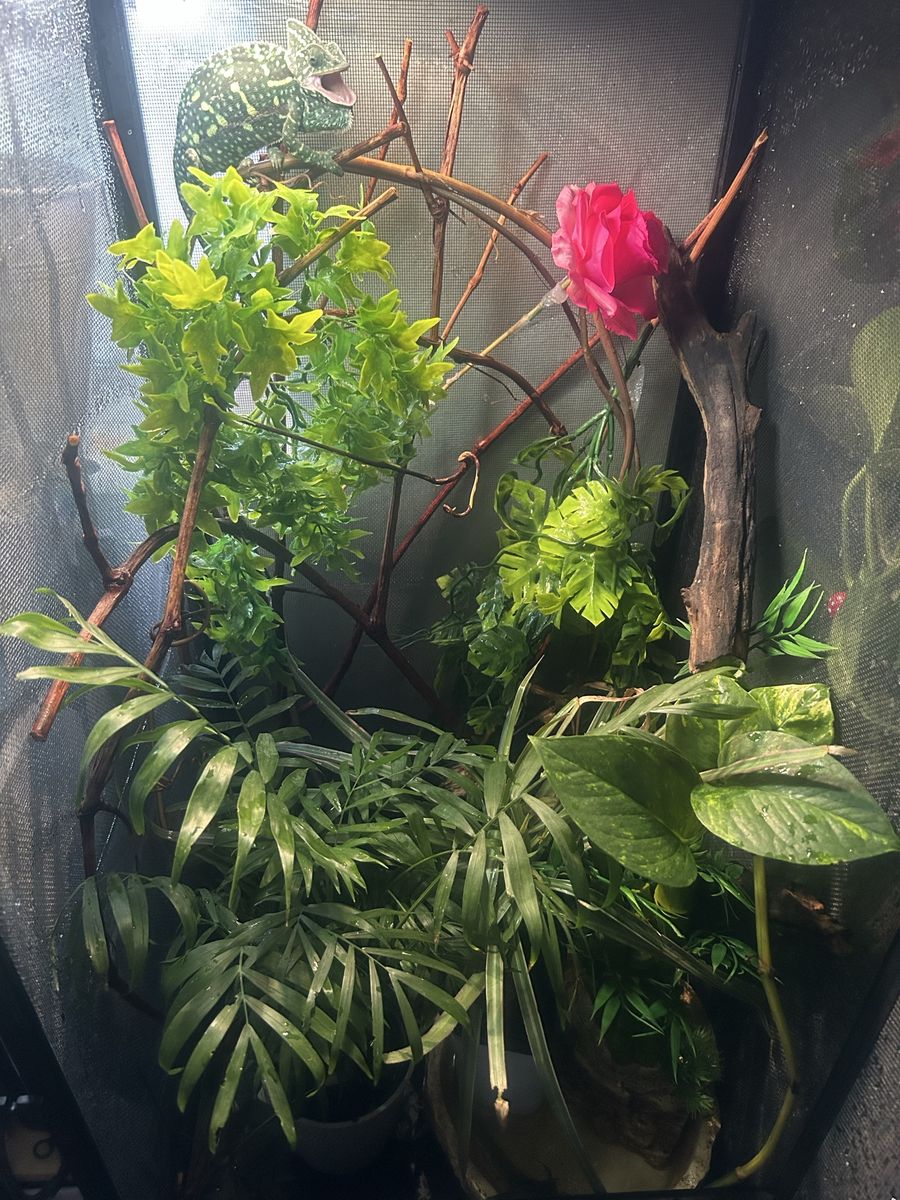 Female about 1 year old chameleon. Comes with the cage, lights, cricket keeper, repti calcium, cricket food, new extra heat light bulb. I don’t have the space for her anymore, as all chameleons she’s a bit defensive but is still handleable. I have a Fogger that works great but asking additional $30 for it.