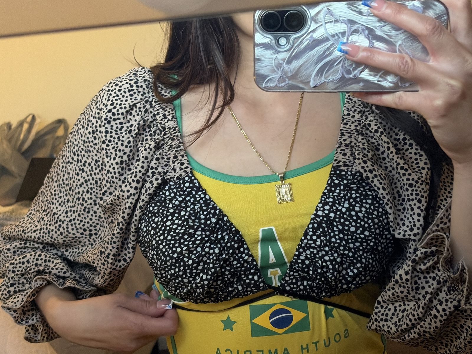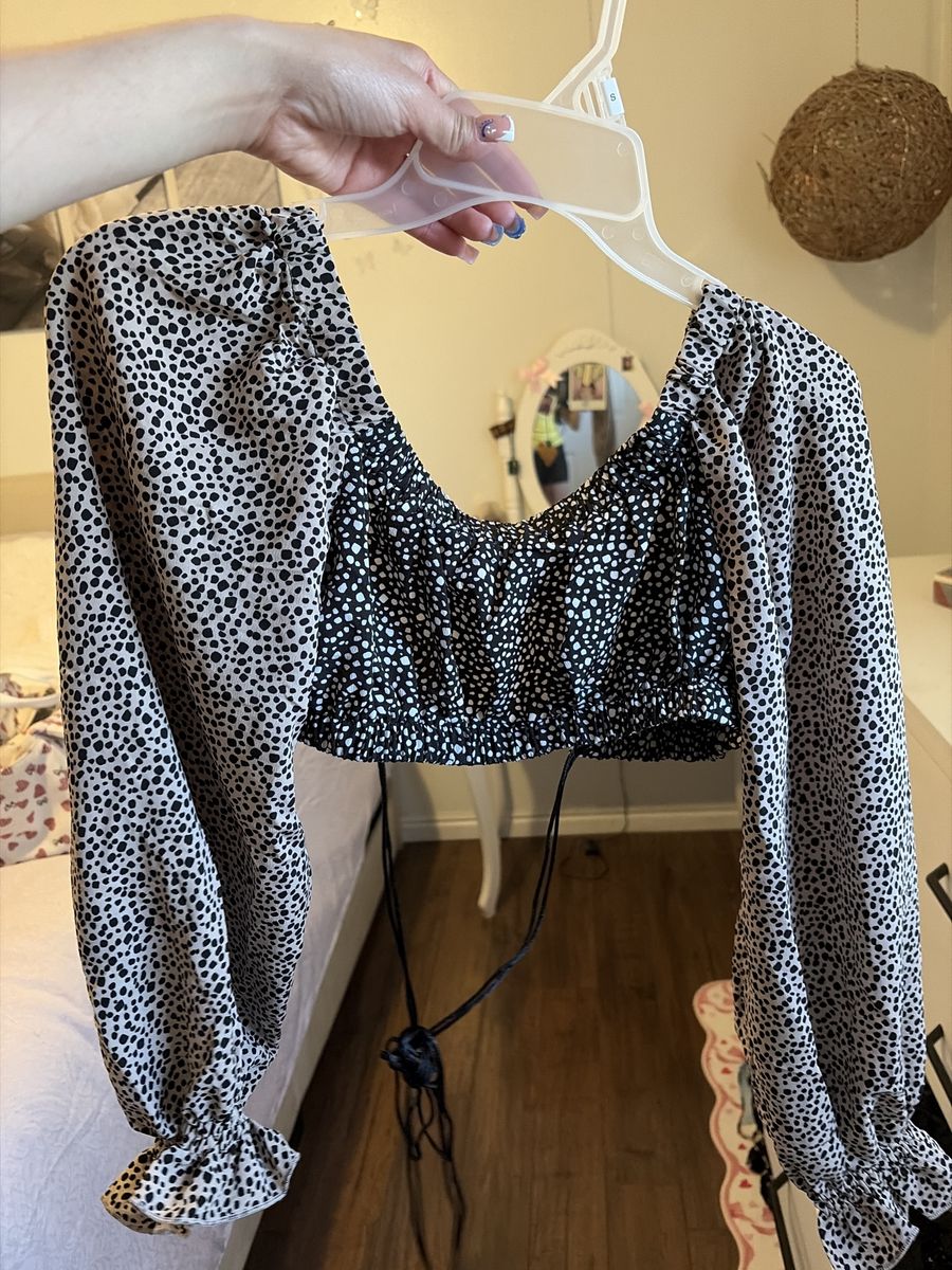 This is a long sleeve puffy top for jariepo season. It is open at the front and it ties in the front with the two drawstrings on each side.Size small