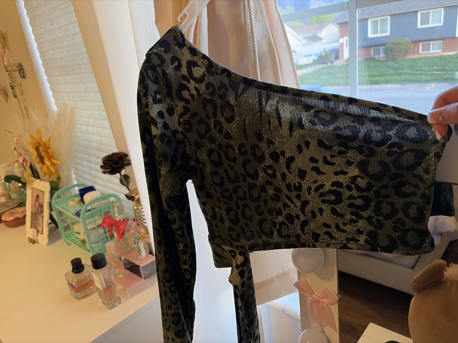 Brand new women’s size small long sleeve top. It is almost like a crop top that has the sleeve on the other side, super cute different type of style, and it has a strap at the bottom that wraps around your stomach and ties on the side.