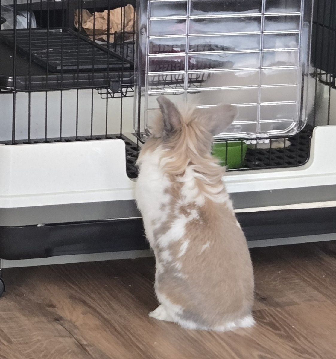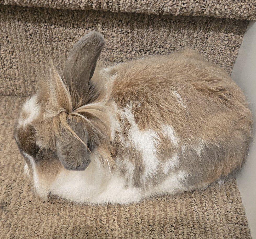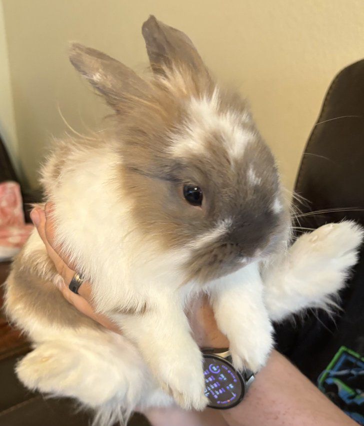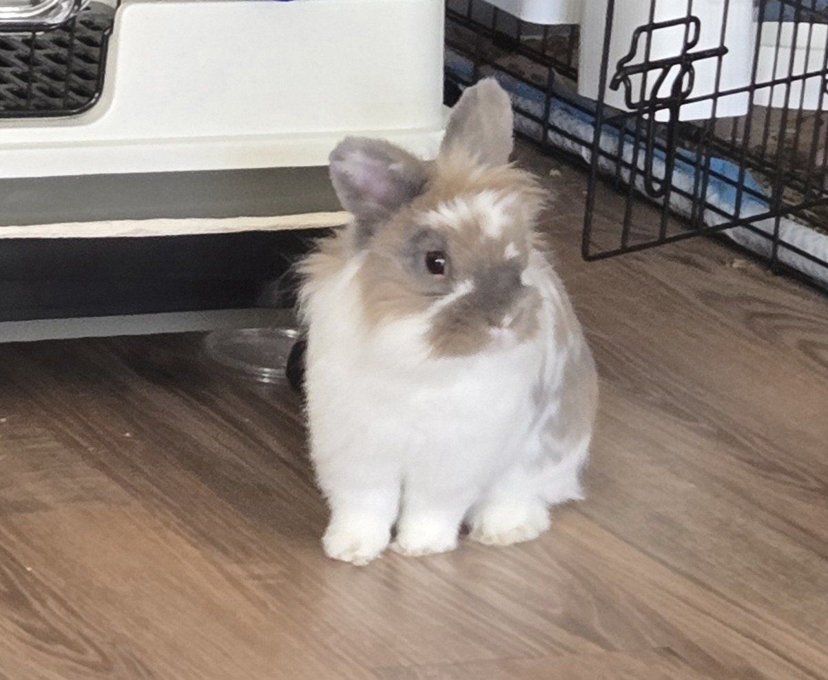 He is litter box trained. He loves roaming the house and doesn't chew on things. His birthday is February 15th, 2024. He loves being with other rabbits. He loves people.