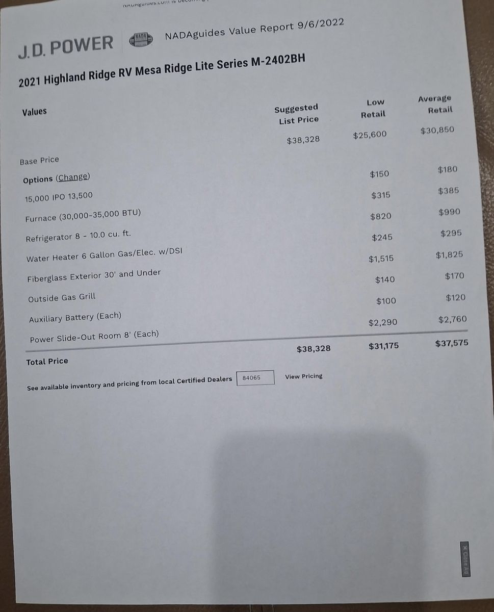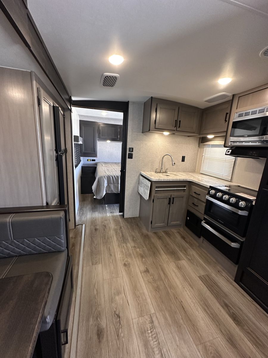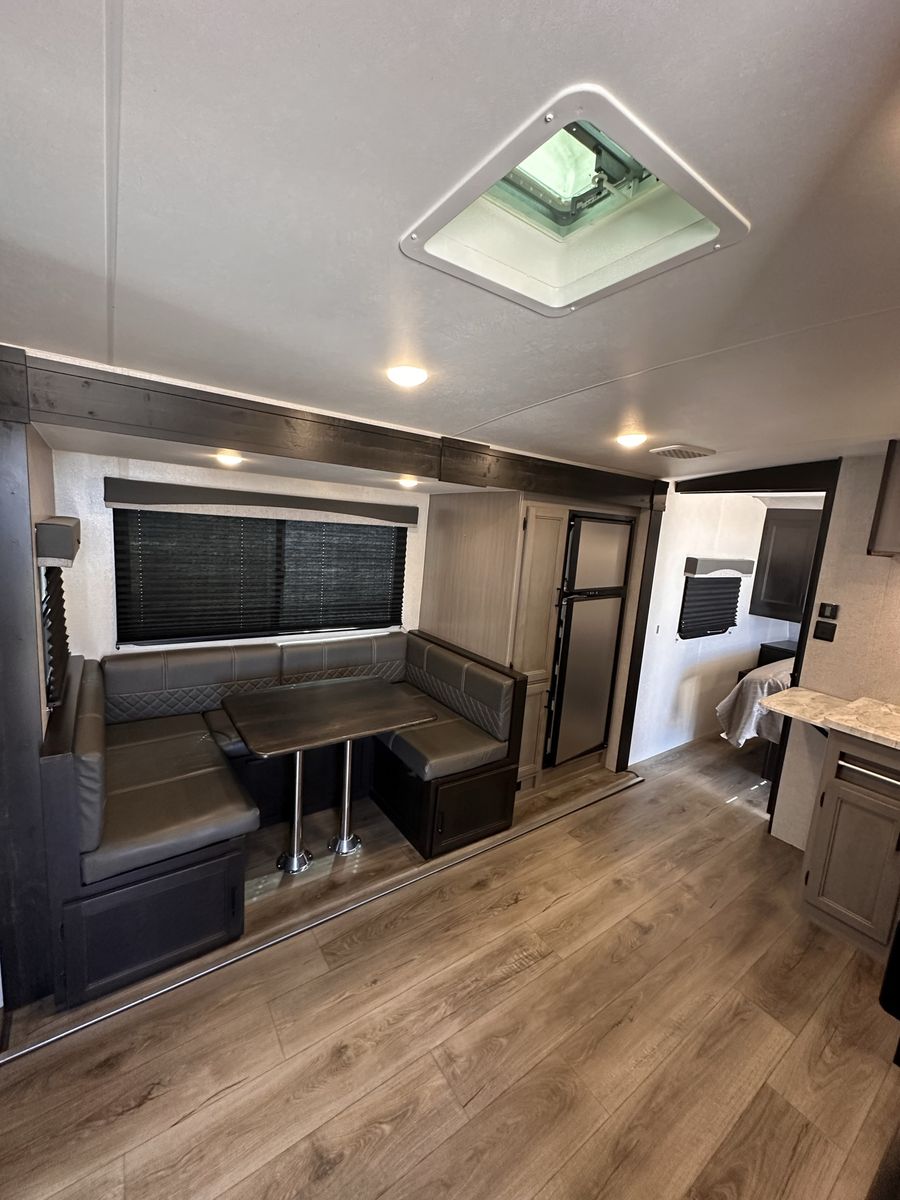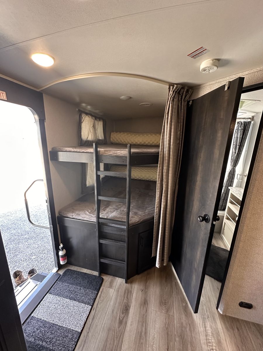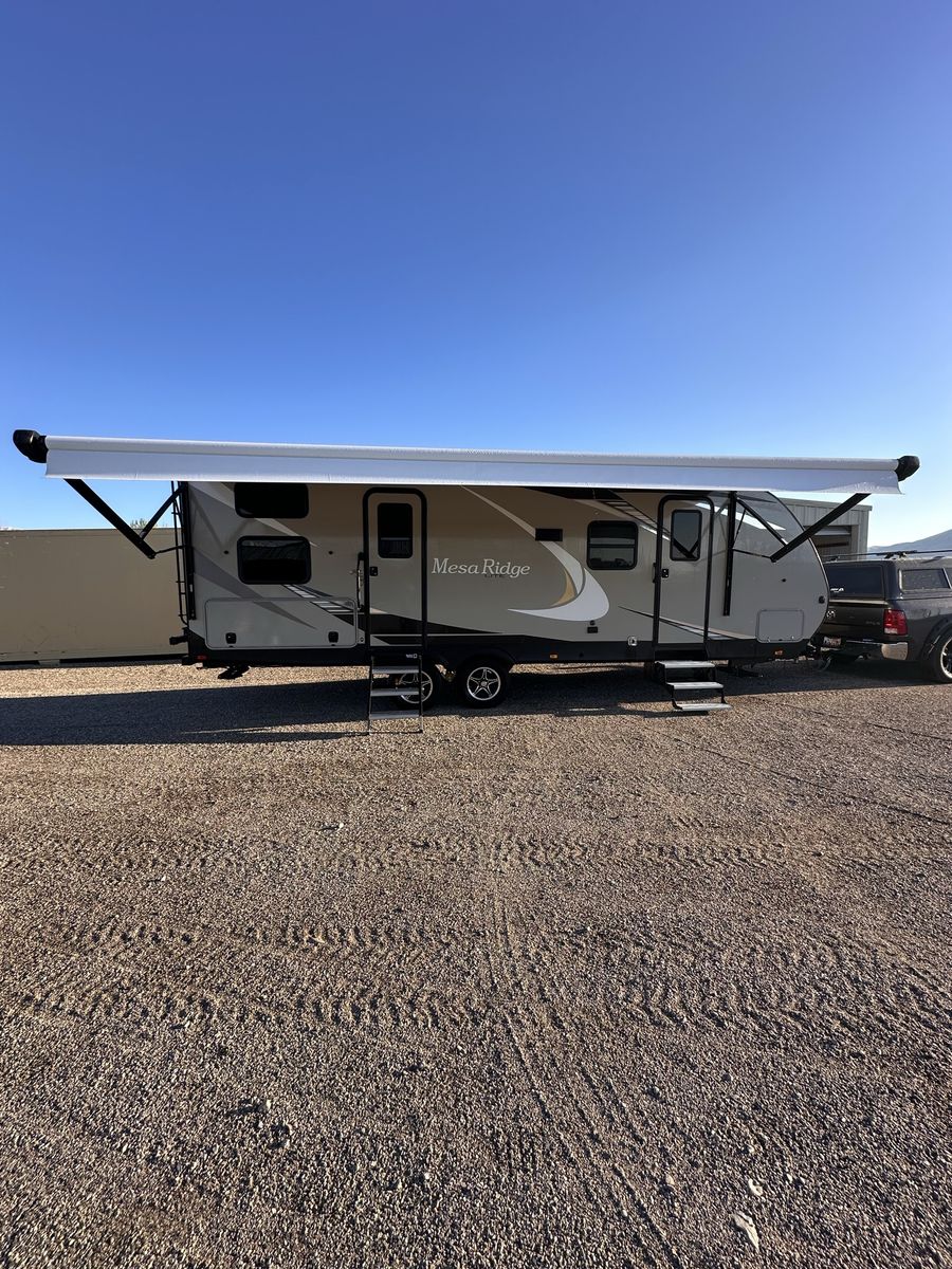 2021 Mesa Ridge Lite 2402BH Travel Trailer Very nice trailer. Great layout! Gently used Always Garage stored. Cleaned inside and out after every use. Winterized every year. 8 cu. ft. Refrigerator Quick Recovery Gas/Electrical Water Heater 15K A/C with Quiet Residential Return Air Prepped for Observation Camera Solid Swing Down Step Power Awning with LED Lighting & Speakers Stainless Steel Appliances Stainless Steel Under Mount Sink Outside Enclosed Docking Station Motion Light in Pass-through Storage Area Battery Disconnect Solar Prep Queen Mattress (60" x 80") Seamless Countertops Throughout Linoleum Throughout Flooring (No Carpet) PVC Roofing Membrane (15 Year Warranty/ Non-Prorated) Porcelain Toilet
