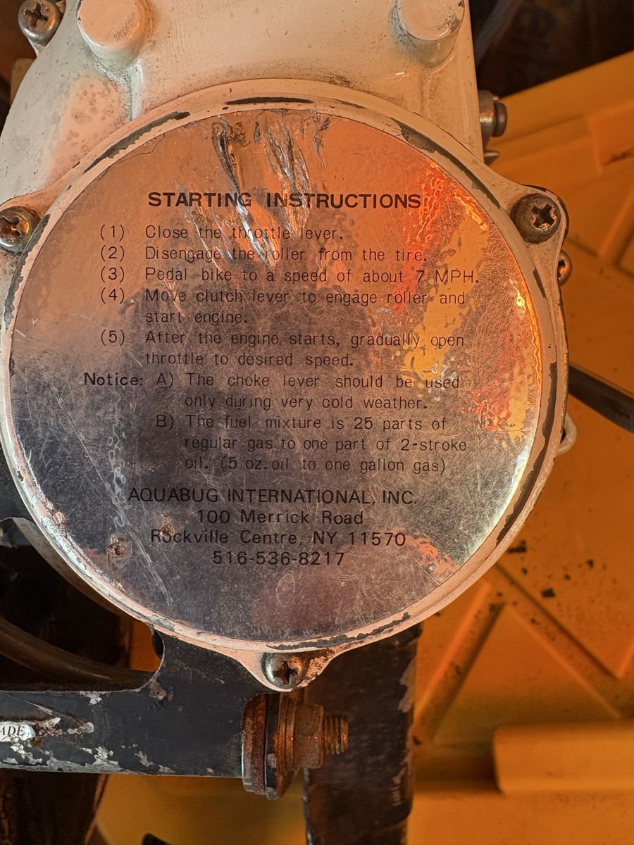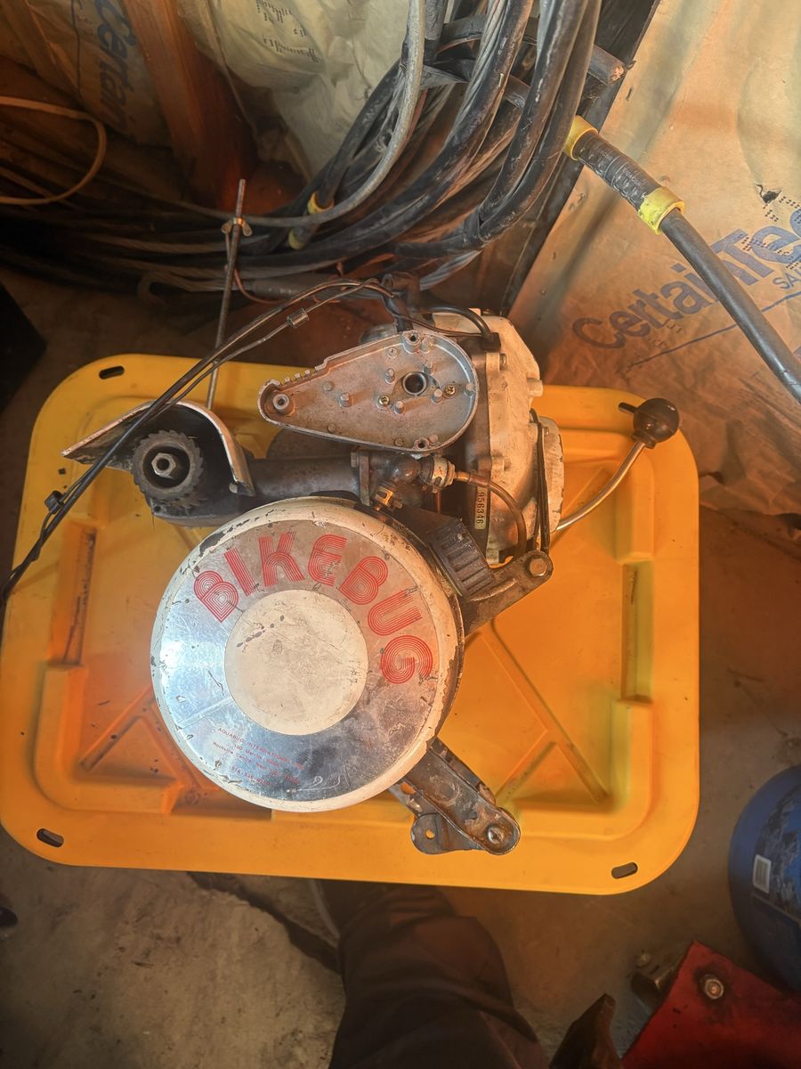 VenmoVintage Aquabug International bicycle motor engine. Fork-mounted bike attachment. Untested – last run unknown. Sold as-is for parts, repair, or restoration.