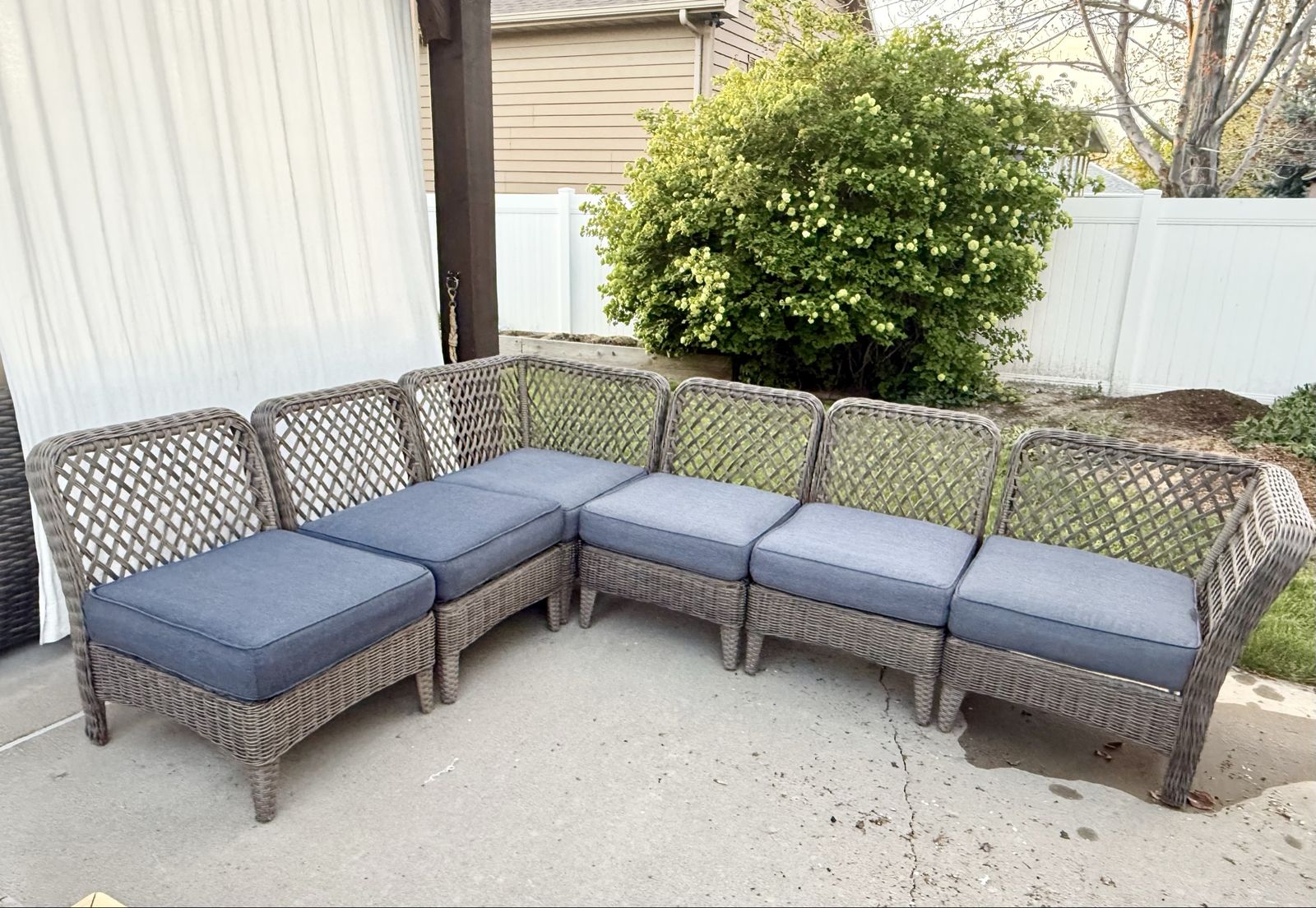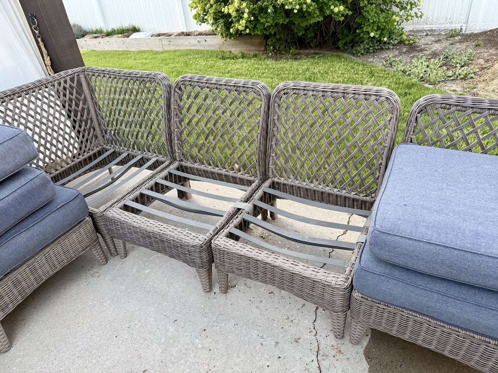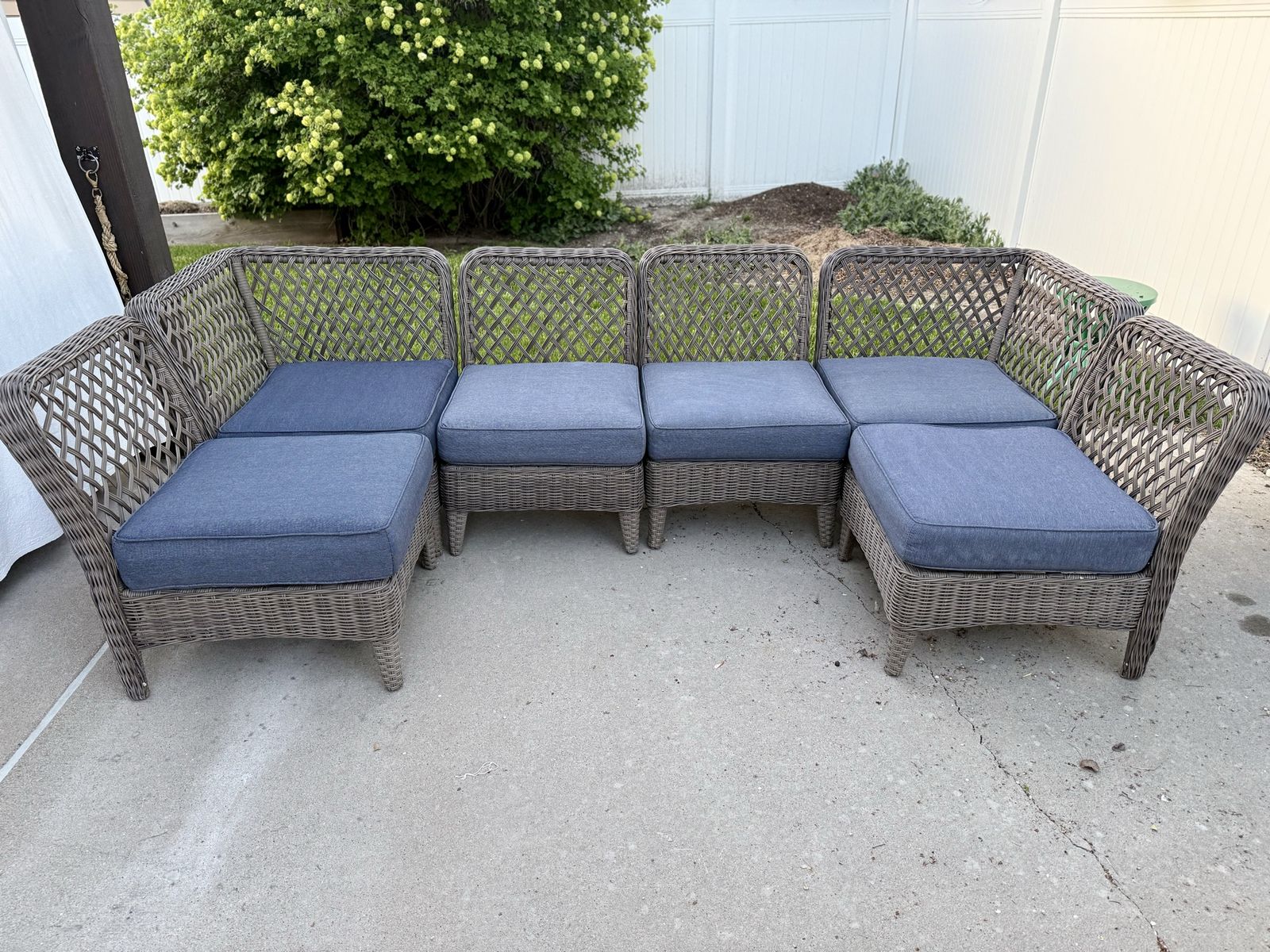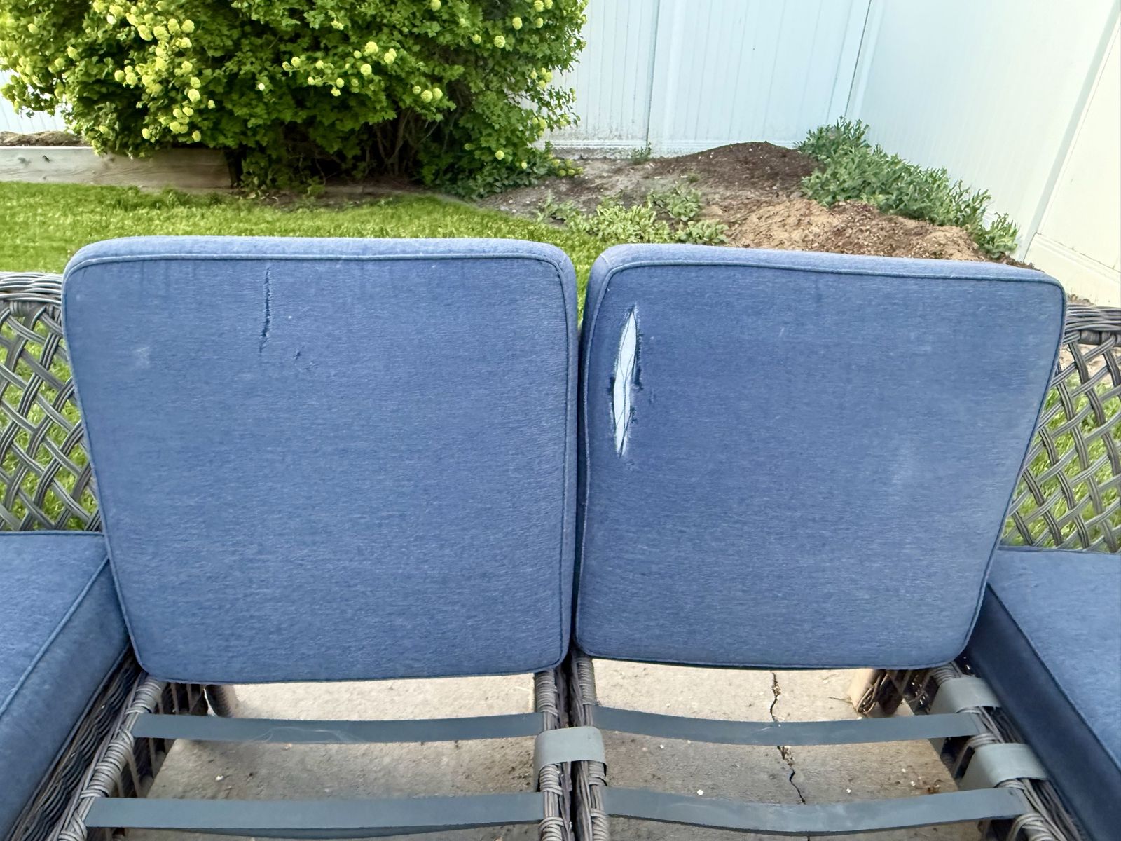VenmoNice patio furniture, about 6 years old. Purchased at Lowes. Have replaced the back cushions with pillows. Seat cushions are still in good shape with two cushions showing wear on the underside. Frames are still like new. Has been kept out of the weather under a covered pergola.