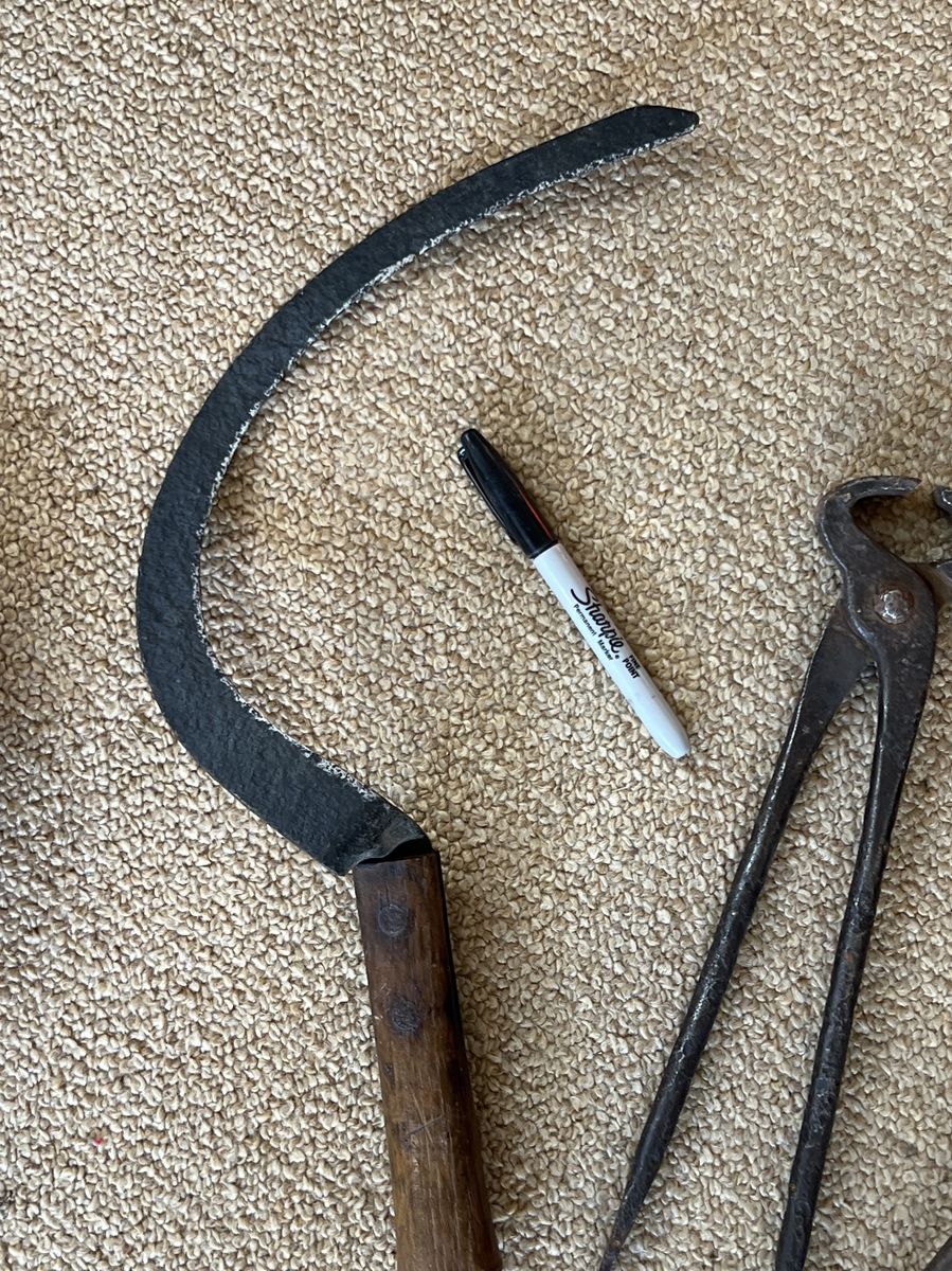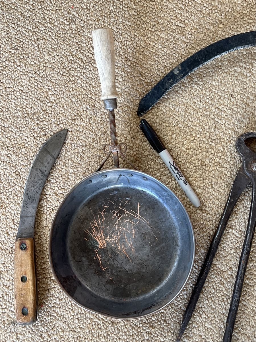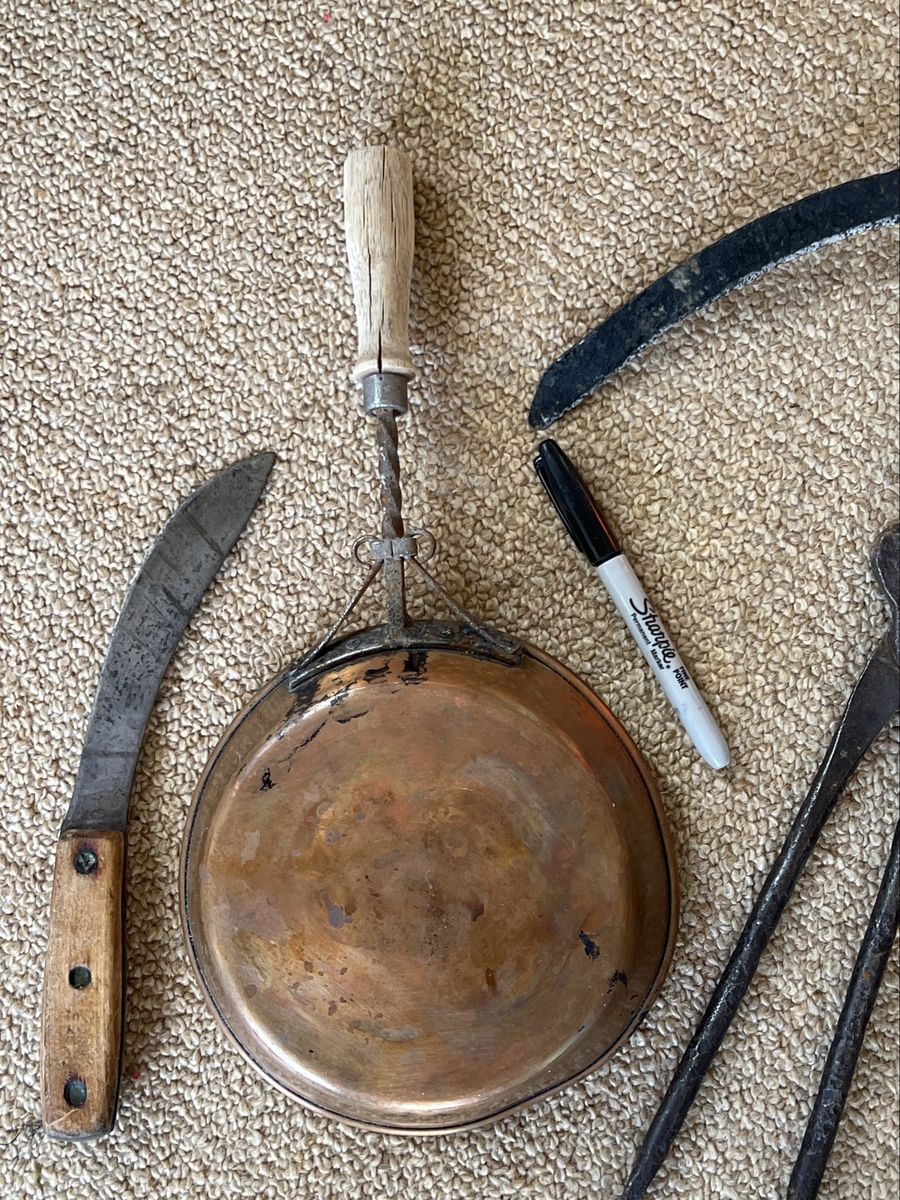 VenmoThis is a collection of antique tools and utensils, often referred to as "allmoge" tools or primitive farm implements, typically dating from the 18th to the early 20th century. The collection includes forged iron tools such as a sickle for harvesting grain, blacksmith-made tongs, specialized knives, and wooden-handled implements for tasks like basketmaking (e.g., a bodkin or fid), and a twisted iron handle copper pan. These items were essential for rural life, covering activities from agricultural harvesting to household chores and traditional woodworking. The tools are crafted from steel, wrought iron, and wood, showing significant wear consistent with age and some rust and scratches. Pick up in Draper. Cash or Venmo. $80 for all. Not selling separately. listed for a client