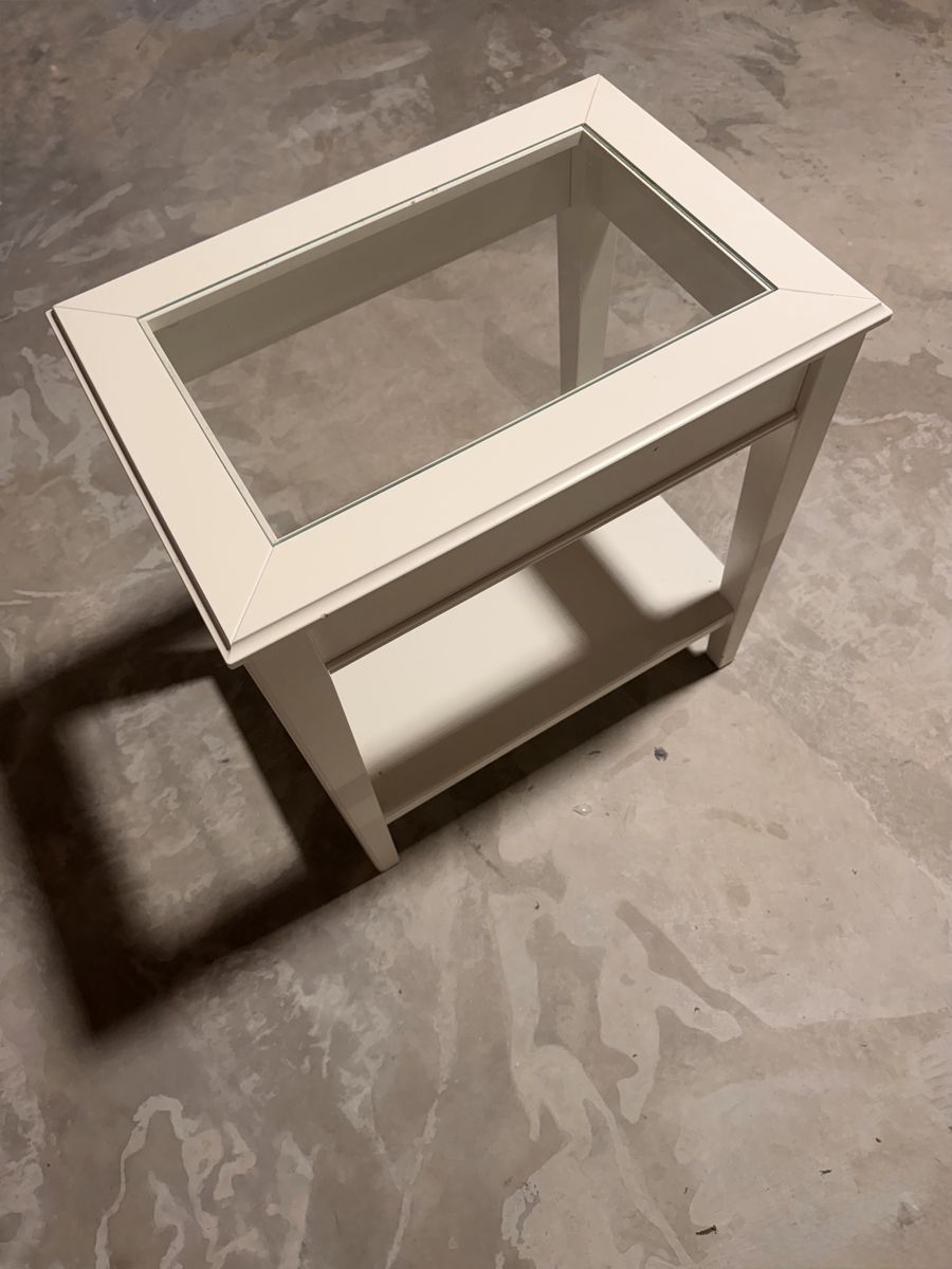 Condition: Good pre-owned condition. Smoke-free home. The glass is clear, and the white finish is bright. Does have scratches and nicks. Drawer on media center is damaged