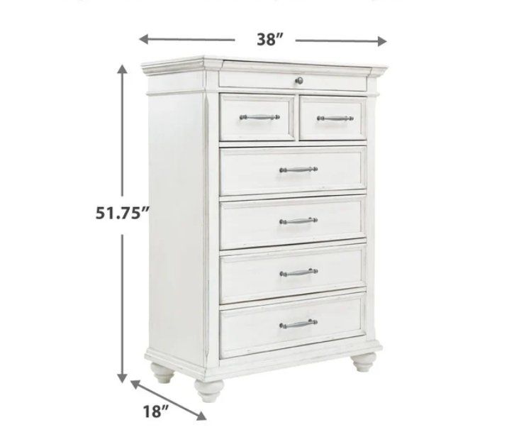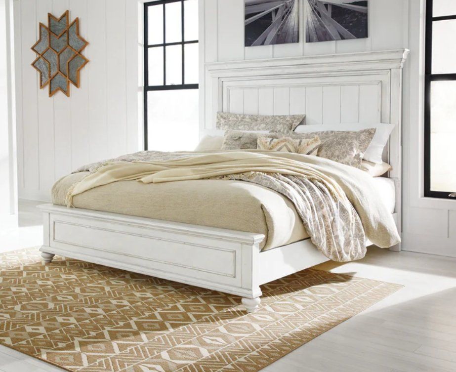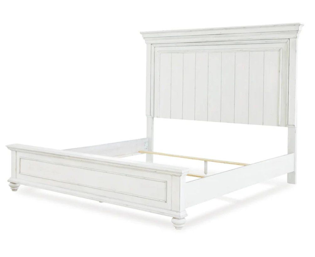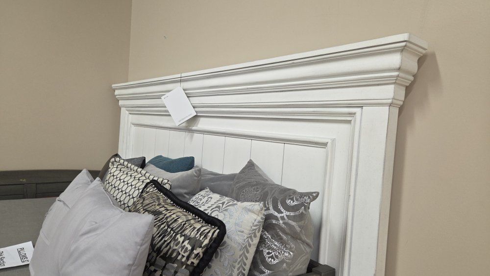 Beautiful king size set! Like-new Includes king size bedframe and 7-drawer chest. Made with solid wood, veneers and engineered wood. Beautifully distressed whitewash finish. Generously scaled moulding, framed drawer fronts, nailhead trim and bun feet enhance the character of this bedroom set. Located in Layton. Delivery Available!