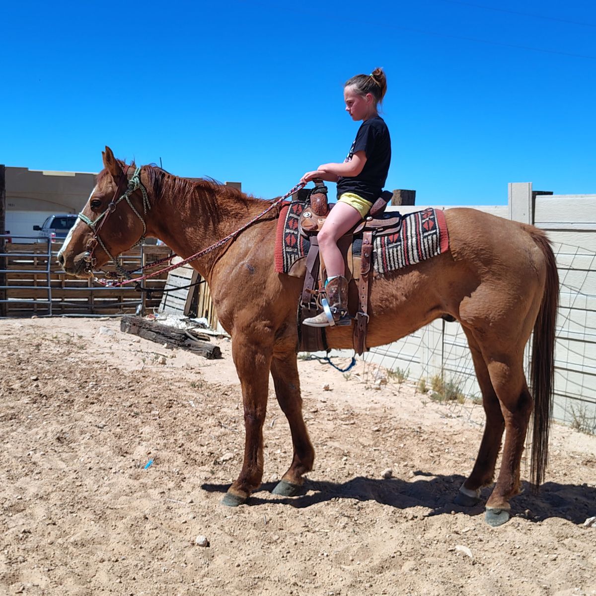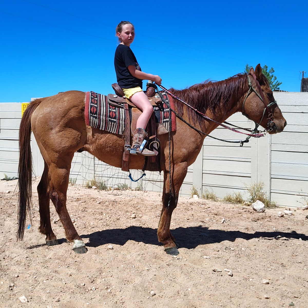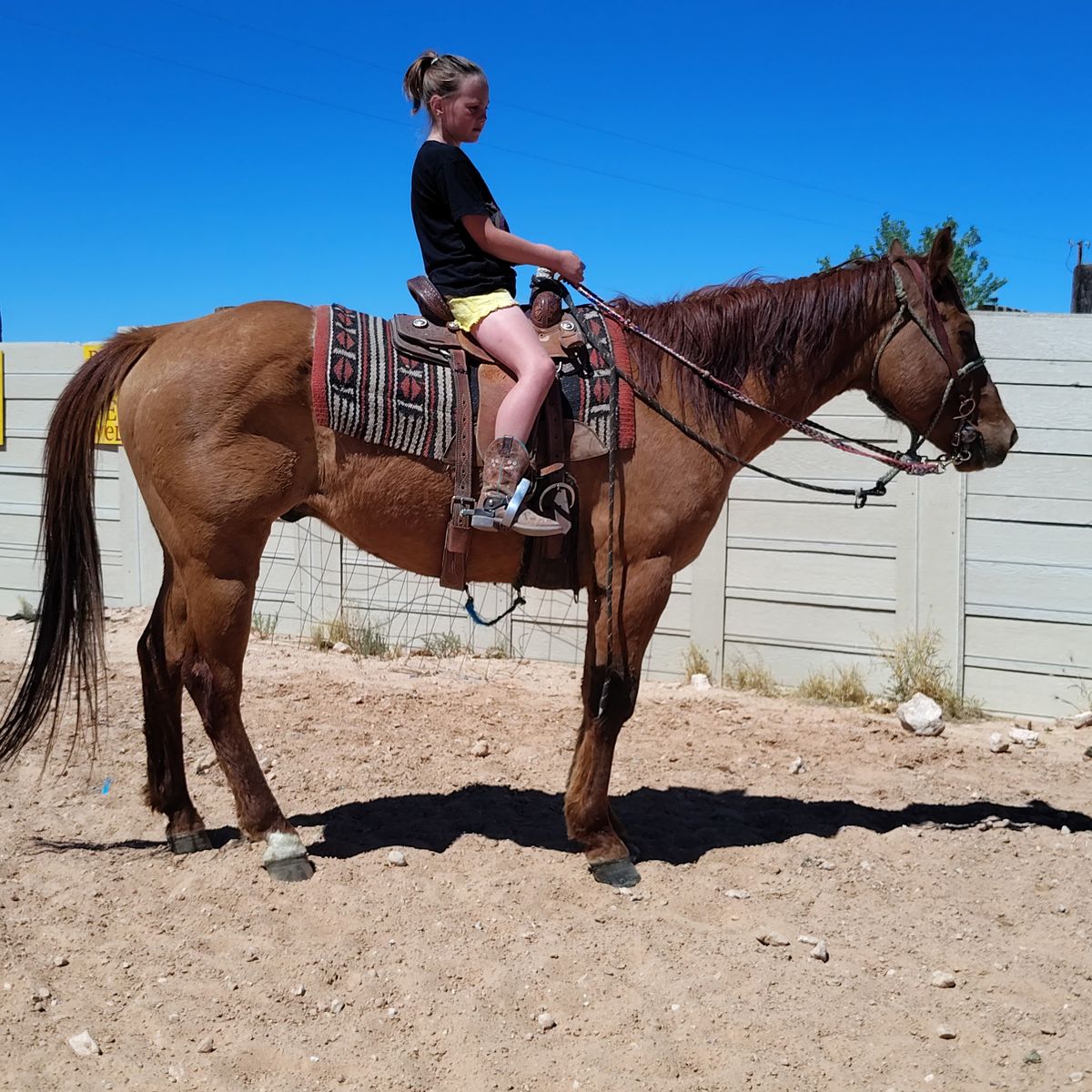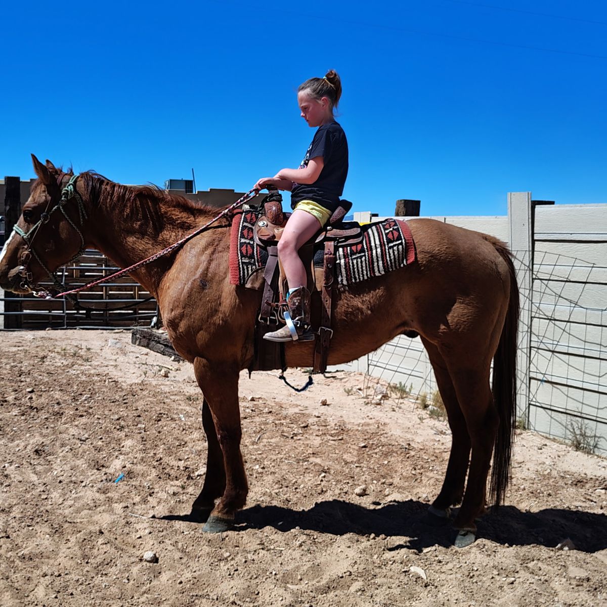 Cooper" is a great addition to any family or lesson program. He has served his time as a ranch gelding. He knows all aspects of a working cattle ranch from gathering , sorting, doctoring cattle to all day rides checking cattle and fences. He is SOLID , SAFE and SANE, he has been an asset to the ranch all his life but it is time for him to have a more laid back life doing other things. He has taught his share of little ones the ropes and now its his turn to teach yours.. he is GENTLE, SAFE and easy going. moves into his leads with ease W\T\L. has a Great WHOA and solid neck rein for easy steering. he will side pass to open gates, take a rope off a cow or just because you want to. he is Excellent for the farrier, quiet for annual vet work ups. He is a gentlemen to load, haul and Stands tied without pawing. He is Great to ride alone or in a group. He is safe enough to turn the kids loose and not have to worry about nonsense. He is savvy with water crossing, logs, timbers, thick brush and working dogs. He is Great to Saddle and Bridle. Stands for mounting and dismounting you can even use a Mounting block or a rock or?