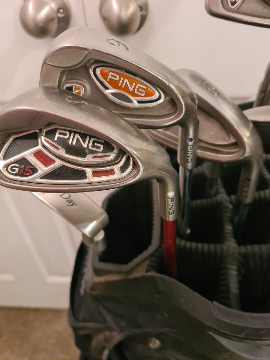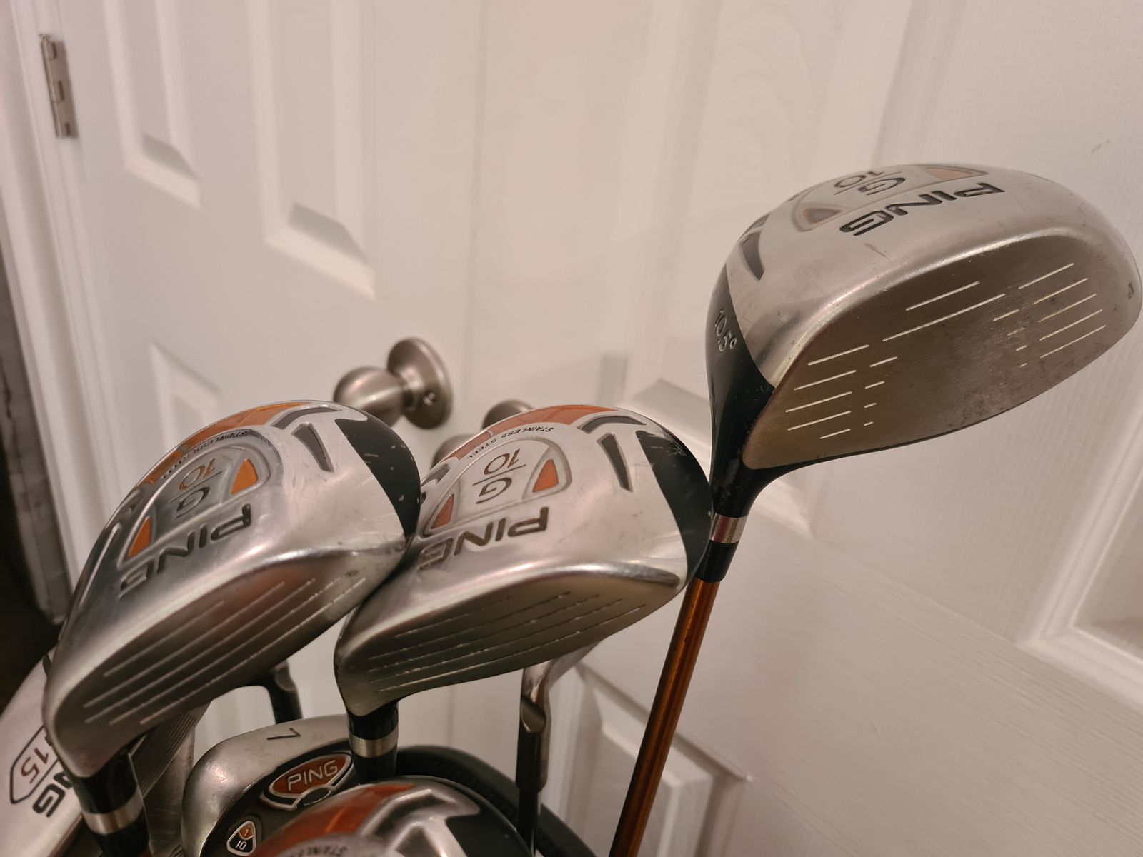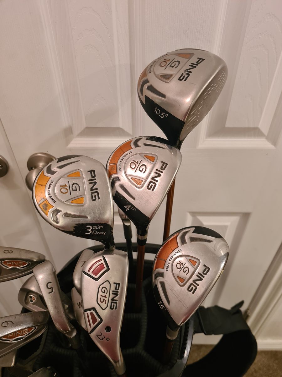 VenmoNice PING G10 golf club set. Right hand. Regular flex composite shafts. Irons are black dots. Includes 10.5 Driver, 3 & 4 woods, 15 degree G10 and 23 degree G15 Hybrid, 4-9P irons, G15 S wedge, & Karsten putter. Includes Sun Mountain stand bag.