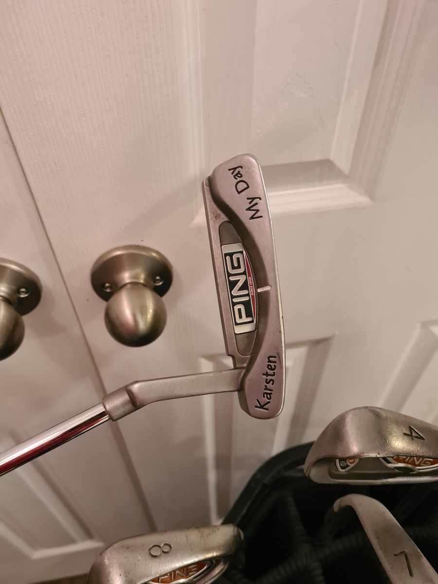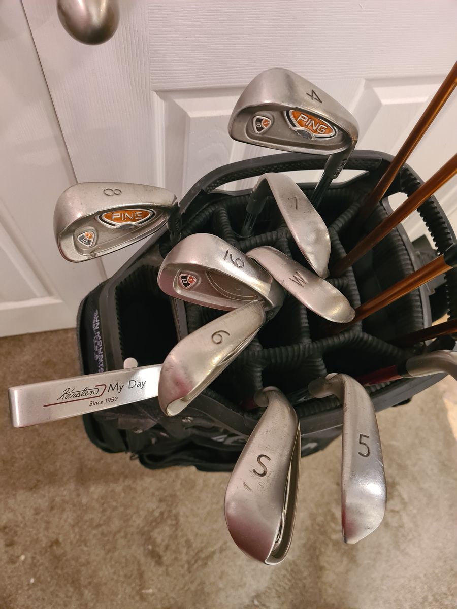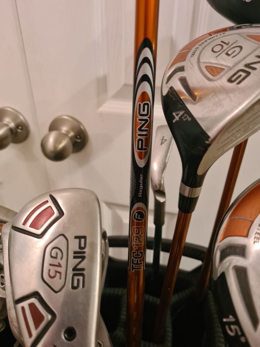 VenmoNice PING G10 golf club set. Right hand. Regular flex composite shafts. Irons are black dots. Includes 10.5 Driver, 3 & 4 woods, 15 degree G10 and 23 degree G15 Hybrid, 4-9P irons, G15 S wedge, & Karsten putter. Includes Sun Mountain stand bag.
