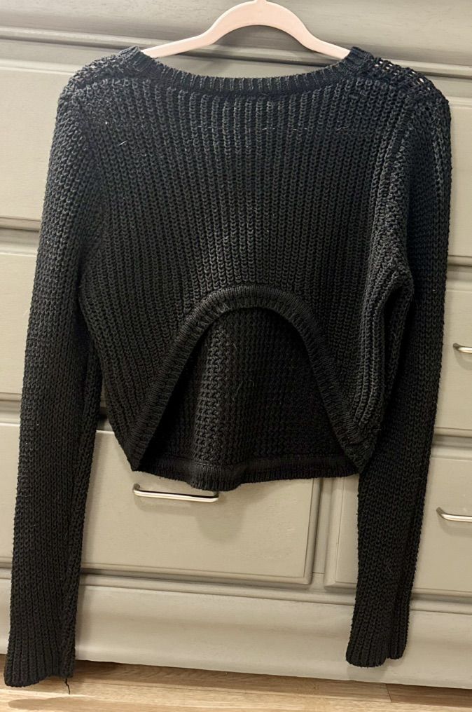 ApplePayChic black cropped knitted sweater, perfect for layering. Size S/M, gently used, excellent condition. The cropped fit is great for a modern look in fall and winter. Open back