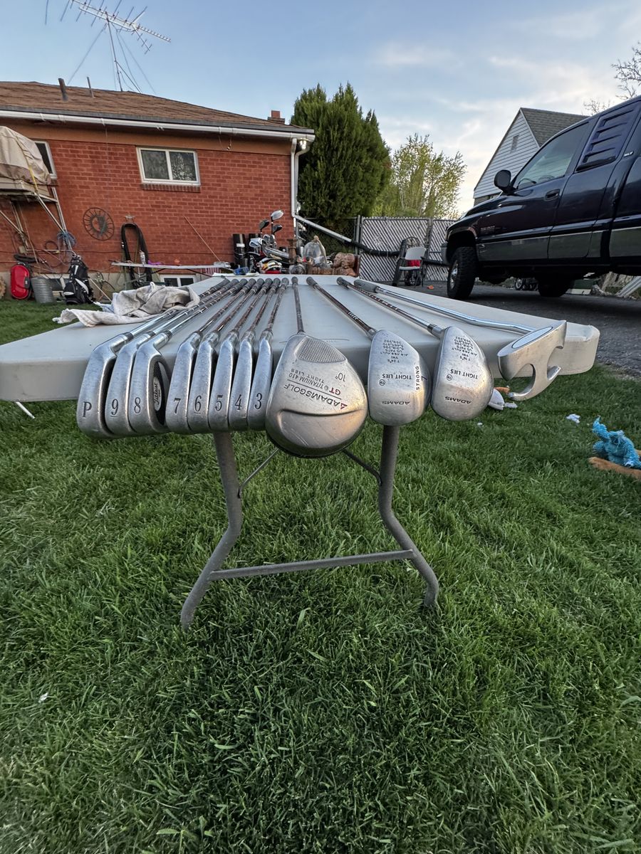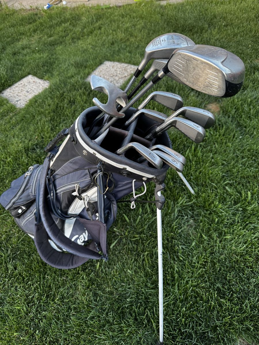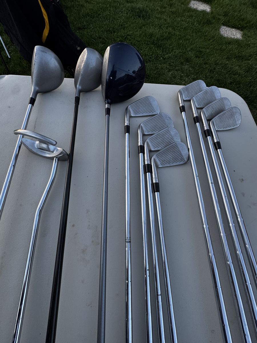 Irons: 3-40", 4-39.5", 5-39", 6-38.5", 7-38, 8-37.5", 9-37", P-35", and Icon putter-36". Includes a 6-way Taylotmade bag with stand, 5 pockets, shoulder strap, and rain cover.