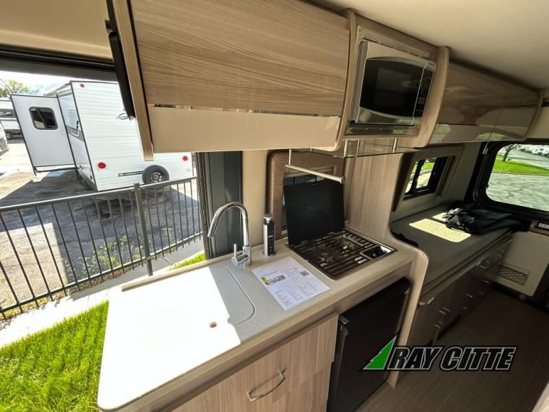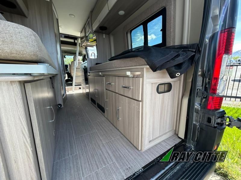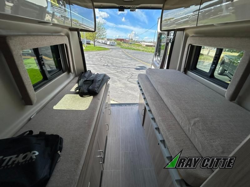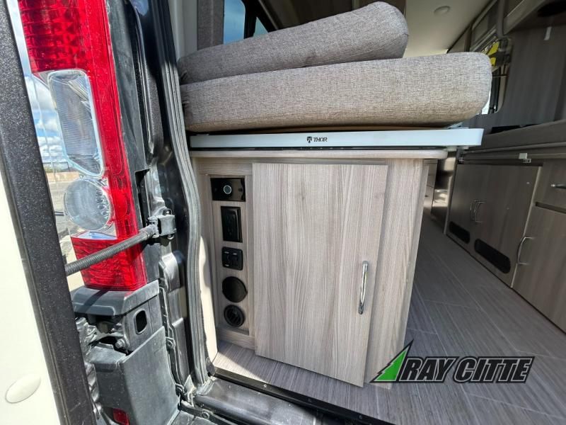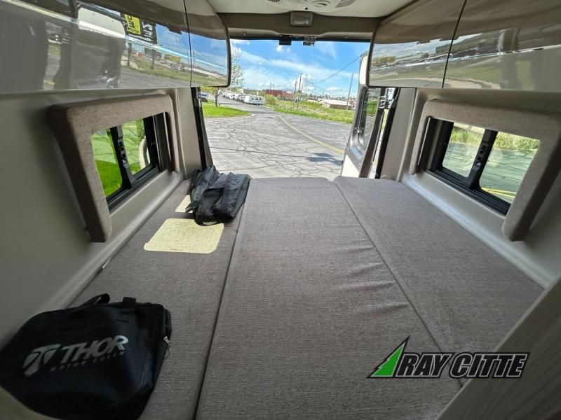 Each one of these Thor Motor Coach Sequence Class B gas motorhomes are built with a RAM Promaster 3500 XT window van chassis and powered by a fuel-efficient V-6 engine for an easy drive, economical explorer van! Their internal storage capacity is increased by the driveshaft not running to the rear making it possible for the holding tanks, electrical components, and LP systems hidden underneath. They are Thule equipped with a roof ladder to view your destination in a different perspective, a bike rack for two adult bikes, and a lateral arm patio awning with integrated LED lighting. Modern living and convenience is what you will find throughout the interiors with a premium 7-inch touchscreen dash radio, Apple Car Play and Android Auto that connects your favorite music and podcasts through USB or Bluetooth, and TecnoForm S.P.A. Euro-style cabinetry. Plus, there is residential vinyl flooring so you can bring your furry friend along and not worry about messes becoming stains!