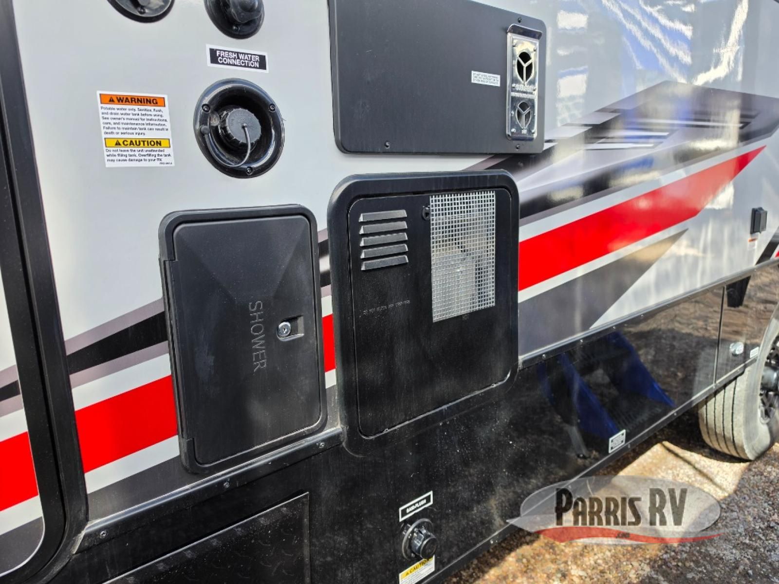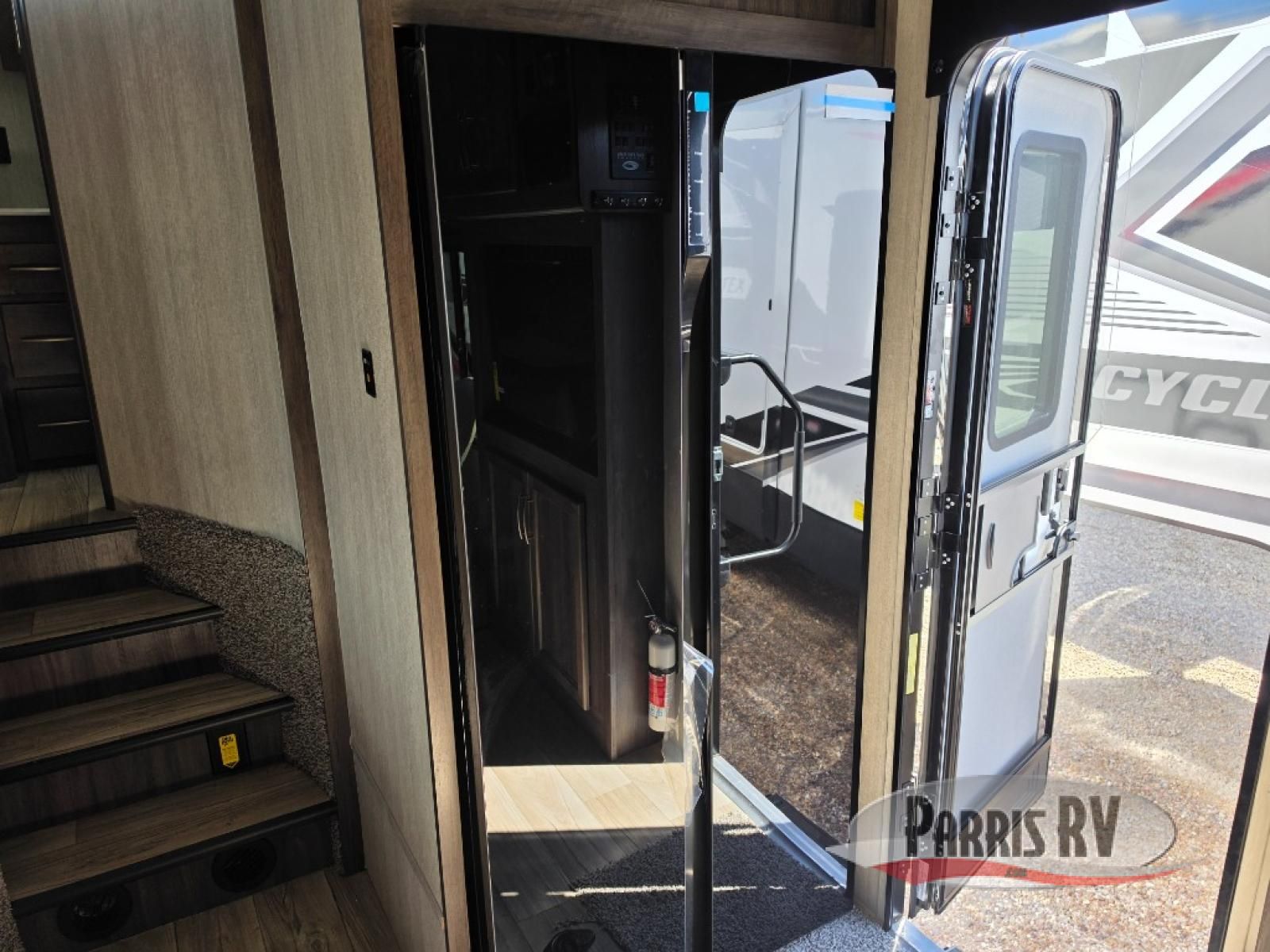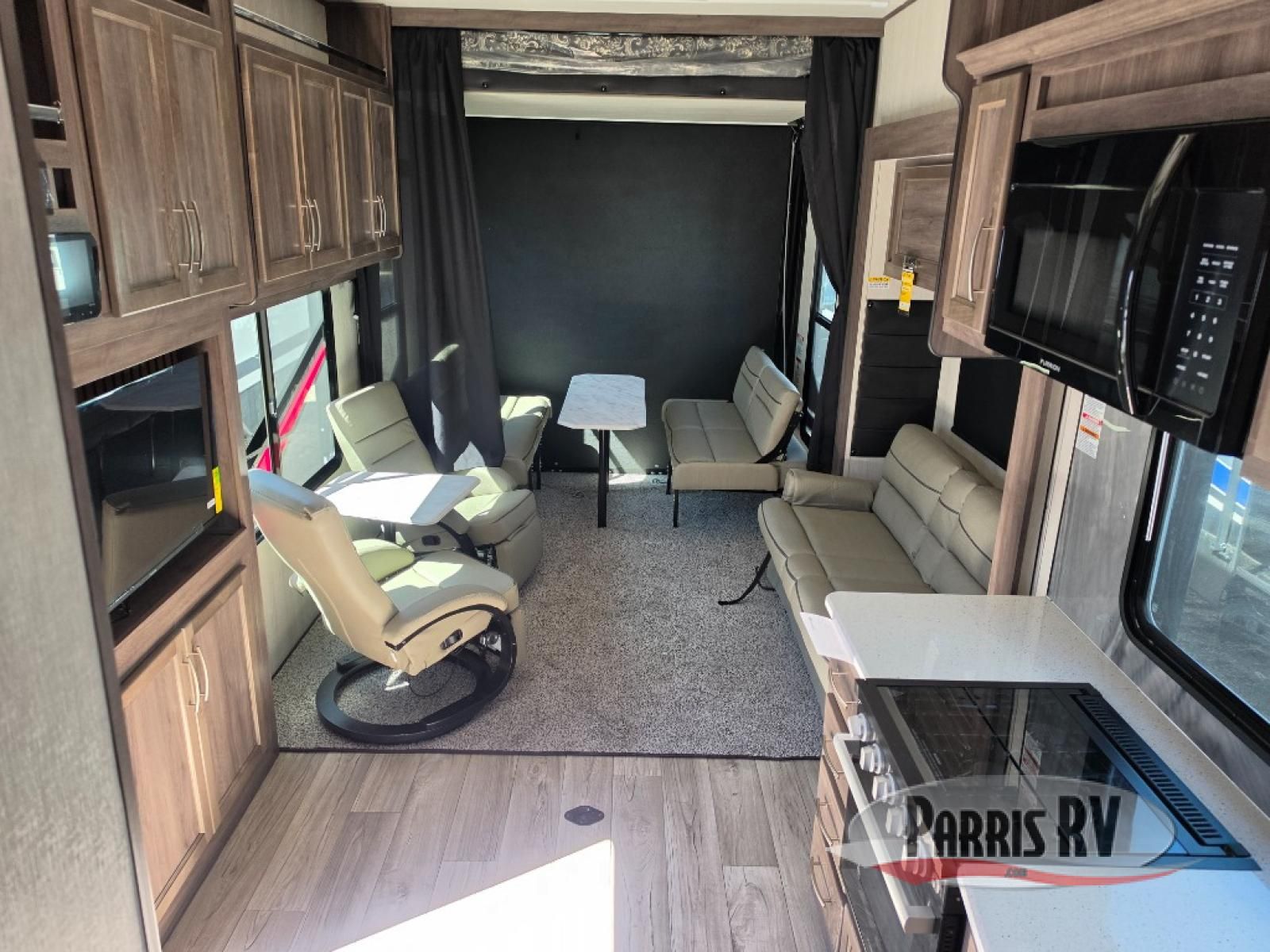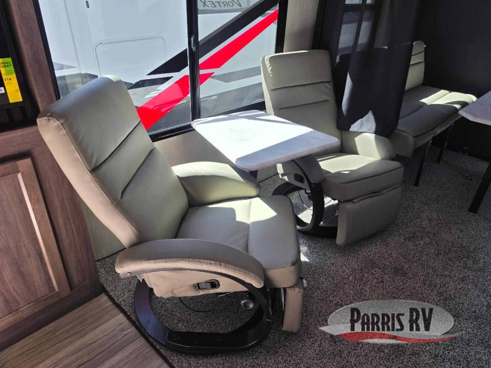 Sit back in one of the two lounge chairs on this Vortex toy hauler after exerting all of your energy out on the trails for the day! If you need to replenish your energy, grab some food from the 8-cubic foot refrigerator or heat up some leftovers in the XL residential microwave. The sofa table is good for eating meals or catching up with friends over dessert, and the full bathroom has a linen closet to store your towels. The private bedroom has a wardrobe slide to add space for moving about and storing your clothes, and you can also add another optional slide in the main living area.