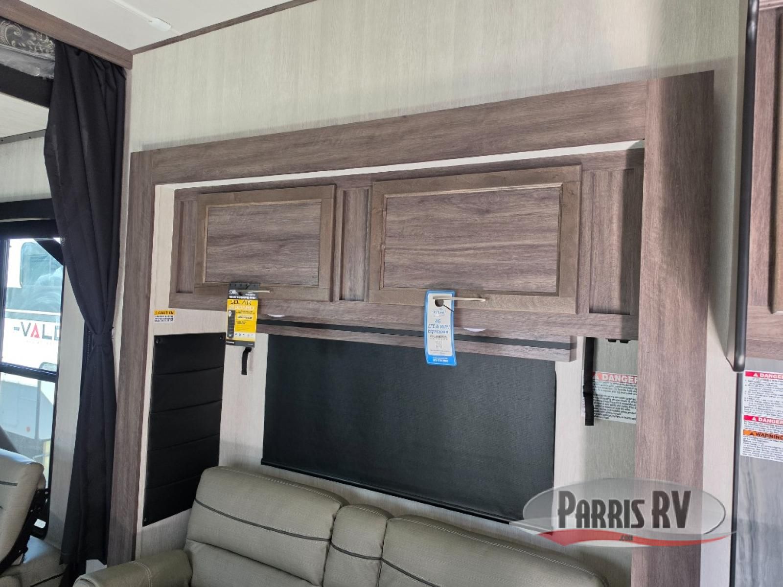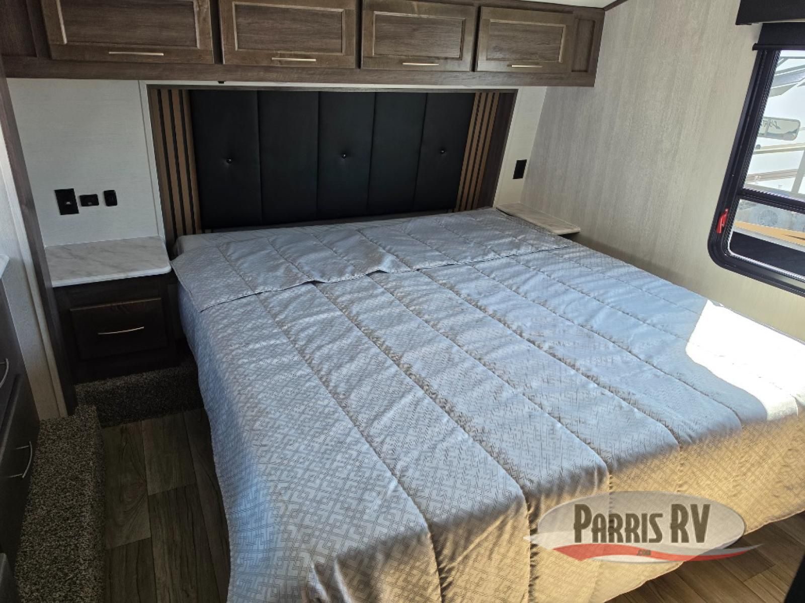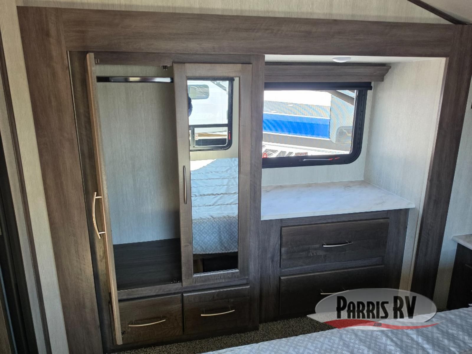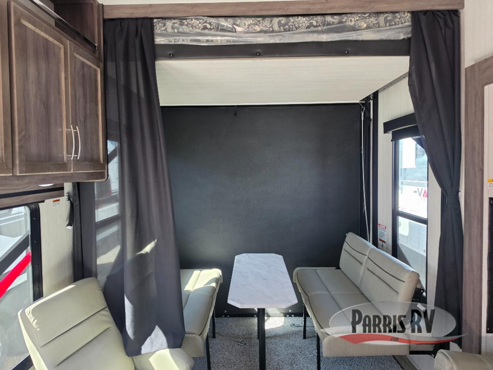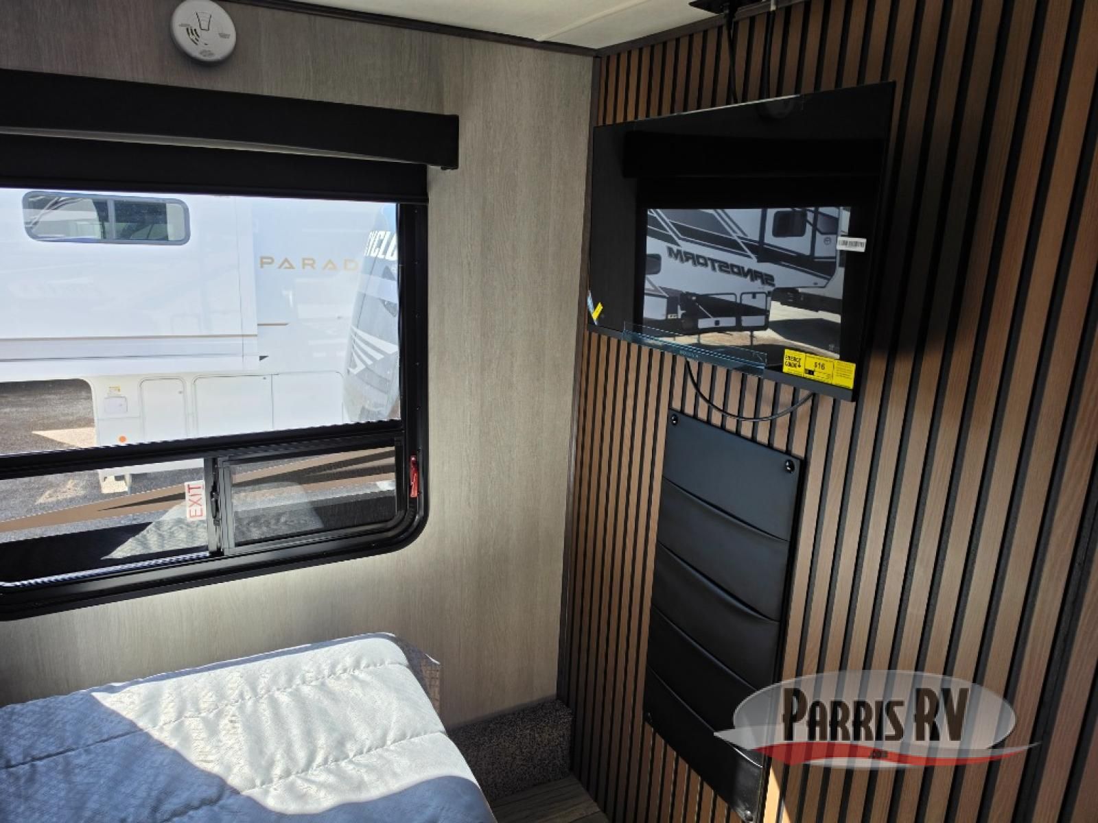 Sit back in one of the two lounge chairs on this Vortex toy hauler after exerting all of your energy out on the trails for the day! If you need to replenish your energy, grab some food from the 8-cubic foot refrigerator or heat up some leftovers in the XL residential microwave. The sofa table is good for eating meals or catching up with friends over dessert, and the full bathroom has a linen closet to store your towels. The private bedroom has a wardrobe slide to add space for moving about and storing your clothes, and you can also add another optional slide in the main living area.