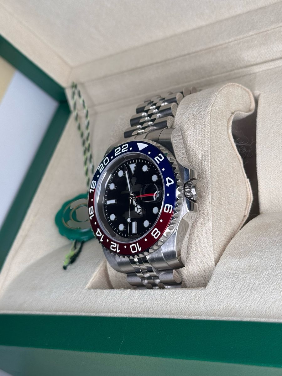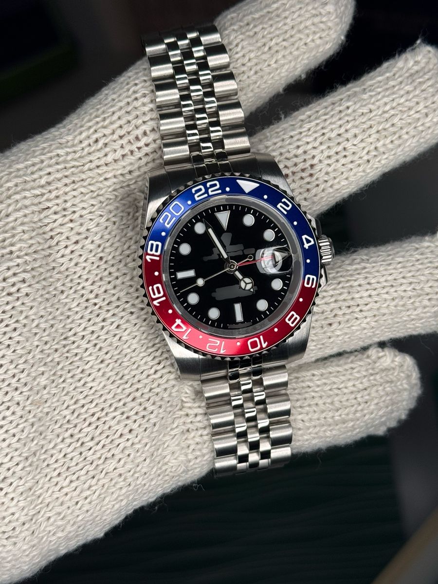 Luxury, elegant silver watch featuring a bold blue and red bezel, a perfect mix of sophistication and sporty style that instantly stands out. Designed to turn heads whether you’re on a date or in a business setting.