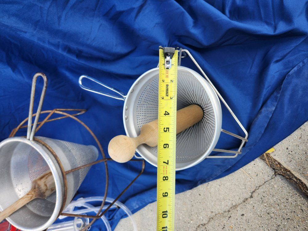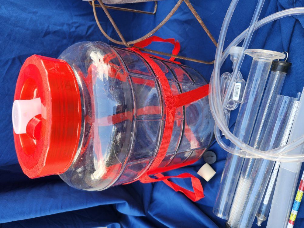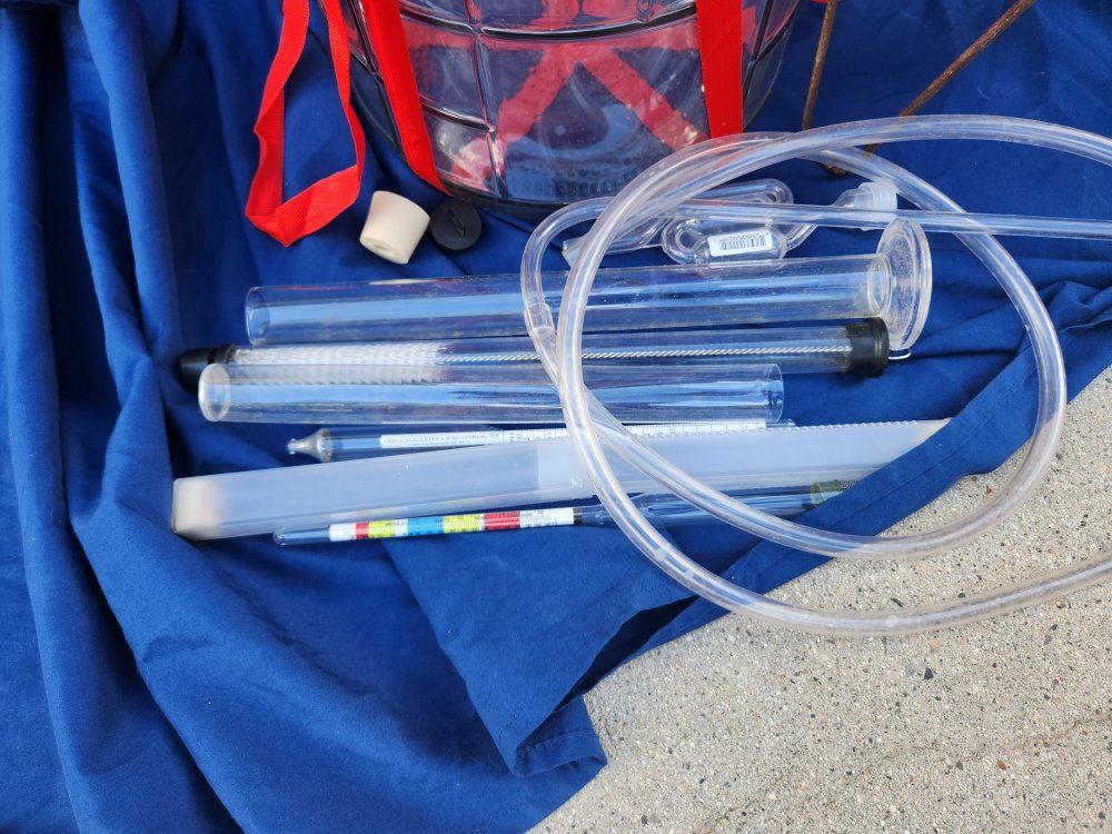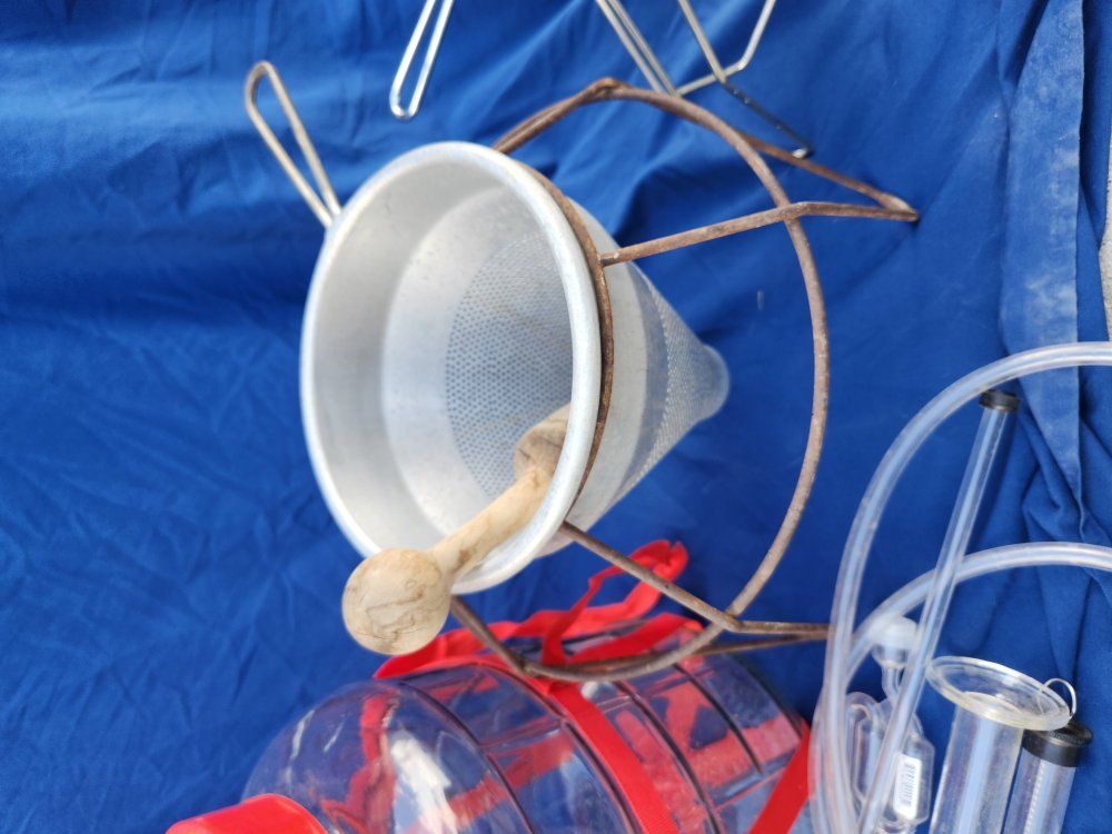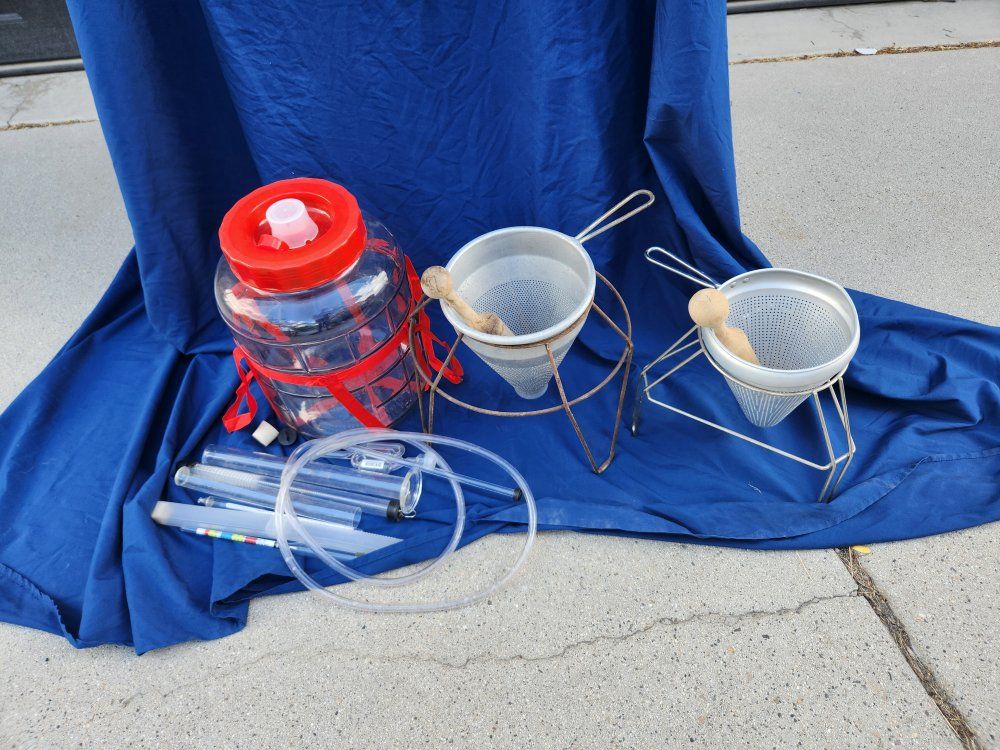 carboy, strainers, assorted beer and wine making supplies.