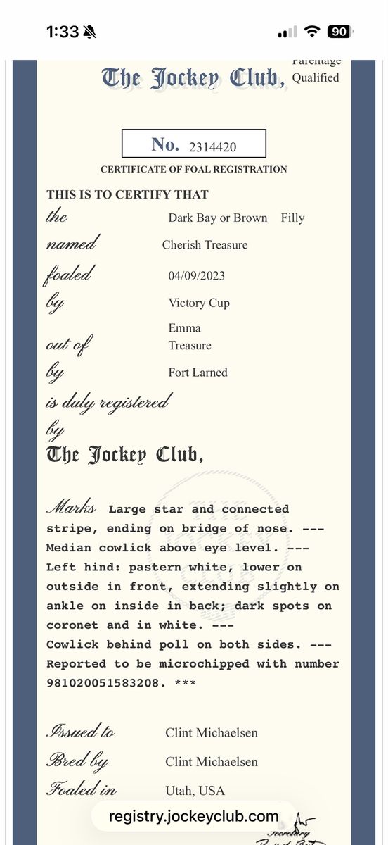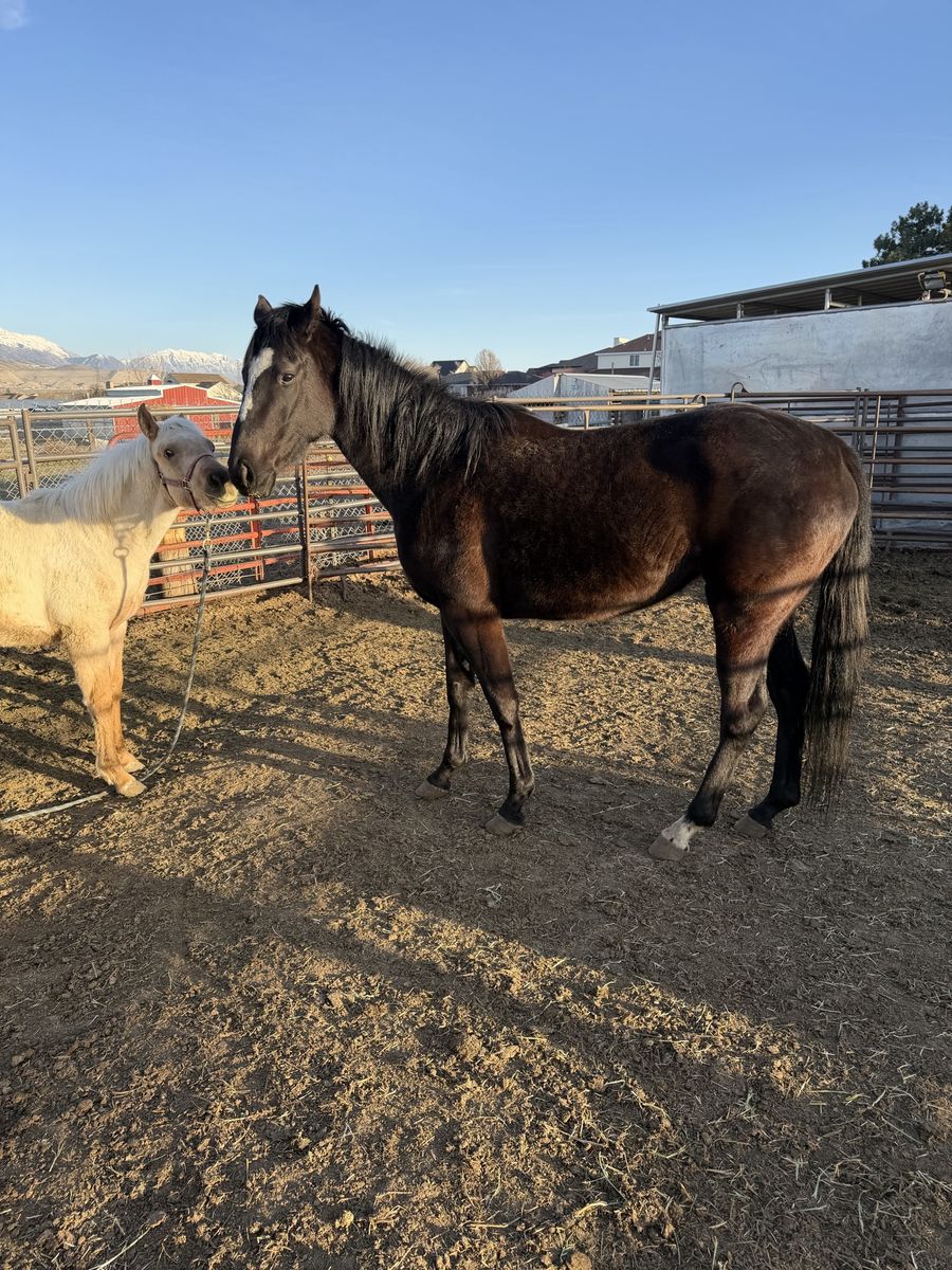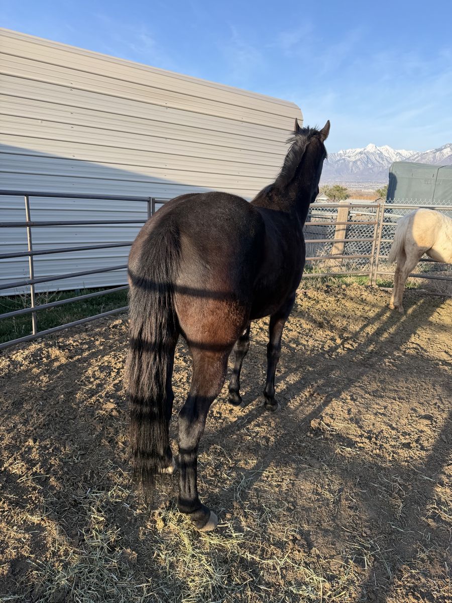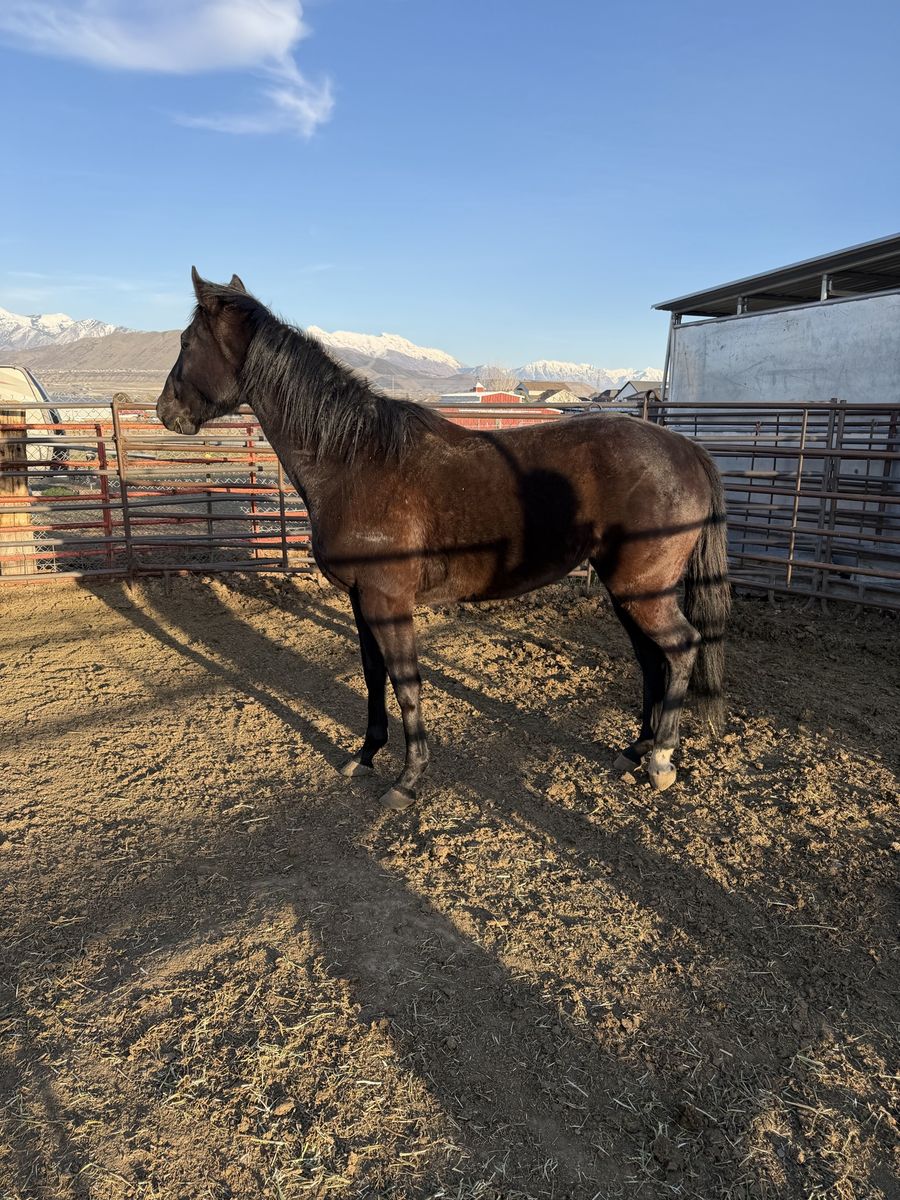 Dark brown almost black jockey club registered Thoroughbred mare. 3 yr old. Gentle and easy to handle. Ran last year on the track but has been turned out since last fall. I was going to breed her but have decided to not add any TB to our breeding program. Would make an excellent barrel horse or English discipline or pleasure horse with her calm disposition. Current on worming. Feet trimmed a month ago. Loads easy. Standing approx 15.2 but may grow a little more. English riders take note on this nice filly. Priced to sell at $2500. Text 801-631-6085. Located in Bluffdale.