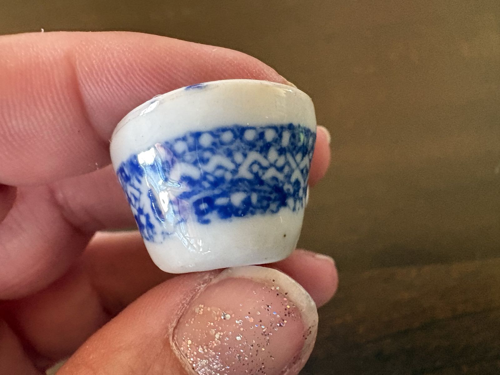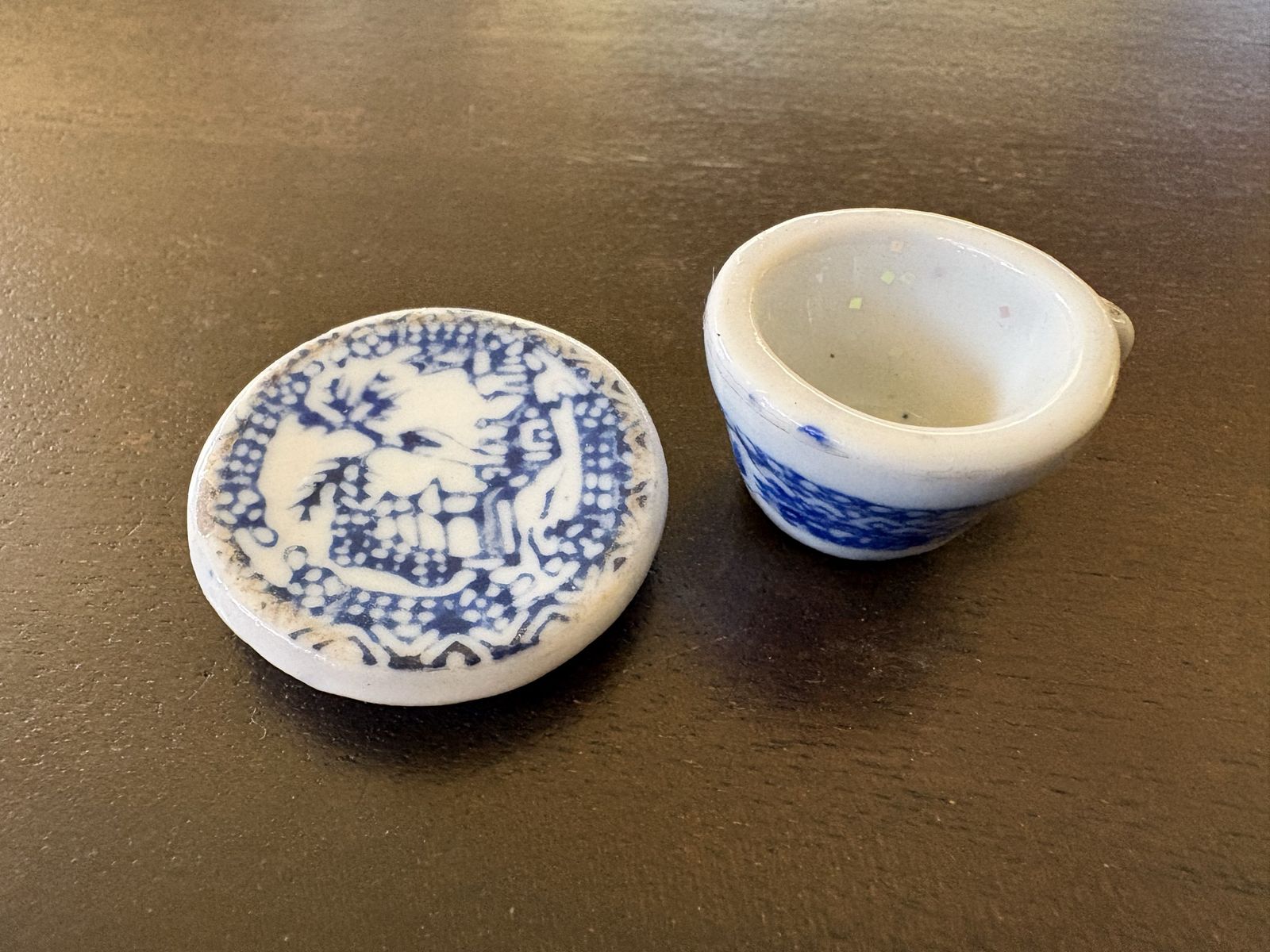 I have an old miniature teacup and saucer. It is blue and white porcelain or ceramic. The saucer is 1 3/8 inches across. The teacup is 3/4 inch tall. See my other ads for jewelry, artwork, home decor and more.