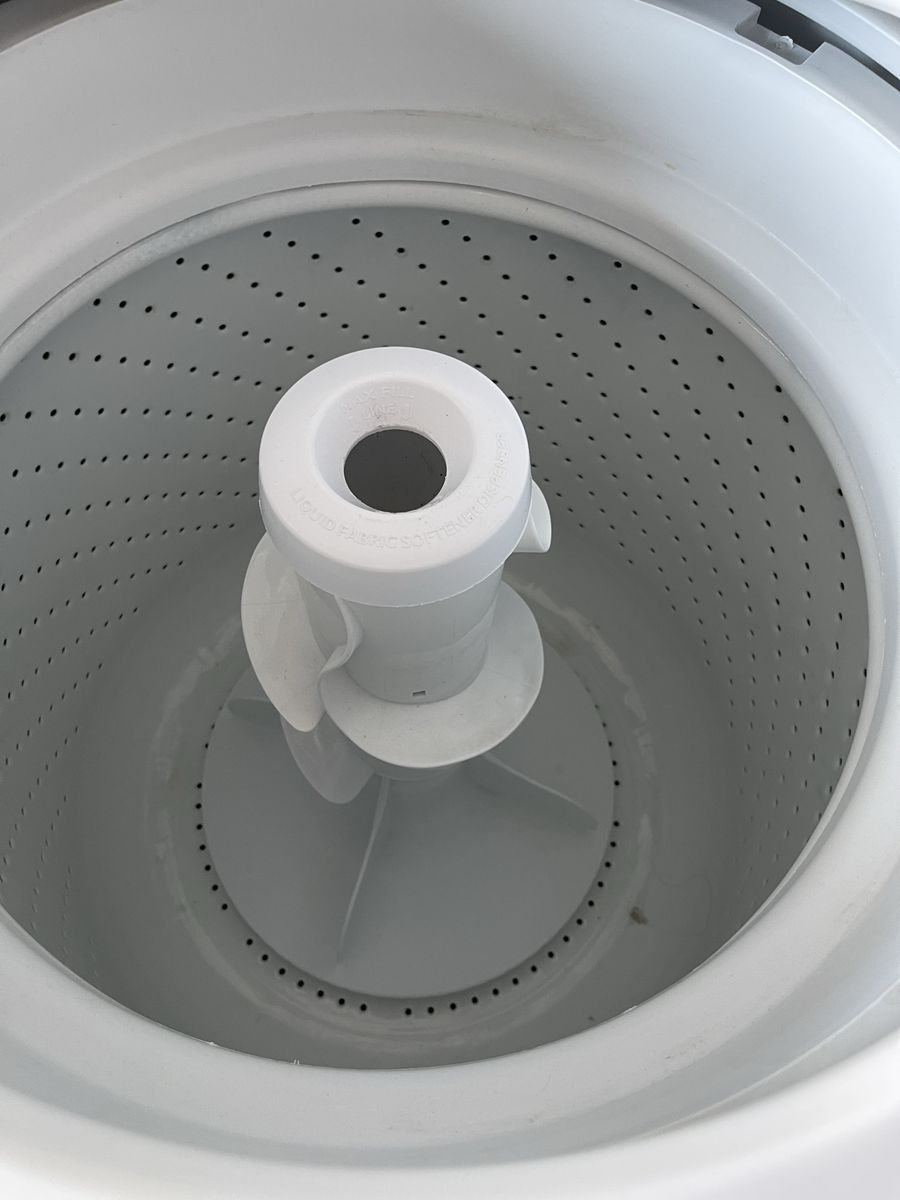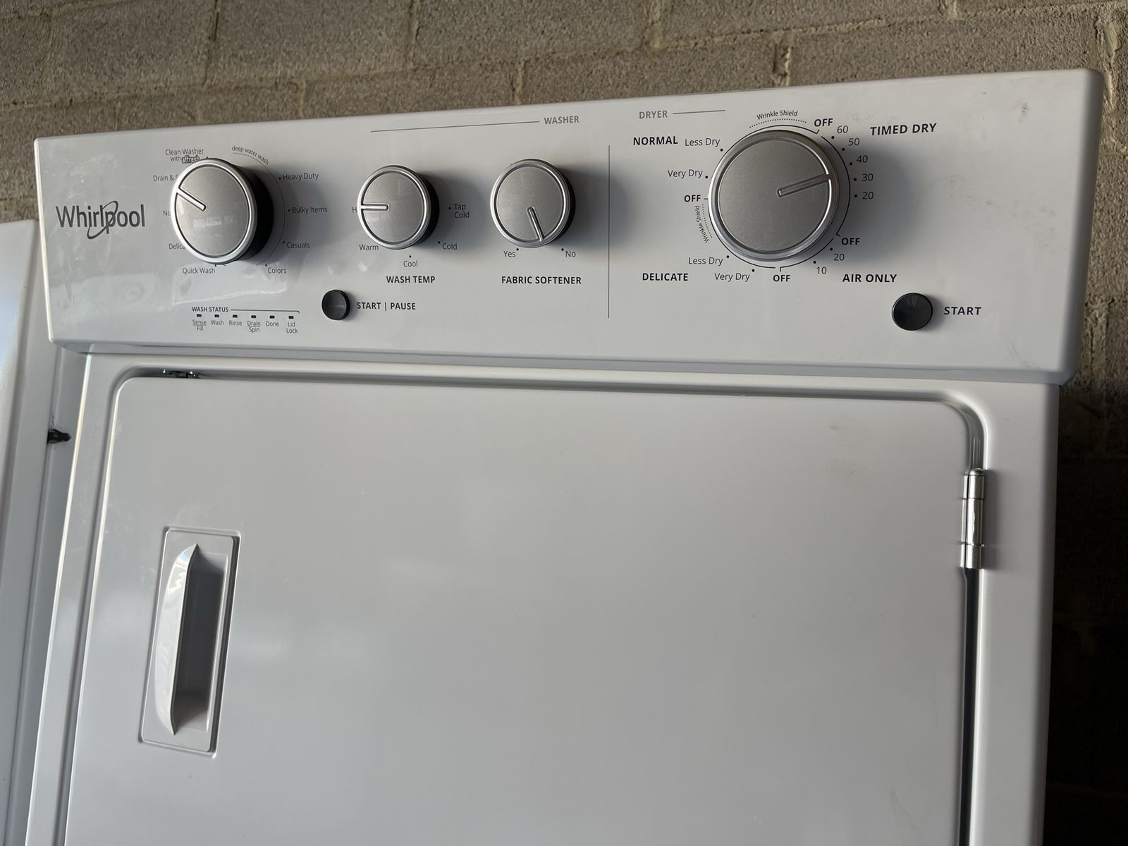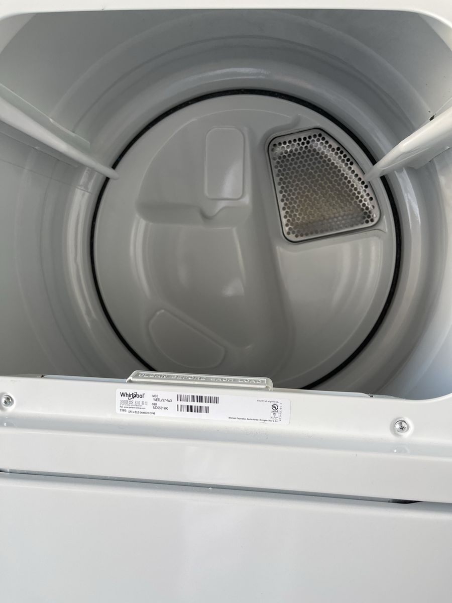 VenmoClean Whirlpool stacked washer and dryer unit. White color. Top-loading washer has an agitator and a liquid fabric softener dispenser. Dryer has timed dry and air only settings.