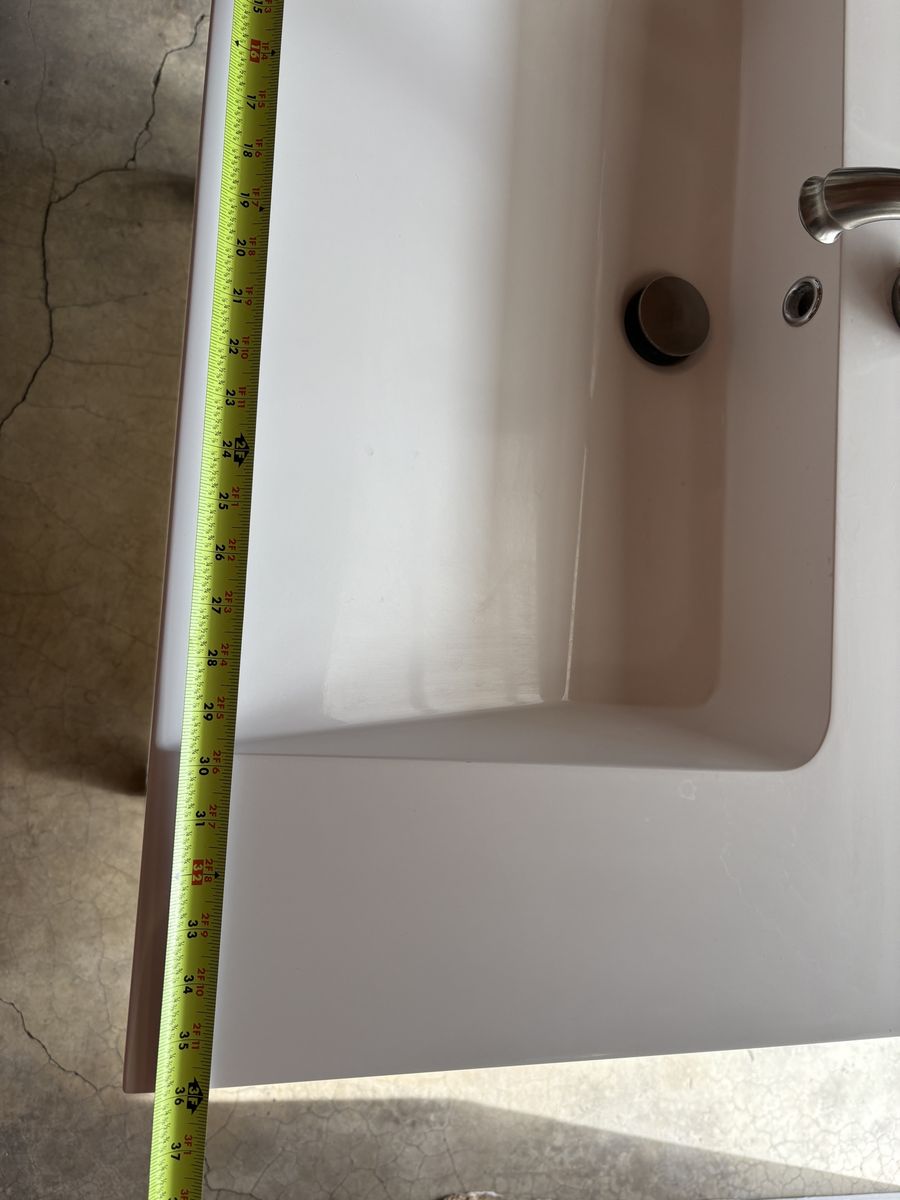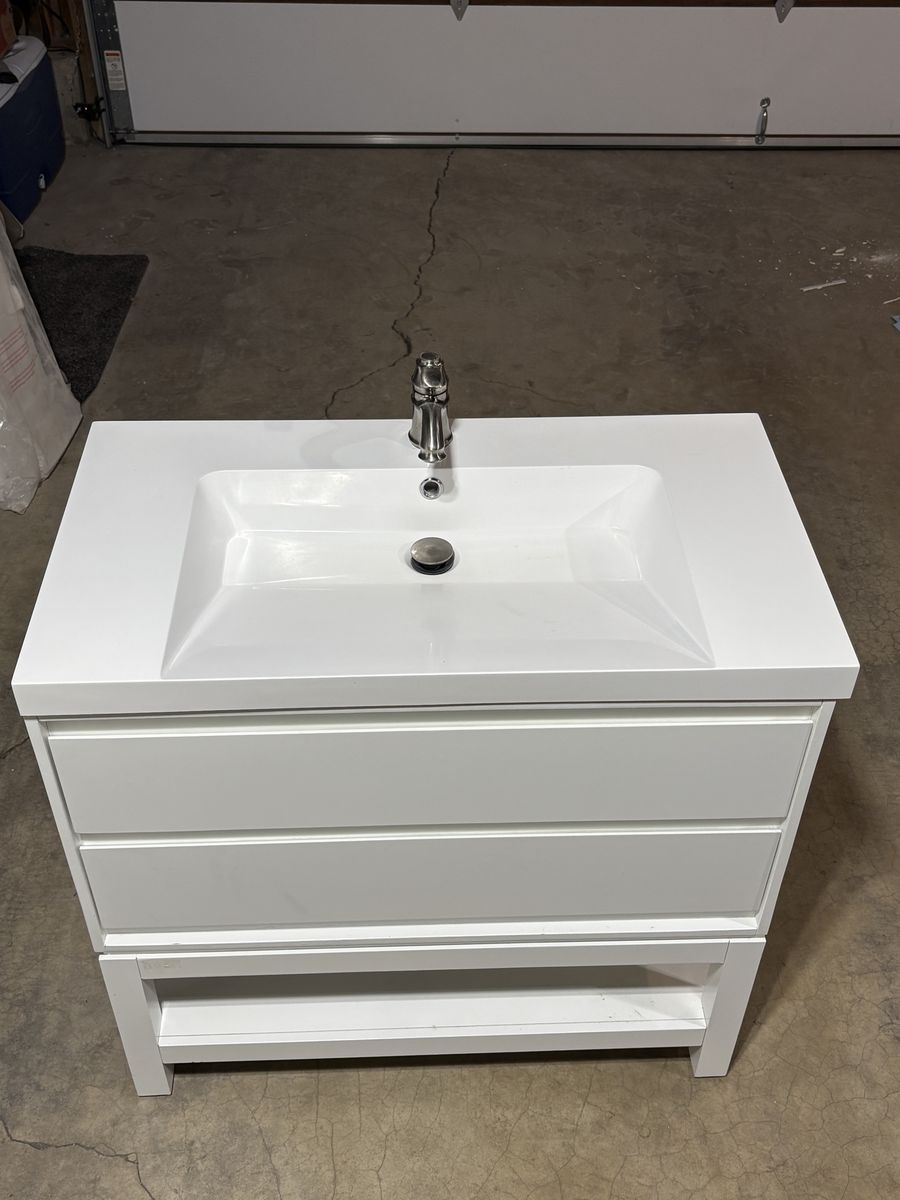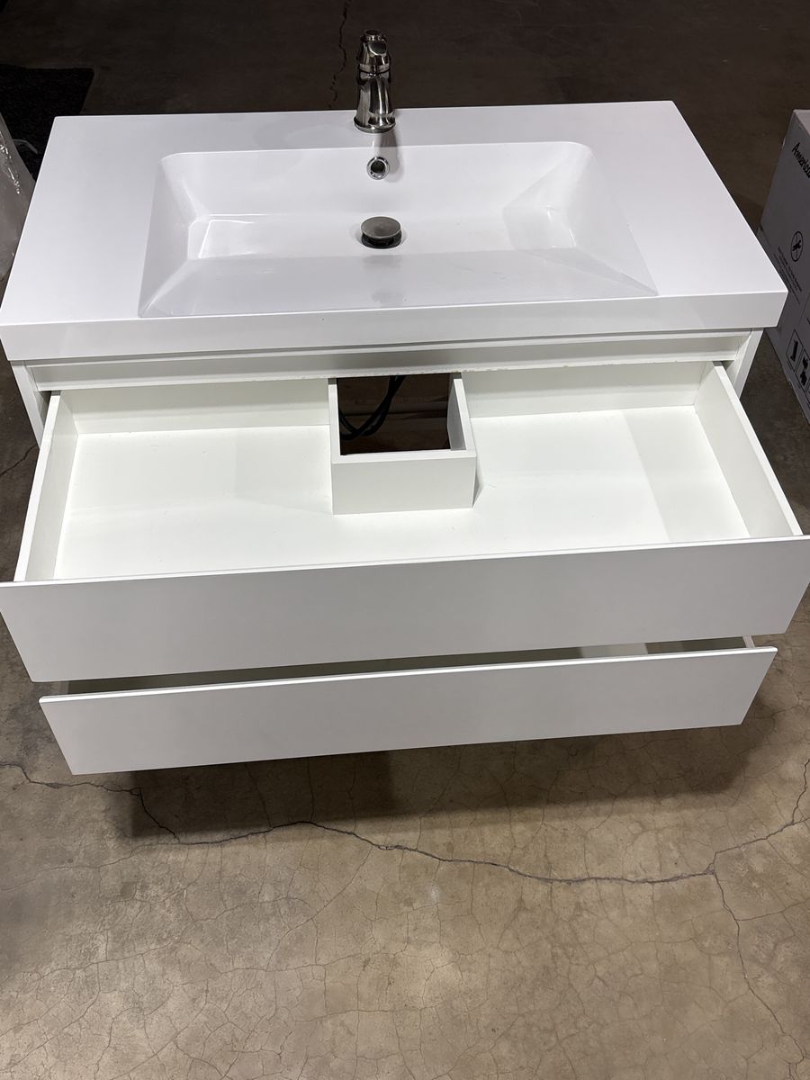 VenmoWhite vanity with sloped sink. 36 inches wide. Soft close drawers. Has a bracket and base is removable if floating look is desired.