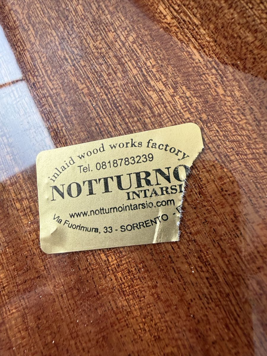 Notturno Intarsio is a renowned workshop in Sorrento, Italy, specializing in high-quality traditional inlaid wood (intarsio), producing items like music boxes, luxury game tables, and decorative plaques. Their products often feature detailed marquetry, including floral designs and scenic views, with many pieces designed for collectors.