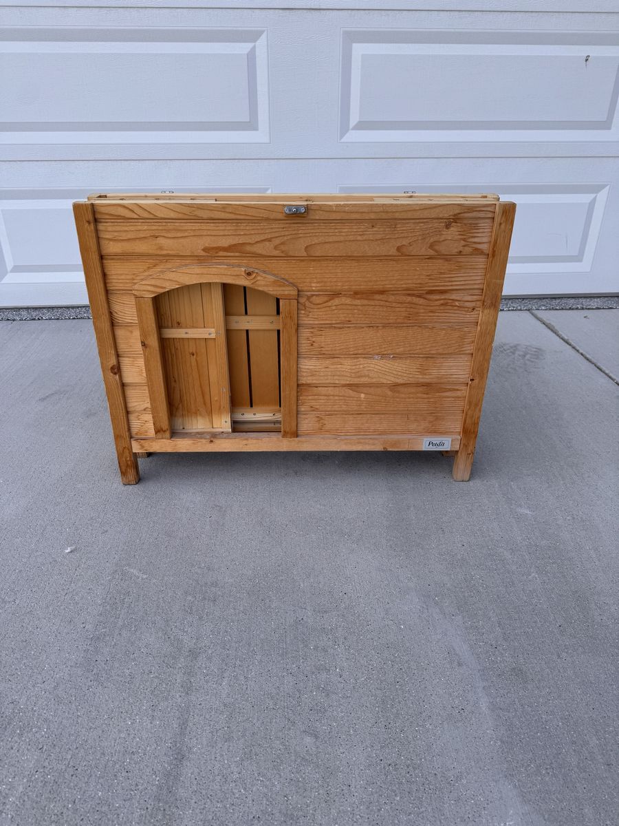 VenmoWood dog house for small dogs. Great condition. Folds up for storage. Works well for outdoors with a pad on the bottom. I put a heated pad in there in the winter and it worked great.