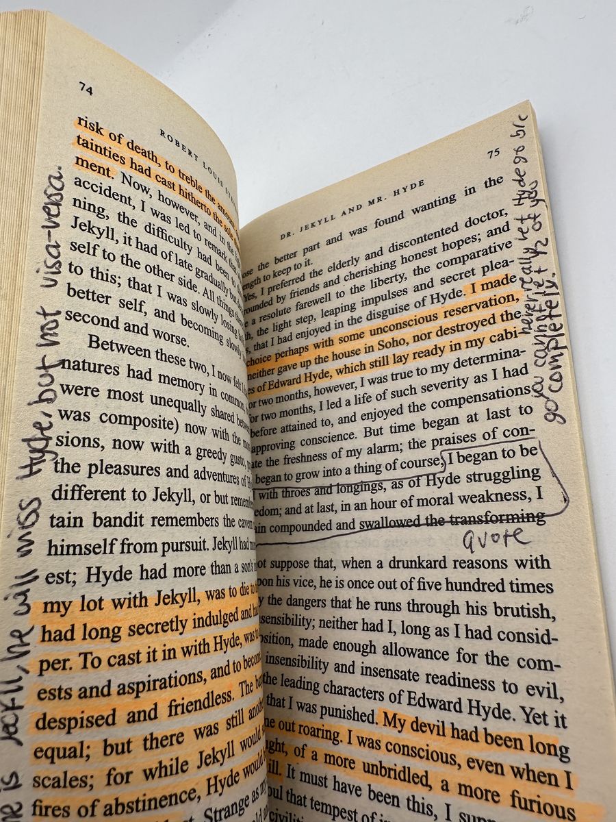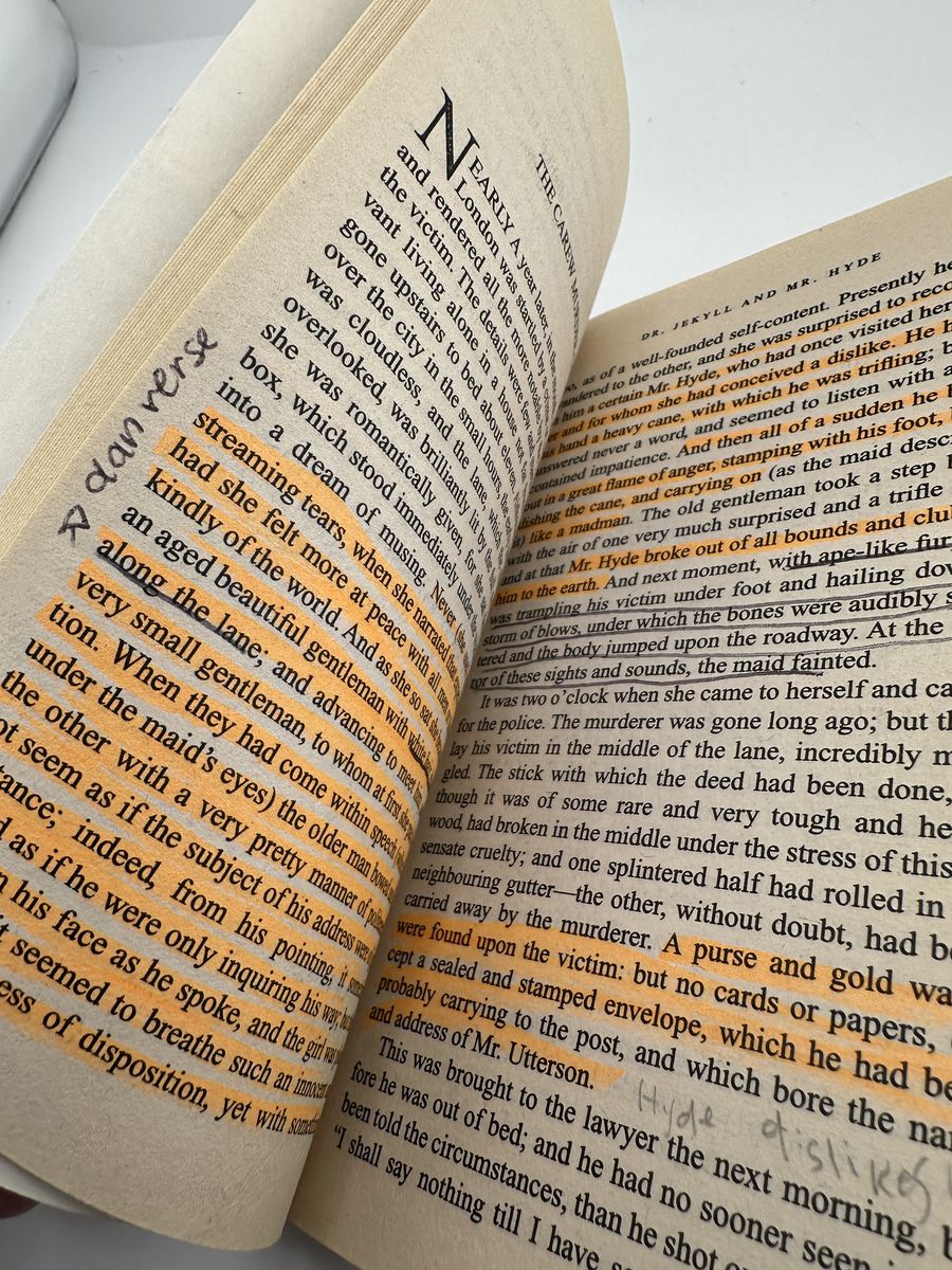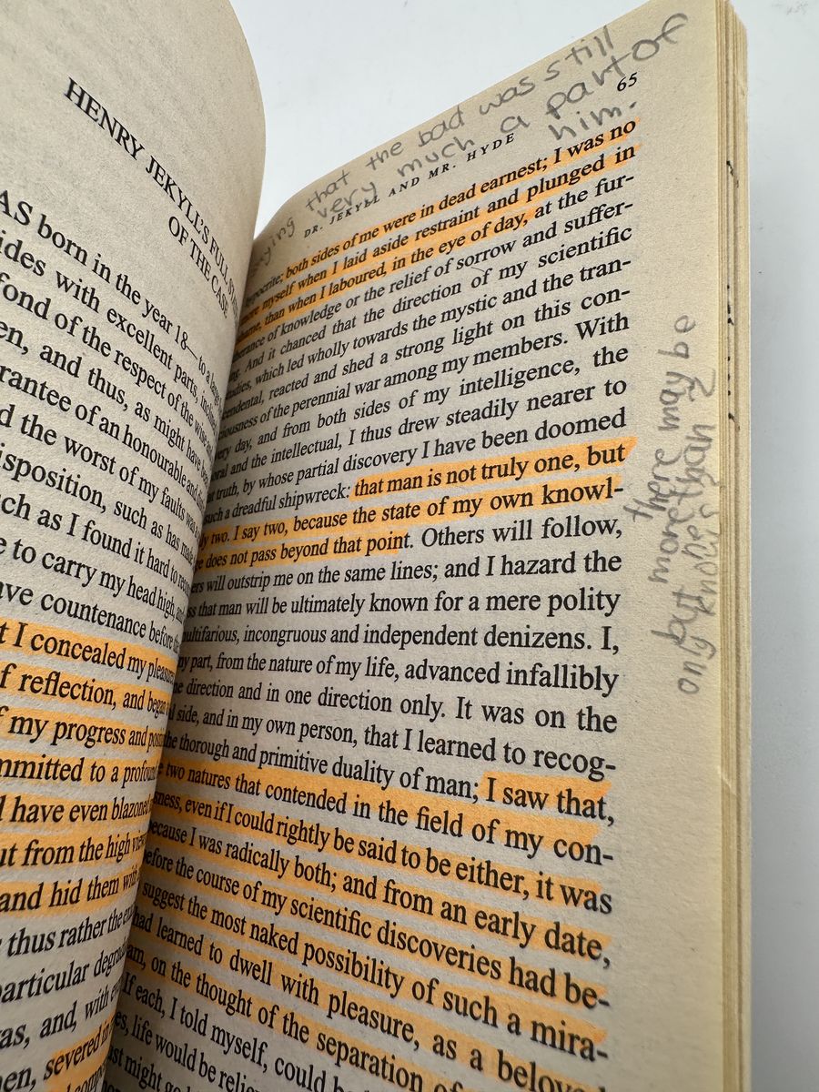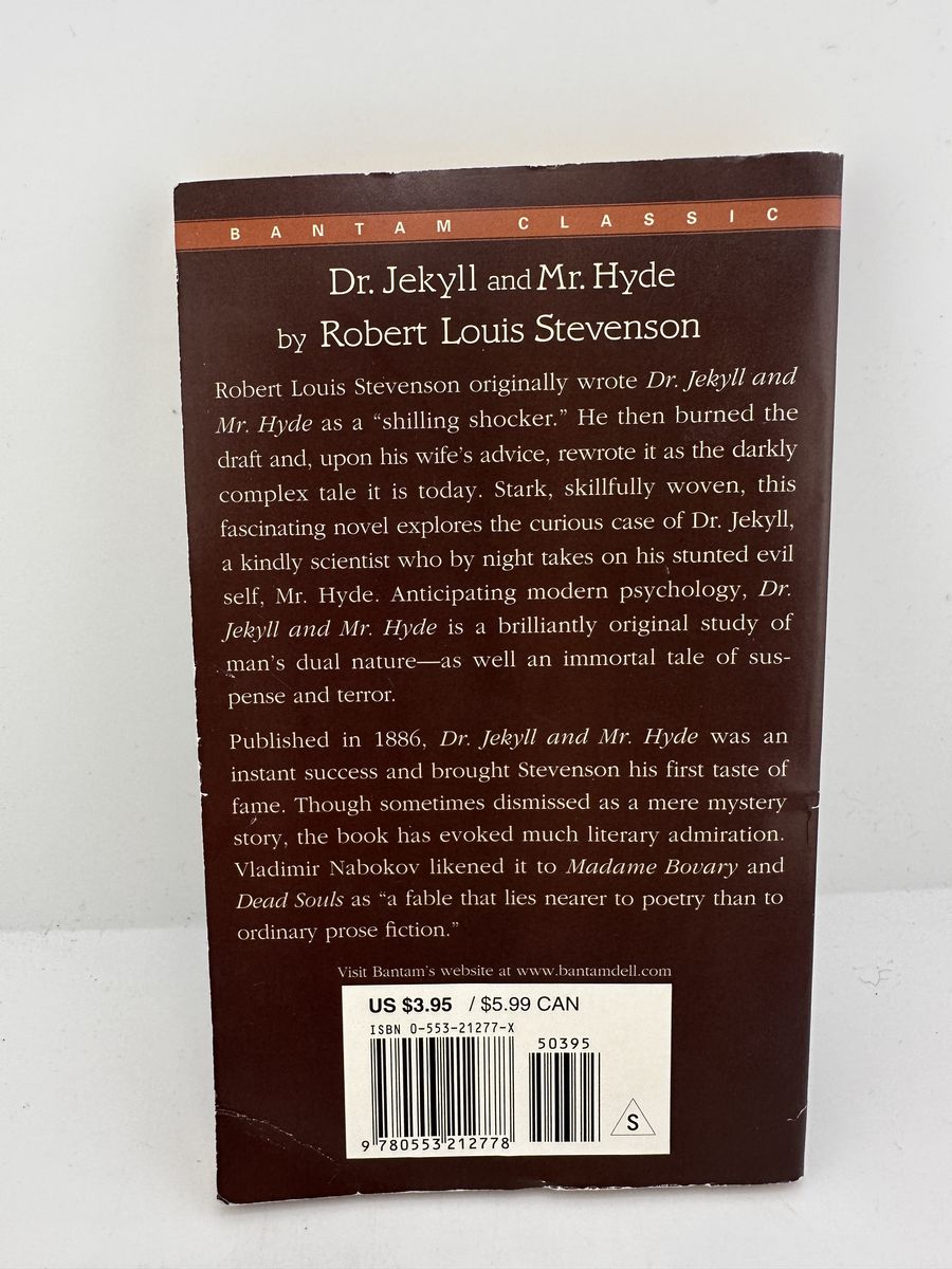 ApplePayVintage 1982 Bantam Classic mass market paperback of Dr. Jekyll and Mr. Hyde by Robert Louis Stevenson. ISBN 055321277X. Complete reading copy with cover wear, highlighting, and handwritten notes/annotations throughout. Great affordable copy for classroom, study, or personal reading.