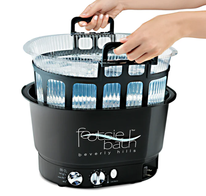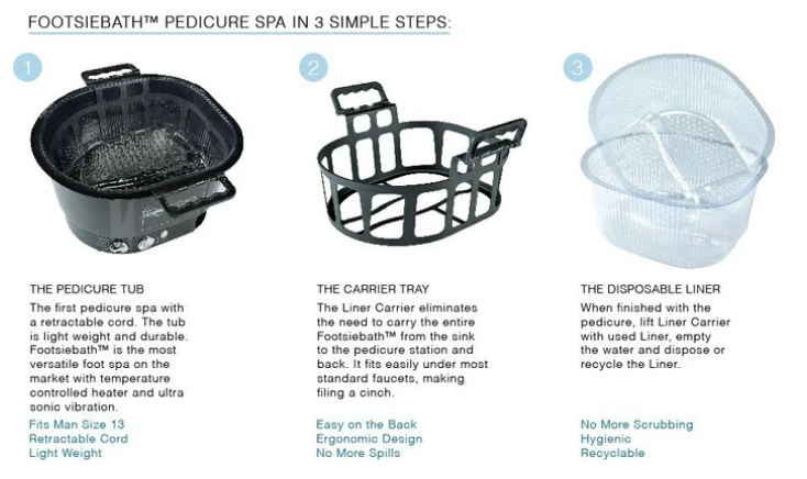 FootsieBath: Pedicure Spa and Disposable Liner System. FootsieBath is a versatile foot spa with relaxing heat and soothing vibration. Disposable liners are for one-time use and pre-fitted to the tub. The extra large bowl fits up to size 13 feet and is six inches deep, allowing enough room for a therapeutic soak and to easily wash away foot treatments without spilling over. Four settings allow customization of pedicures per client request. Retractable cord feature for added safety. Comes with ten EZ Access Trays