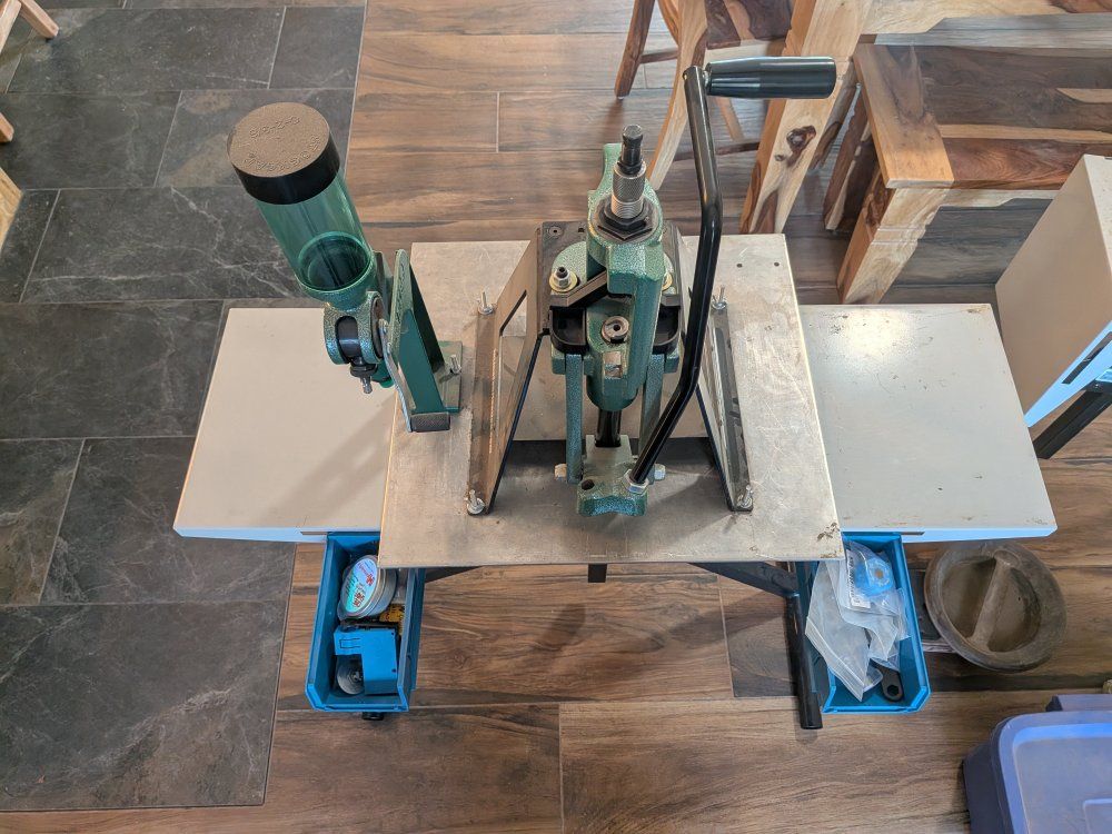 I have two of these. They have been very convenient to move my press to wherever I want to do my reloading. Table and blue accessory holders only. Press and accessories in the holders not included. I paid around $200 each on Amazon