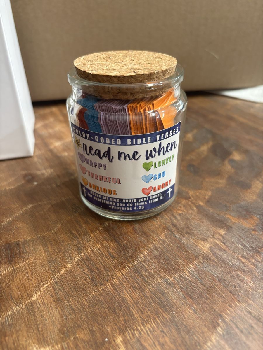 Venmo• Charming glass jar with cork lid packed with color-coded scripture cards — grab a verse based on how you’re feeling: happy, thankful, anxious, lonely, sad, or angry • Thoughtful daily devotional tool or meaningful gift for any faith-filled friend or family member • Brand new in original box — makes a perfect Mother’s Day or birthday gift!