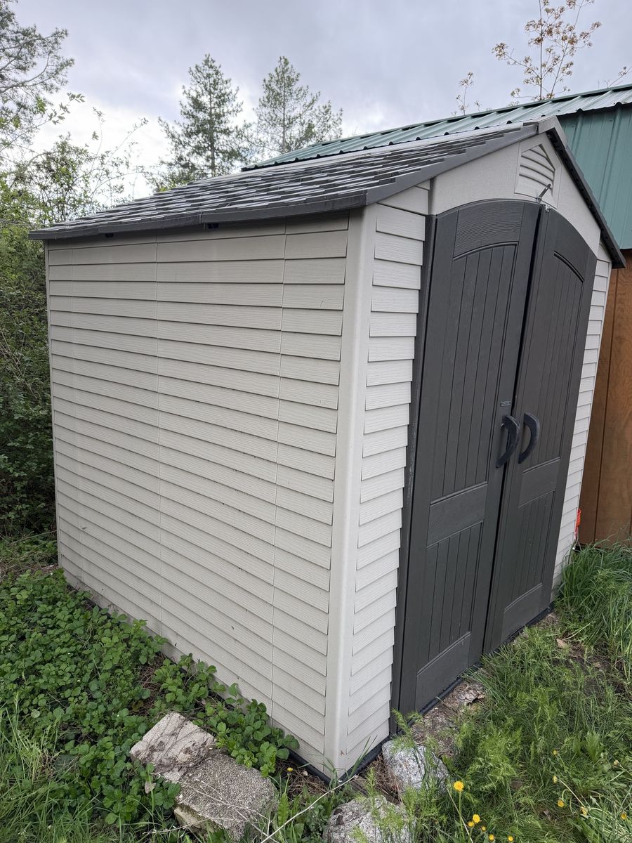 Lifetime shed. 82”x80”, door is 53” wide and 75” tall.