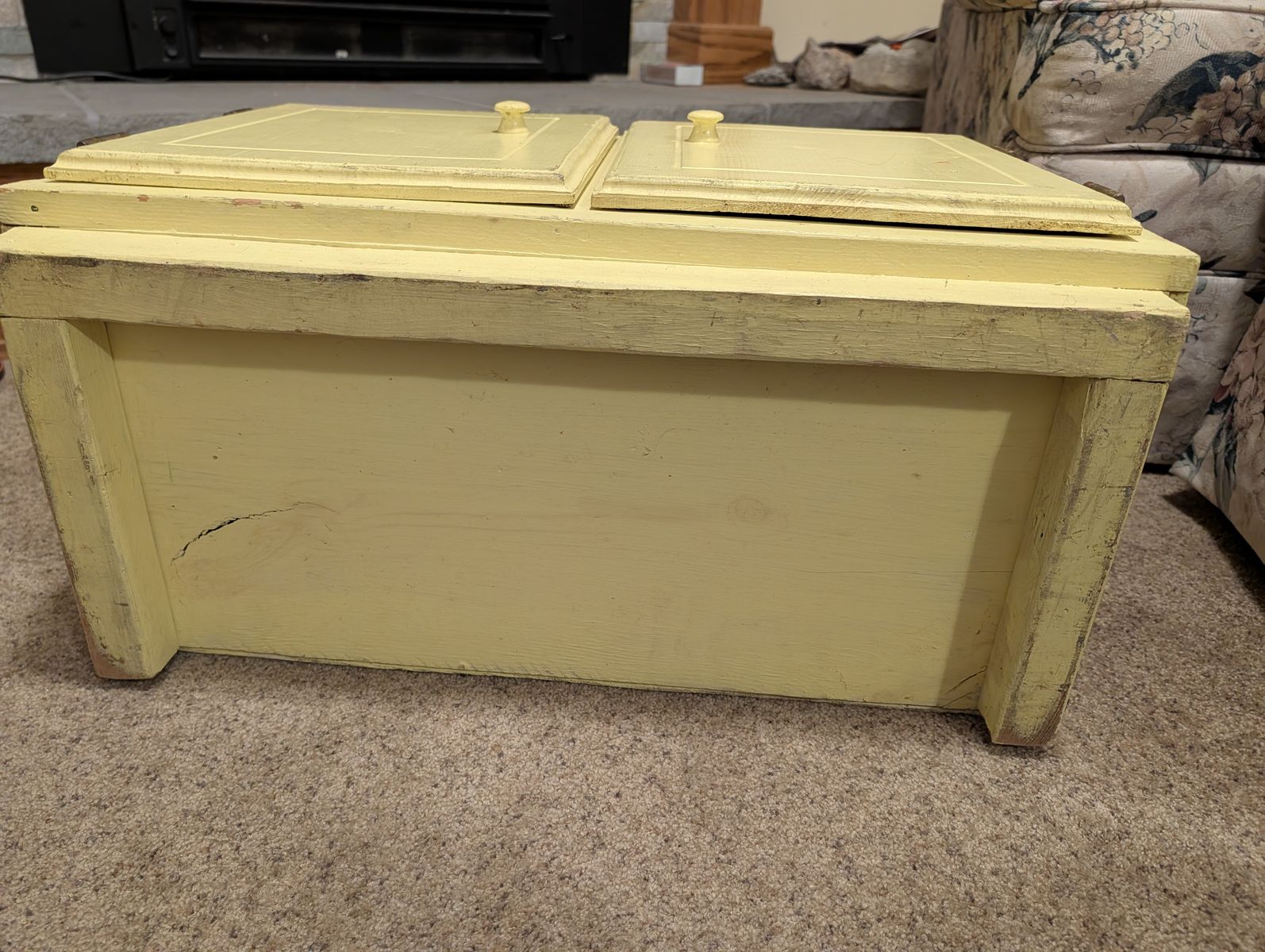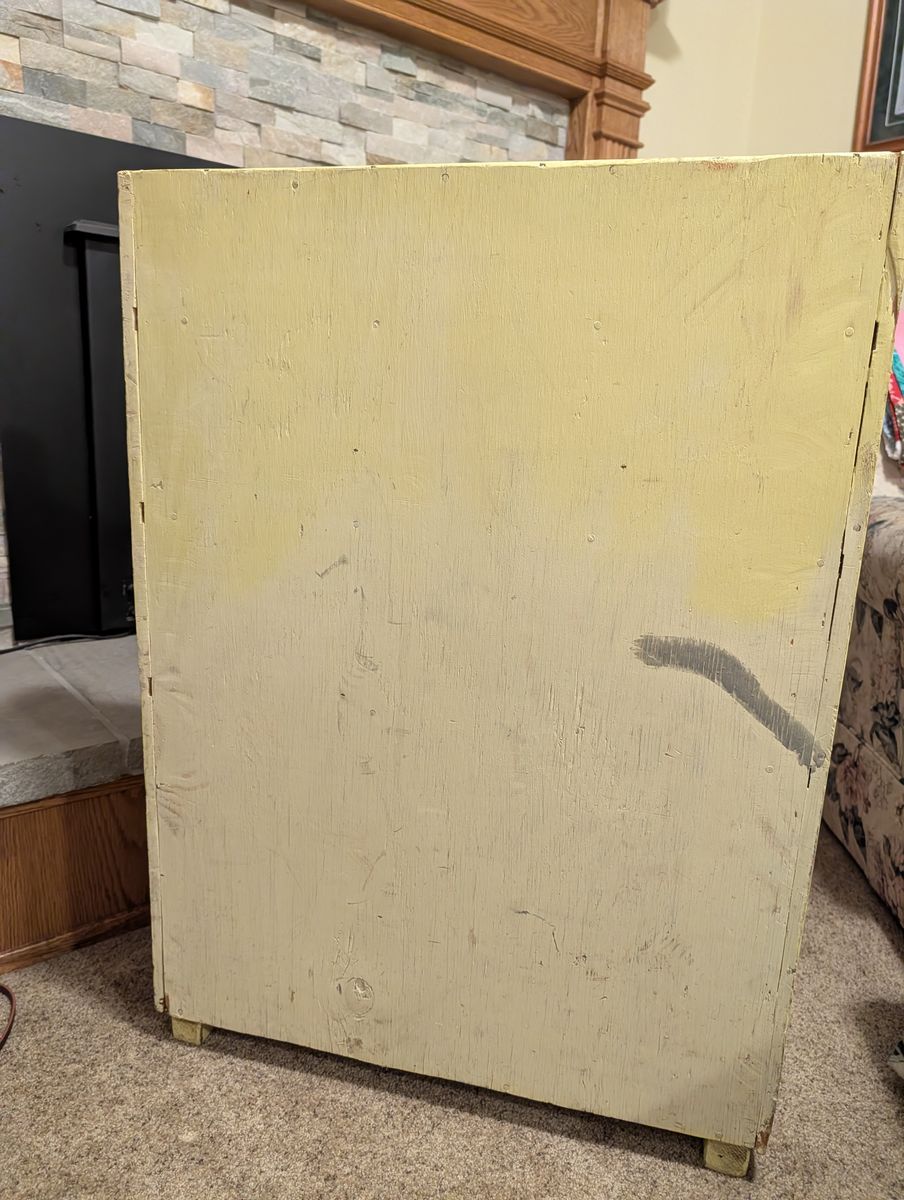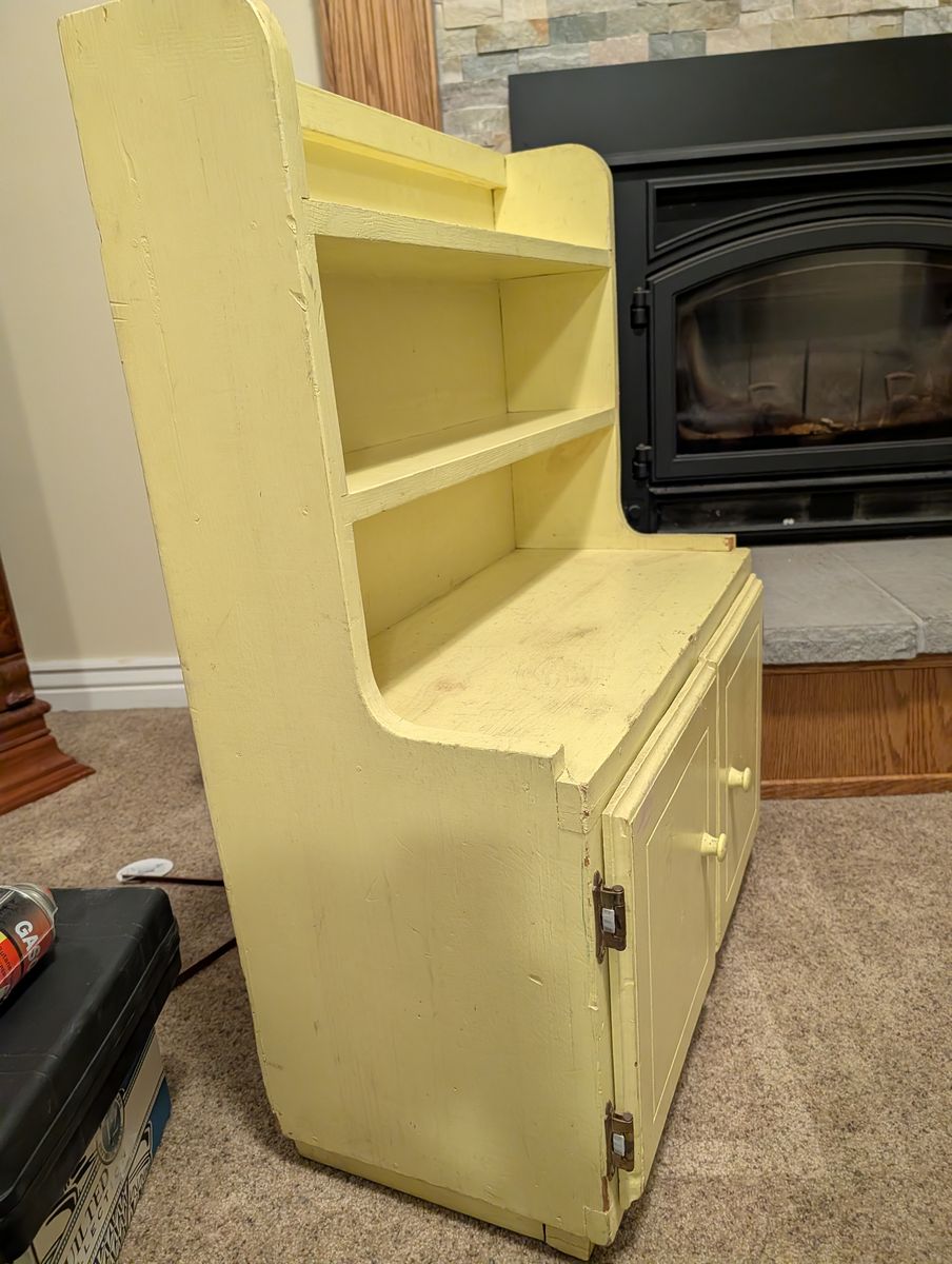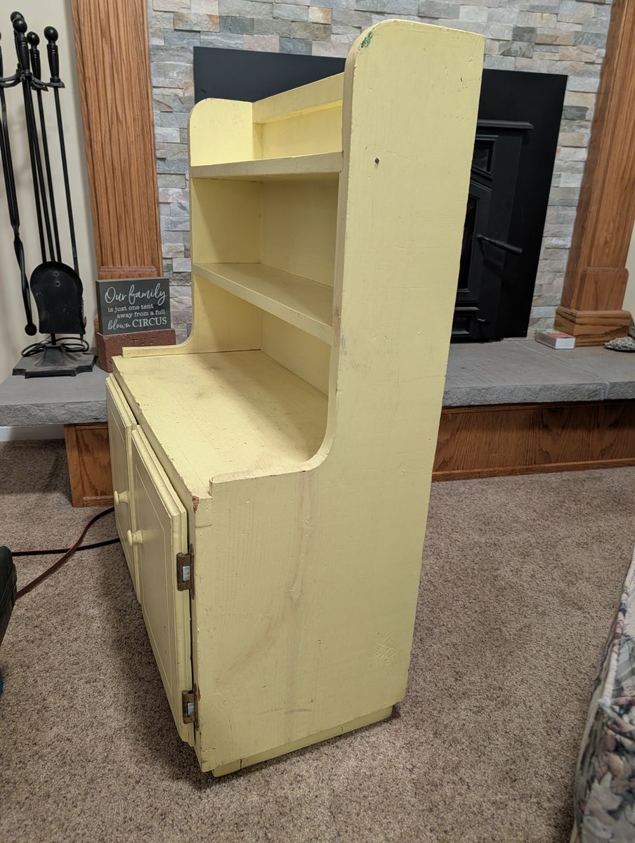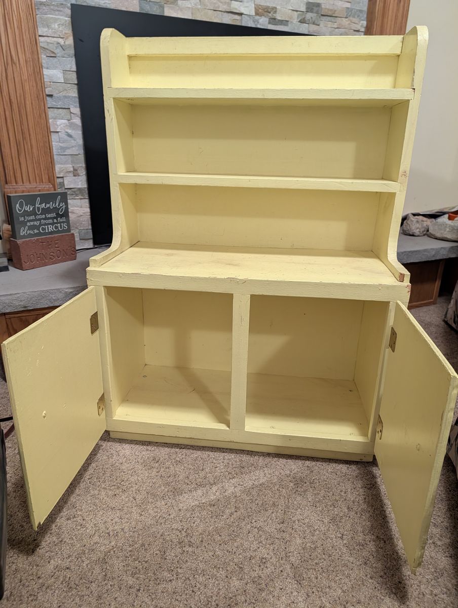VenmoSolid wood. 34 1/2" tall, 25" wide, 12" deep, 2 shelves at top are 5 3/4" deep. Well loved small cabinet. My dad made this for us when we were little as a "kitchen." Many imaginary meals were made here. It's now outgrown all the kids and grandkids. Exact cash or Venmo.