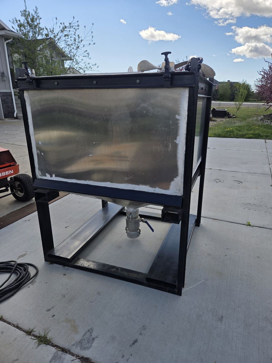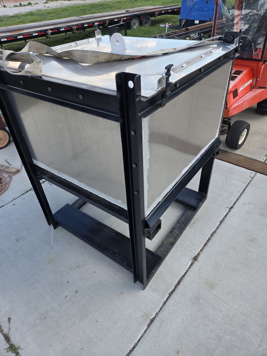 Aluminum hopper approximately 6' tall over all height 4'×4' bin plus cone depth. Two different forklift pockets, also has picking eyes for shackles or clevis's. 4 inch outlet with valve and camlock fitting for hose attachment.