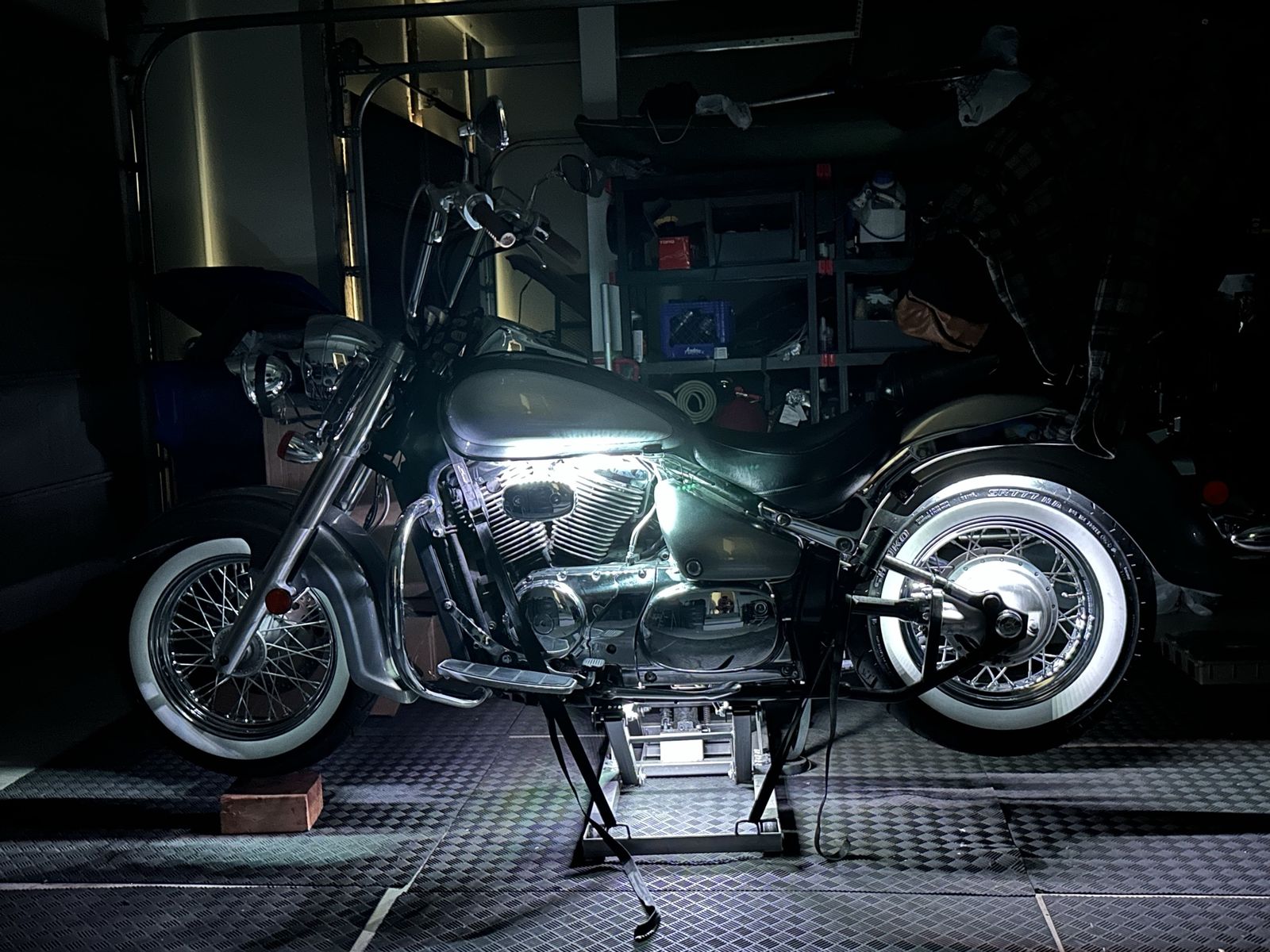 Performance Cobra Drag pipes (De-Baffled) Cobra FI2000R Fuel Processor K&N intake filter Cosmetics Clear reflectors Led fog lights Mustang fender bib Viking Bags Lamellar XL Viking Bags Quick Disconnect For the Bags Highway Pegs