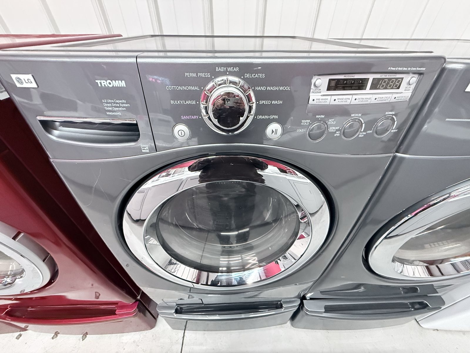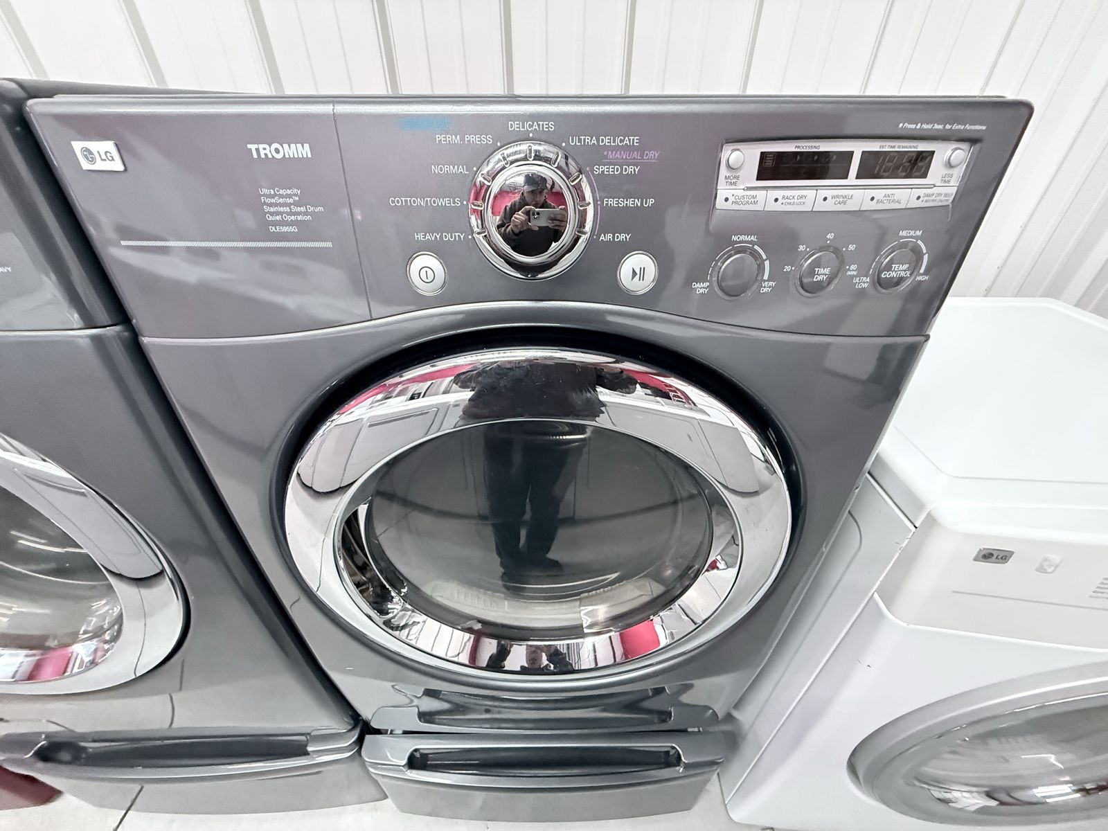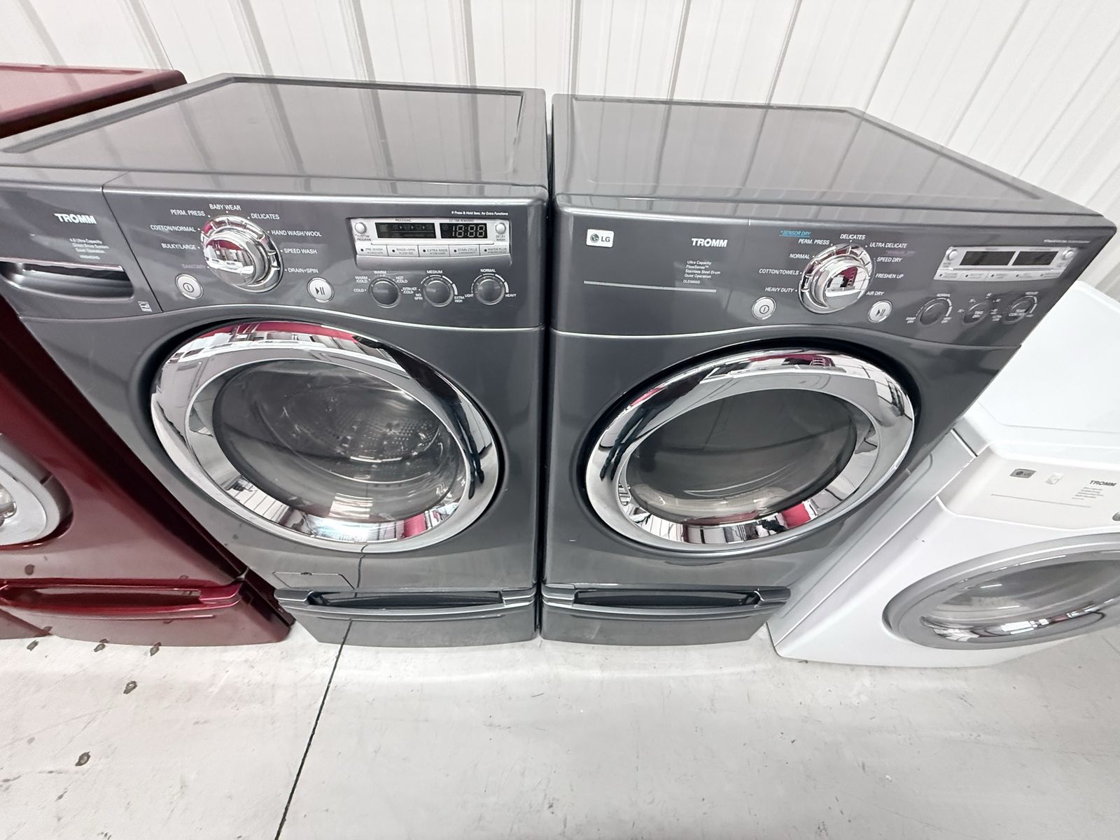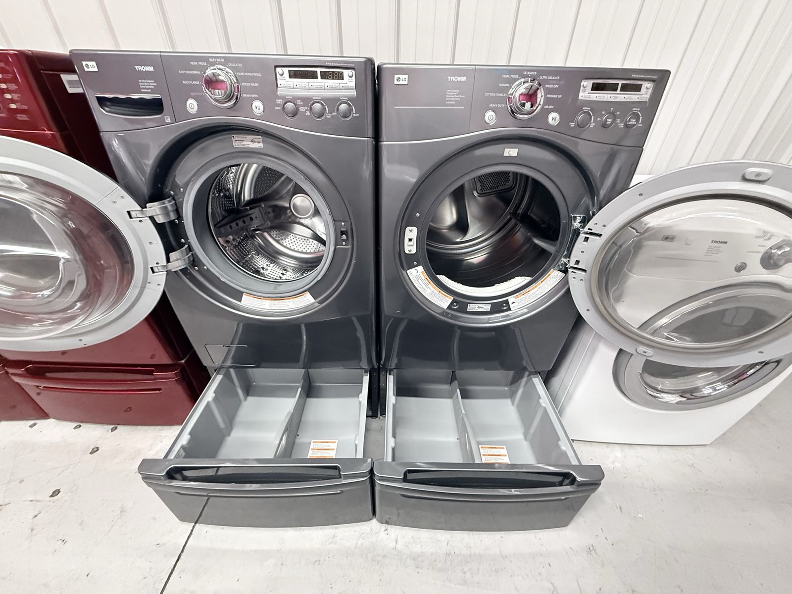 ApplePayVery clean matching dark grey ultra capacity Lg washer & dryer set on pedestals that can go side by side!!