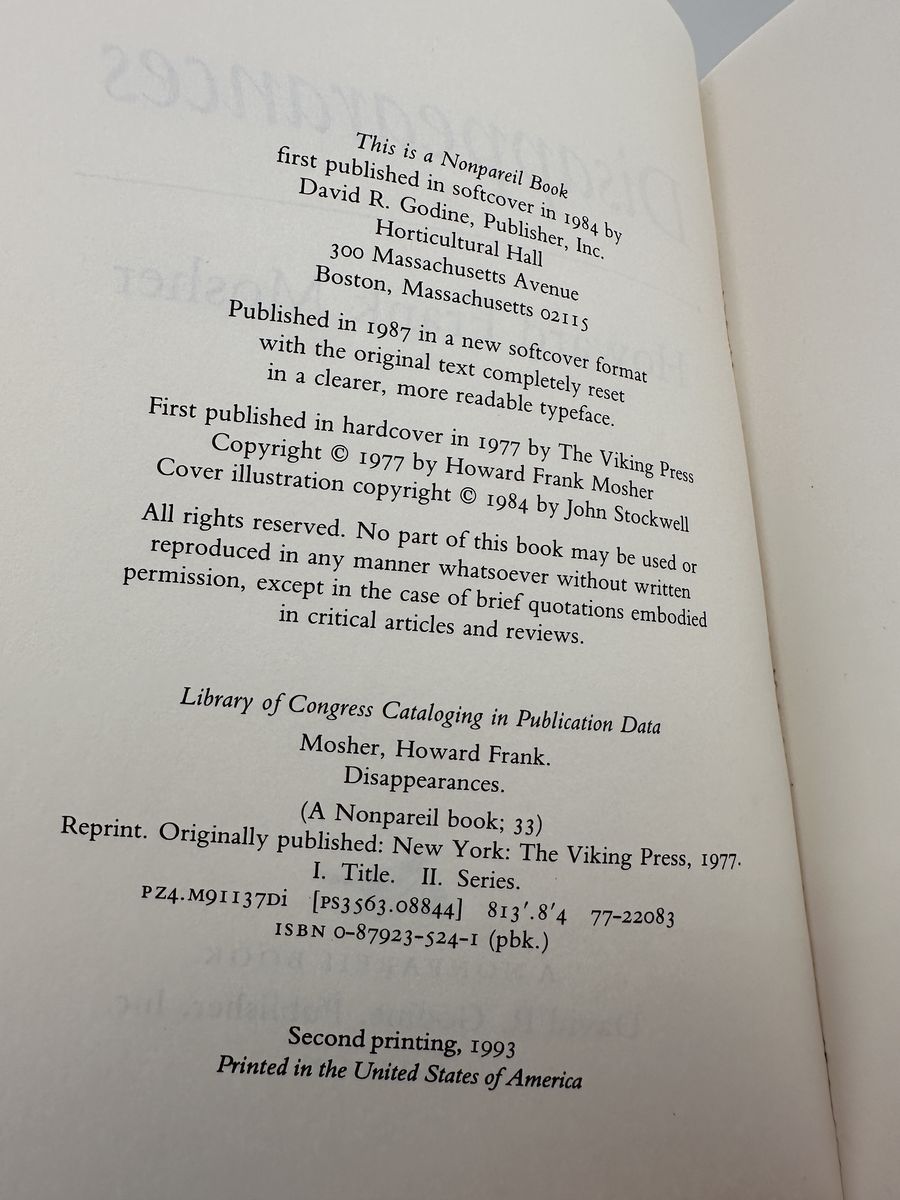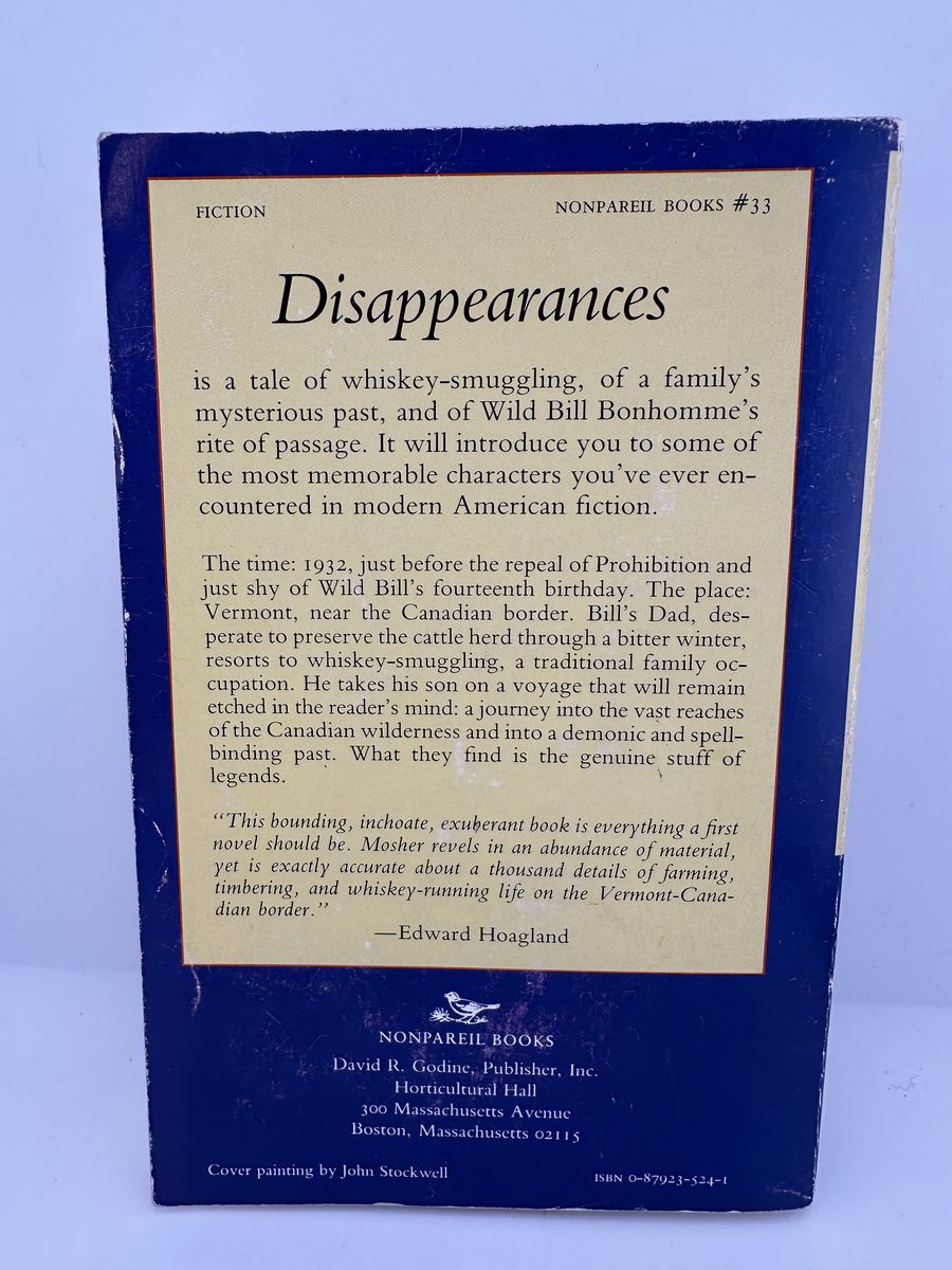 ApplePayVintage 1993 second printing of Disappearances by Howard Frank Mosher (Nonpareil Books #33). Trade paperback in good reading condition with cover wear and previous owner name. A classic Vermont-based literary novel set during Prohibition—great for collectors of regional American fiction.