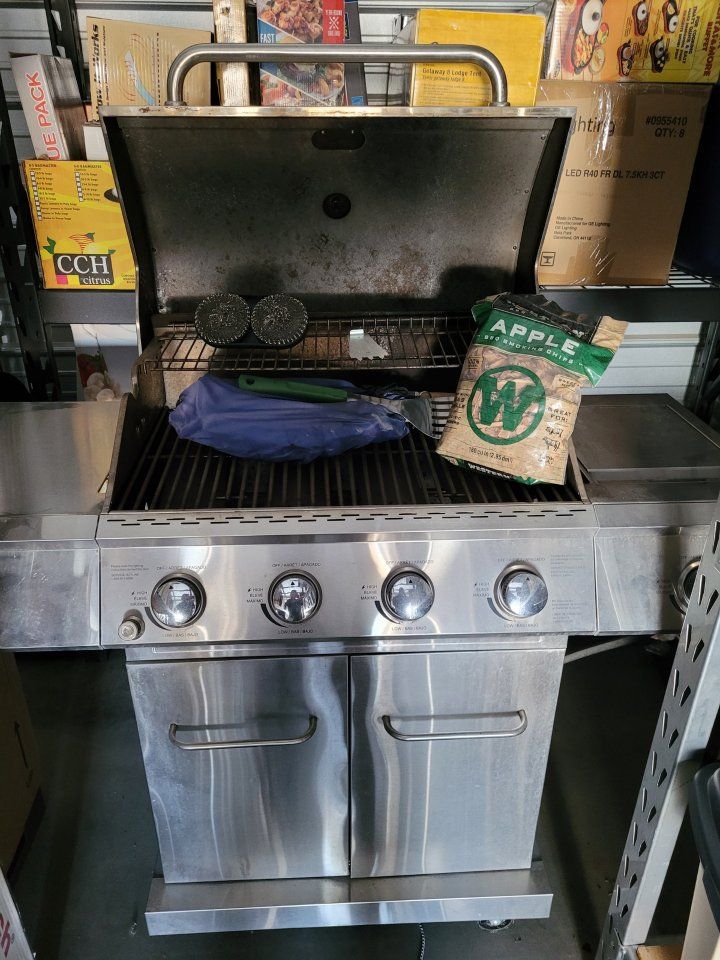 Stainless 4 burger + 1 side burner gas grill. 1 propane tank and many grilling tools.
