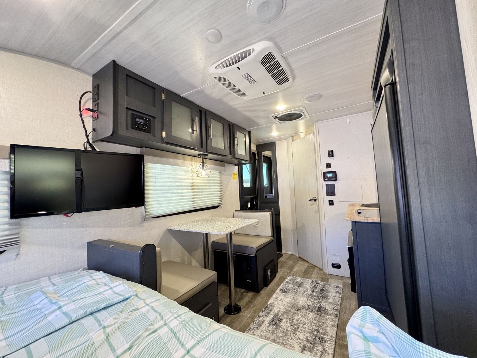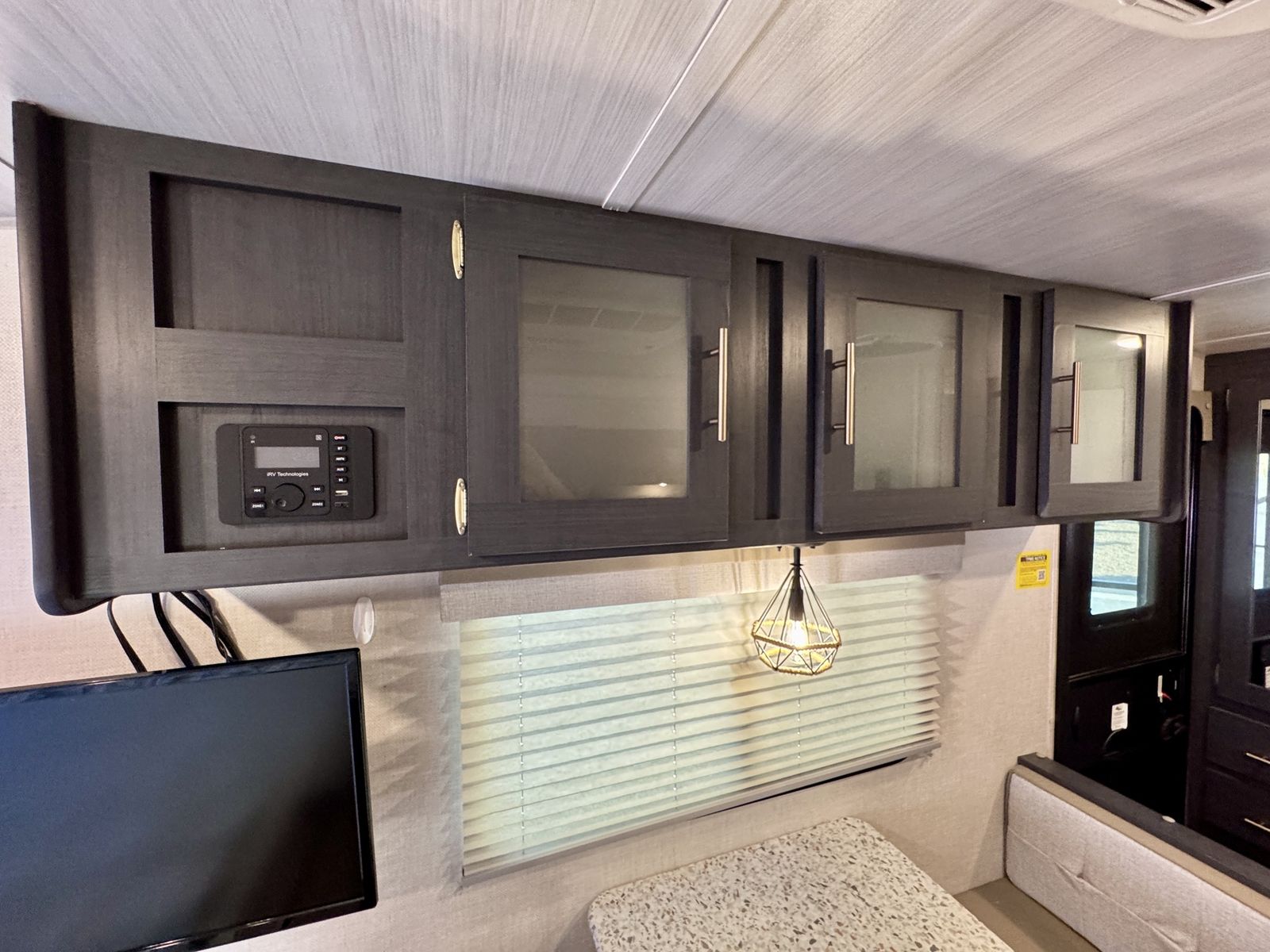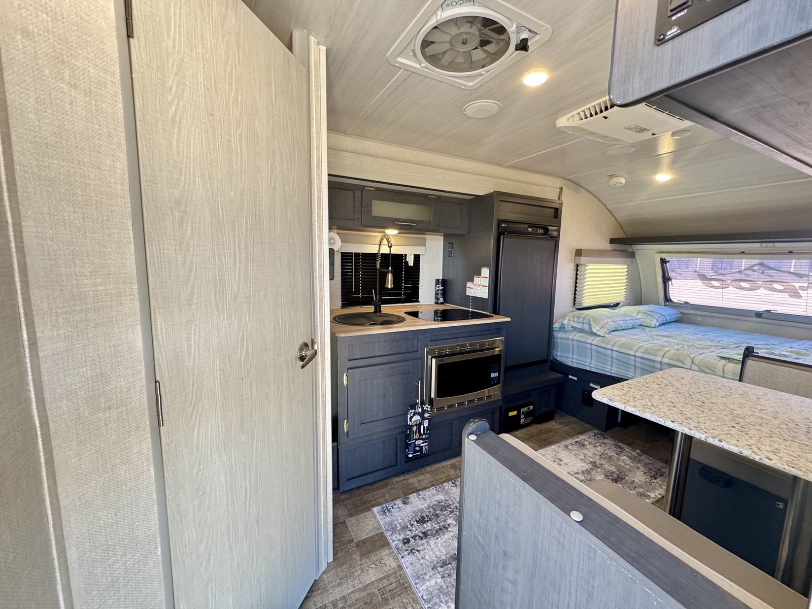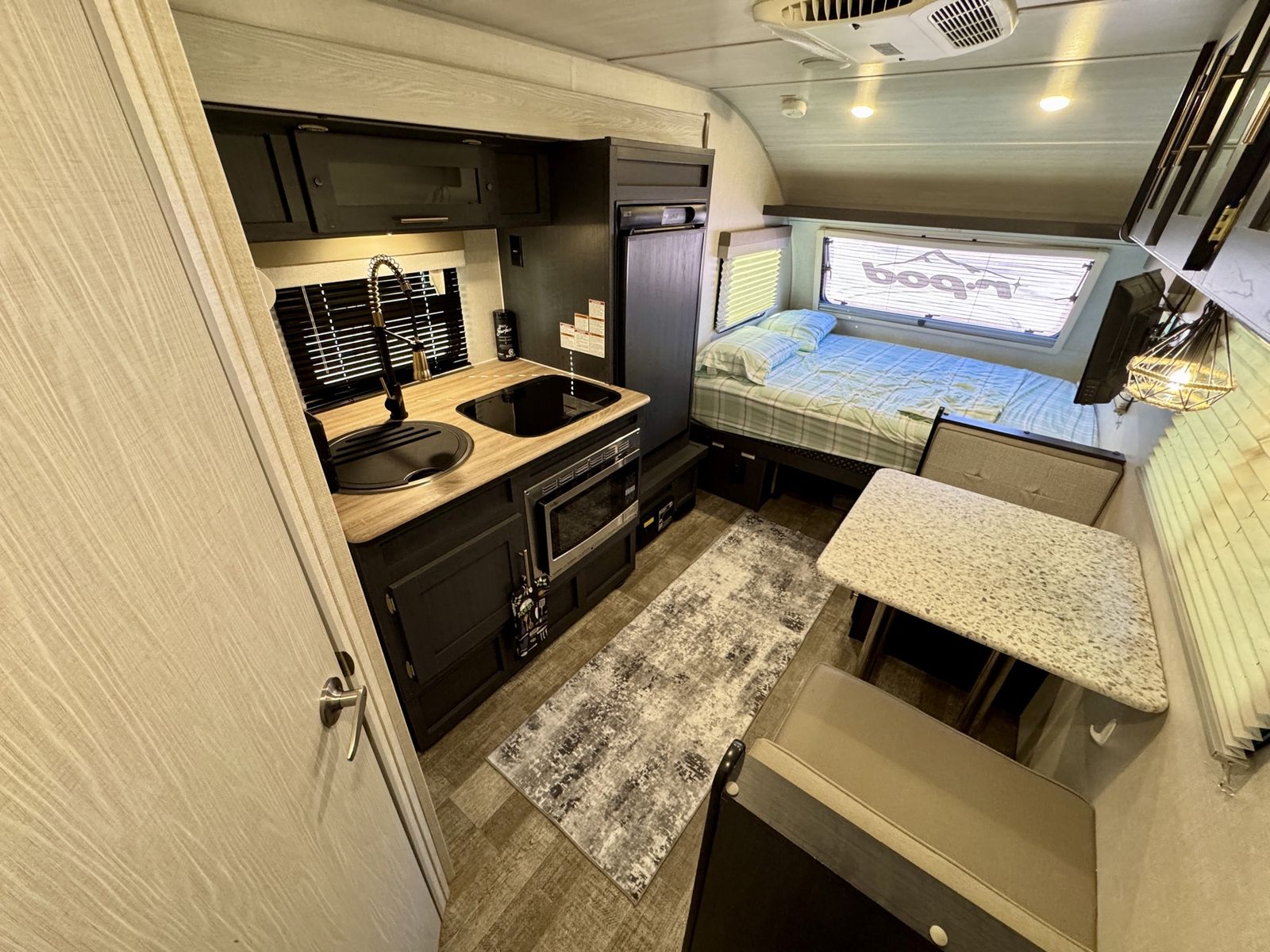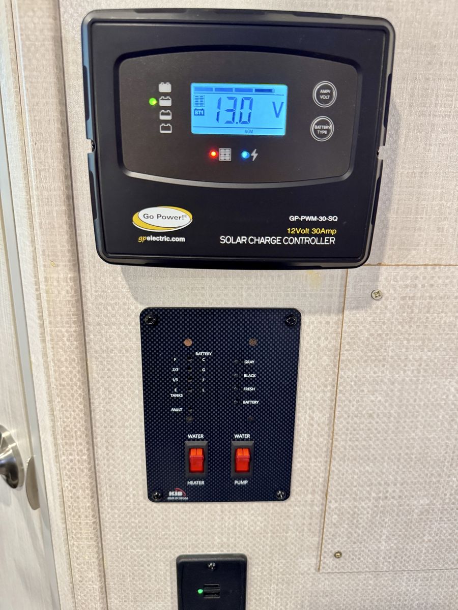 Onboard solar, with panel & controller, Two batteries, electric tongue jack and awning, Kitchen has sink, 3 way fridge, convection oven, Has tons of cabinetry, storage inside and out,