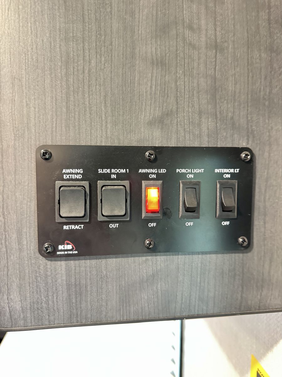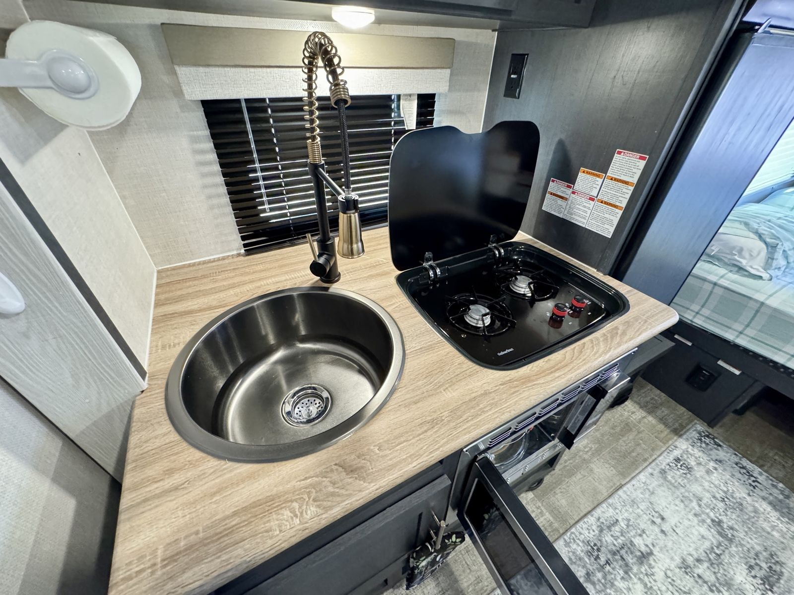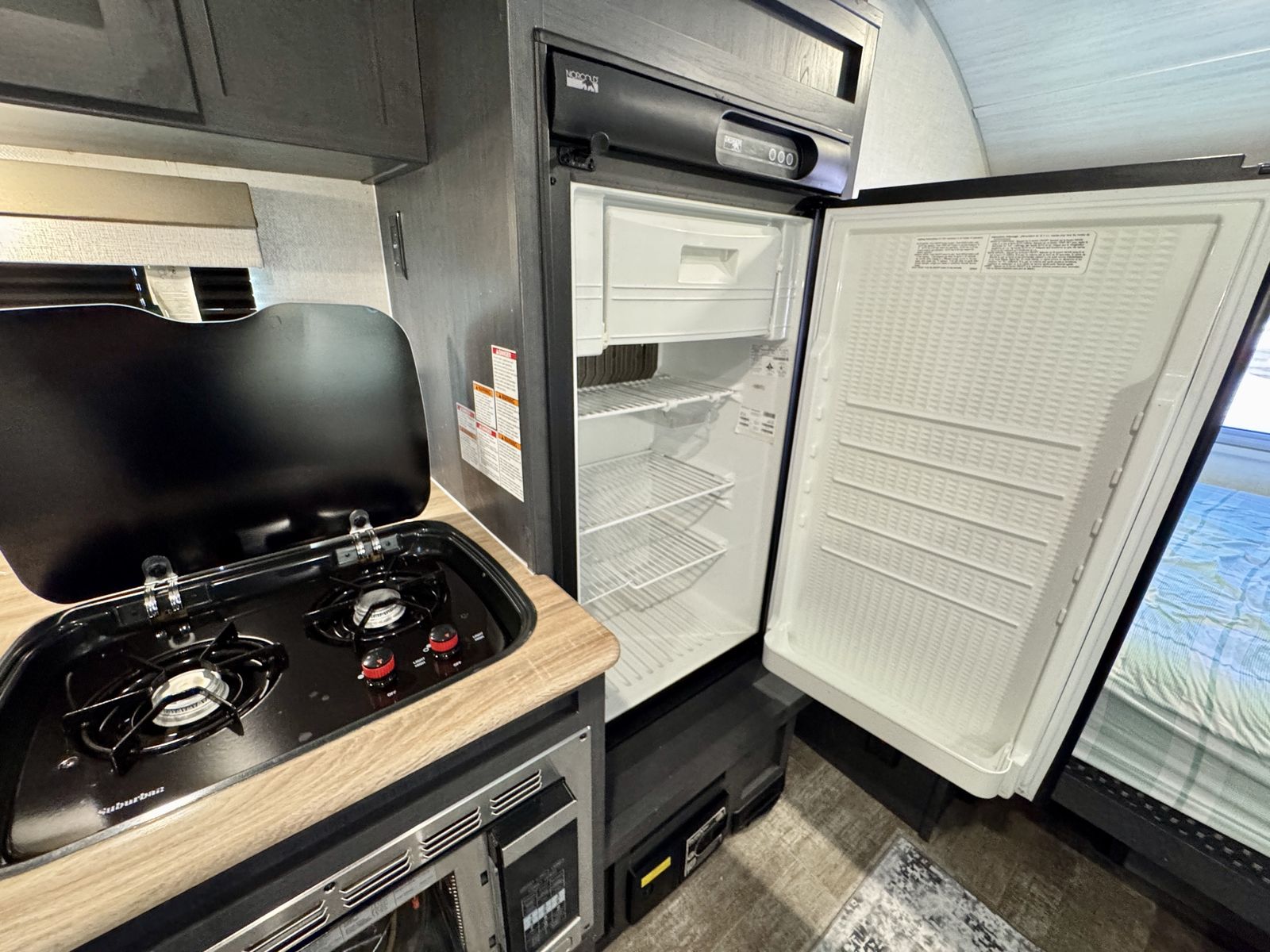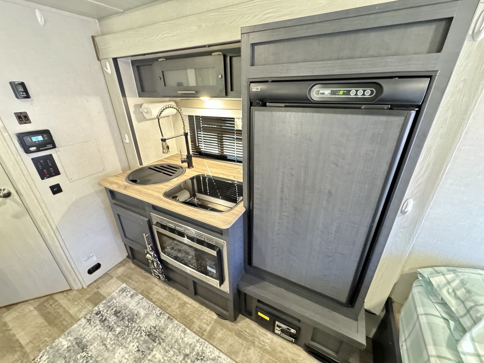 Onboard solar, with panel & controller, Two batteries, electric tongue jack and awning, Kitchen has sink, 3 way fridge, convection oven, Has tons of cabinetry, storage inside and out,