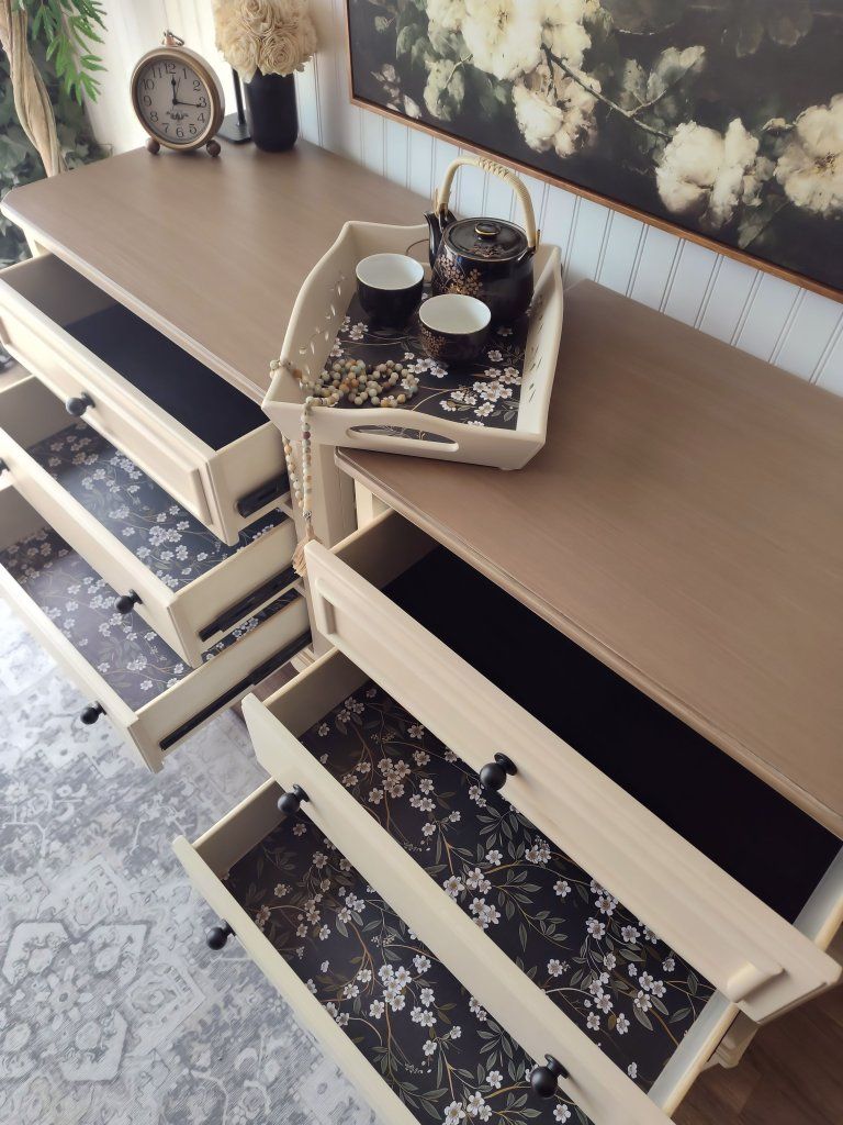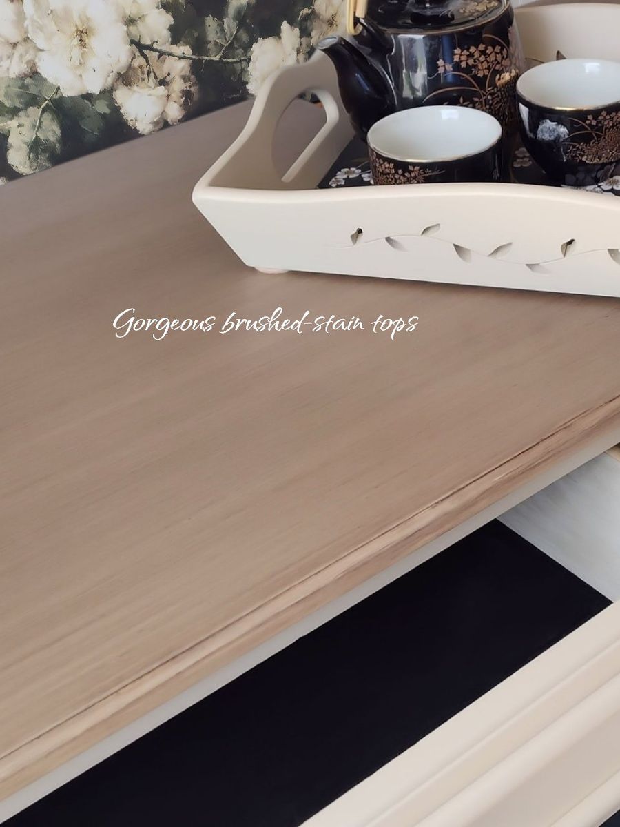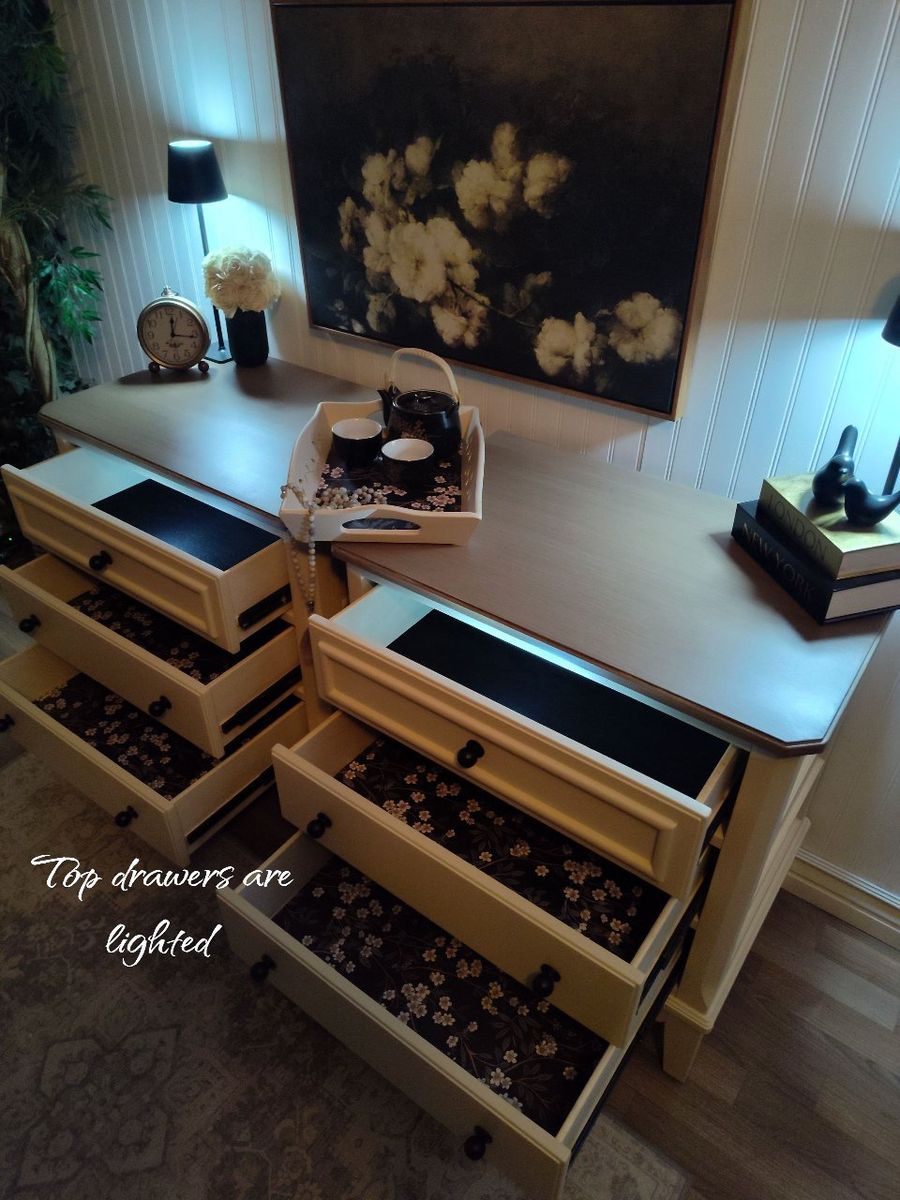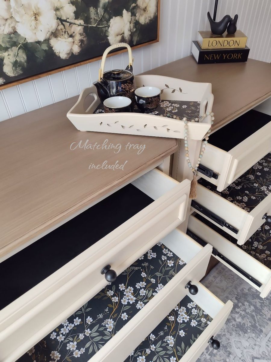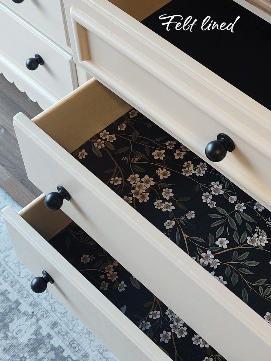 These feature: • 100% solid wood • Dovetail construction & reinforced joints • Top drawers have small added on/off lights • Tall, sturdy, well made by Ashley Furniture • Backs & Bottoms refinished as well • 3 drawers offer plenty of room for storage • Ball bearing, self closing drawer glides (top of the line) glides with ease • Wax sealed interiors • Professional grade enamel cabinet paint sprayed with a professional air compressor • Tops are a cool light-wood tone, brushed on (grayish undertones) and 3x protective top coat for extra moisture protection • Black felt in the top drawers in pristine condition • Dark floral liner, professional installed and sealed for long-term adhesion • New black ball knobs (also available in brass) • Darling scalloped edges (wood) • New felt feet/risers to protect flooring & furniture • Foam wrapped for protection in transfer • Matching wooden tray included