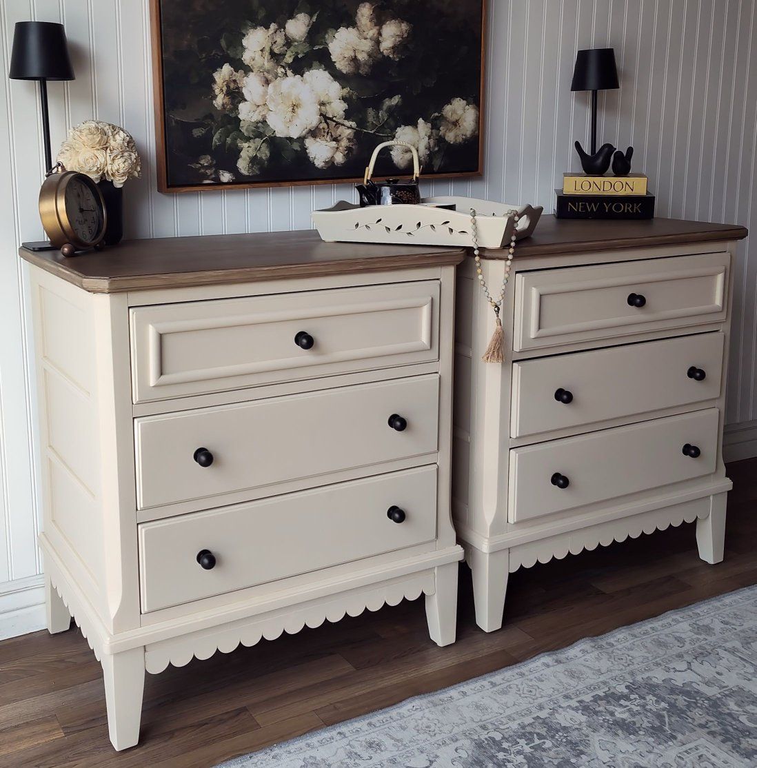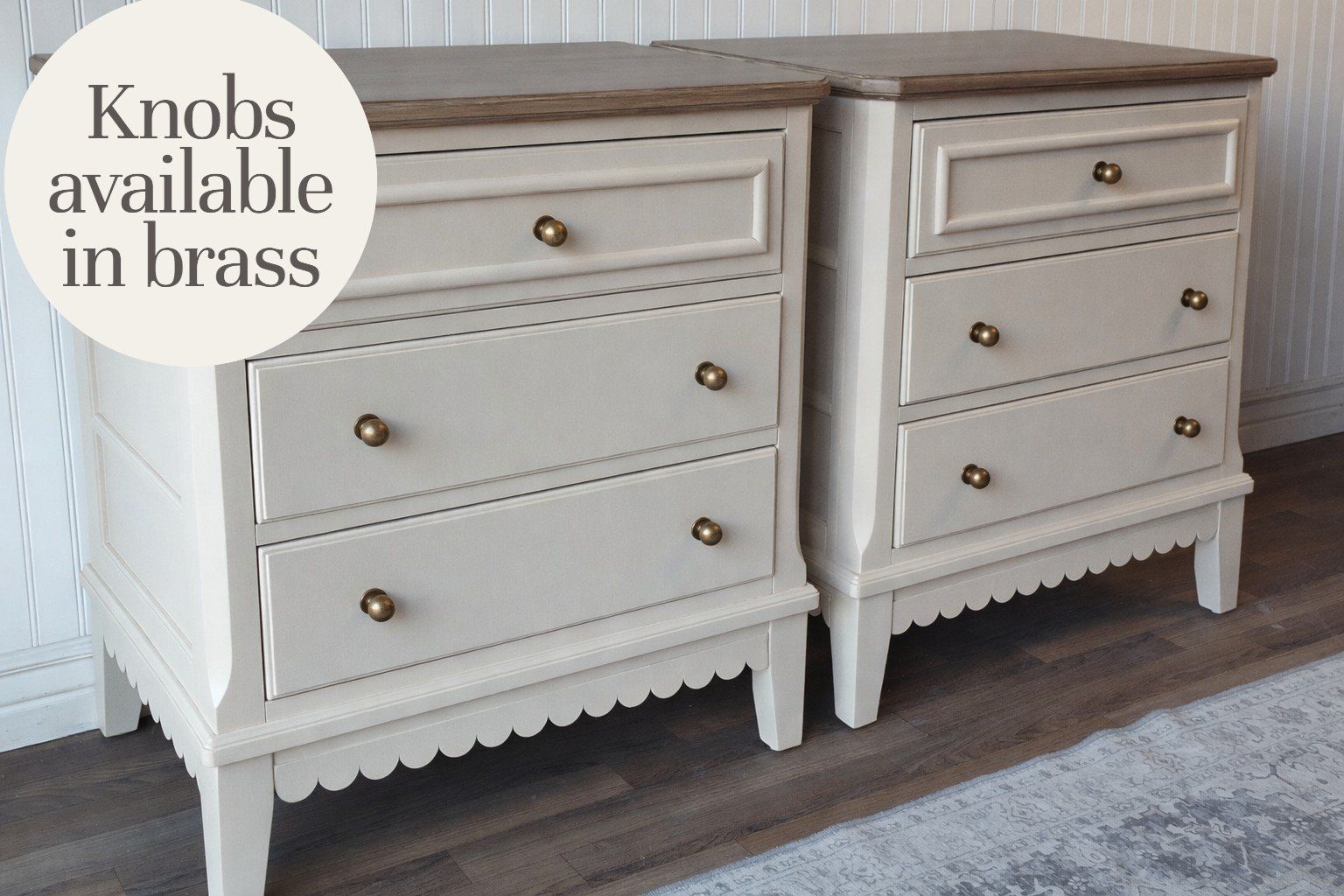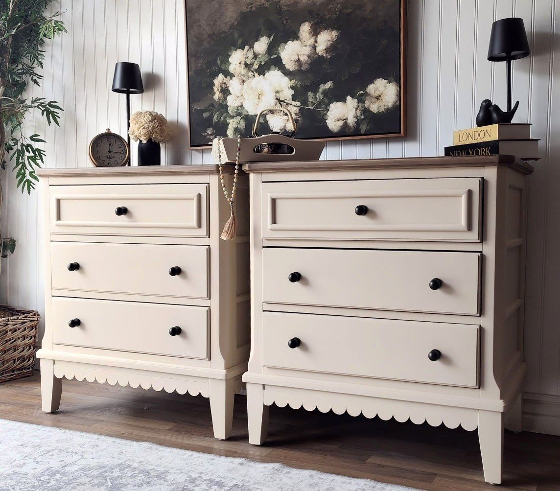 These have been professionally refinished (air-compressor gun) in a warm neutral beige called "Malabar" by Sherwin Williams. The scalloped detail, and brushed light-wood tone on the tops, add the right amount of charm. It's clean lines, and top-of-the line drawer glides & hardware keep these updated with luxury quality. These have many thoughtful details, including top lighting in the drawers as an added convenience.
