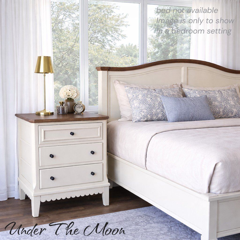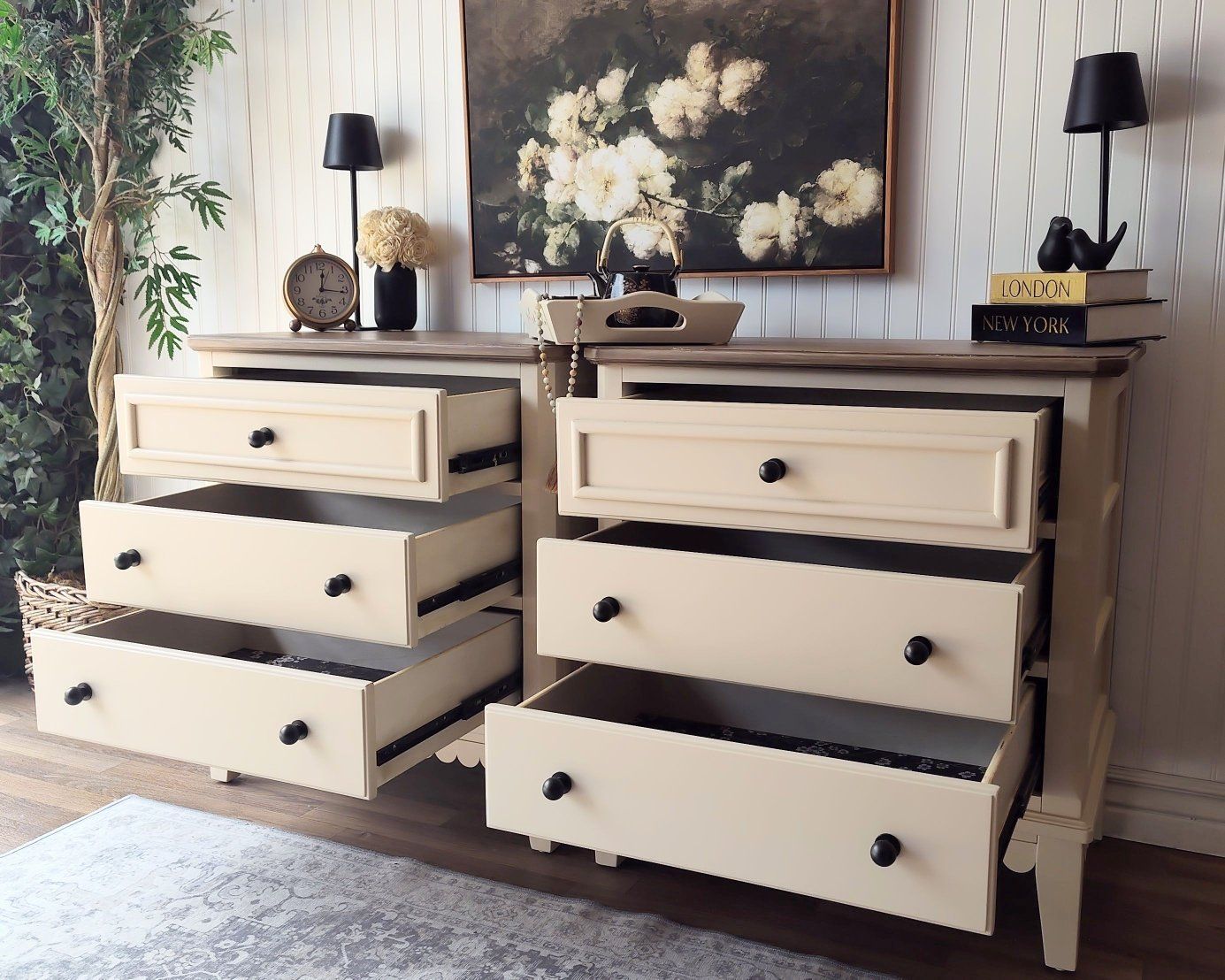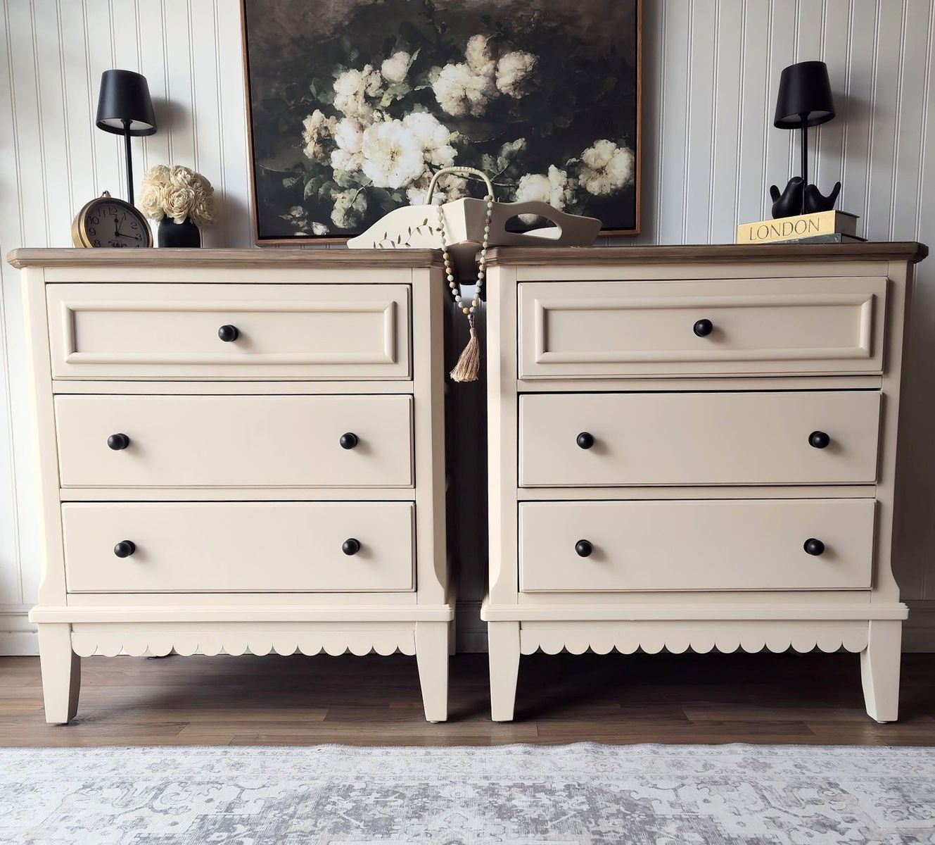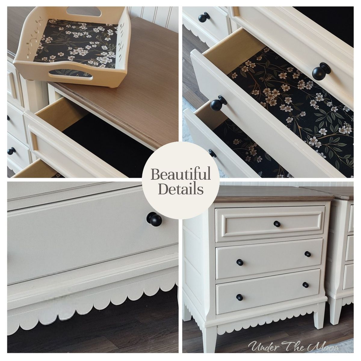 These have been professionally refinished (air-compressor gun) in a warm neutral beige called "Malabar" by Sherwin Williams. The scalloped detail, and brushed light-wood tone on the tops, add the right amount of charm. It's clean lines, and top-of-the line drawer glides & hardware keep these updated with luxury quality. These have many thoughtful details, including top lighting in the drawers as an added convenience.