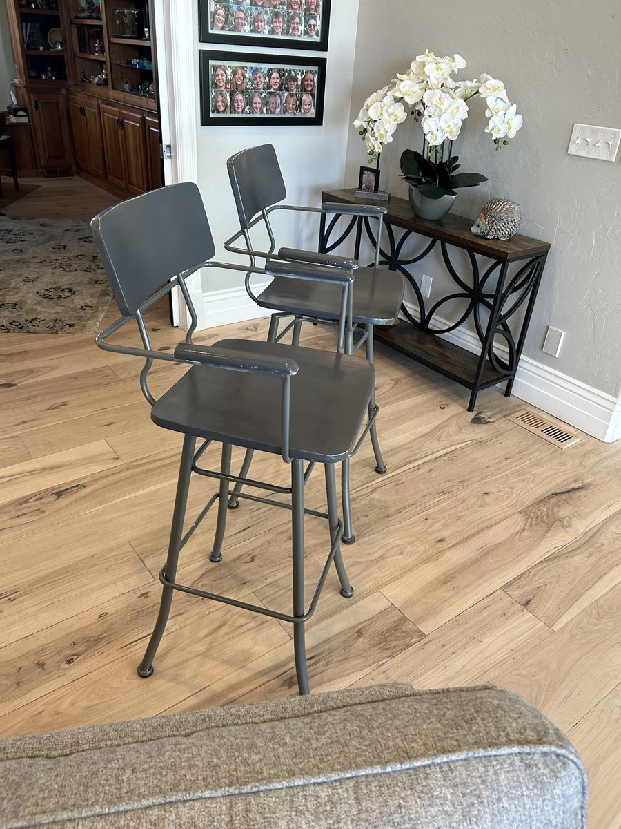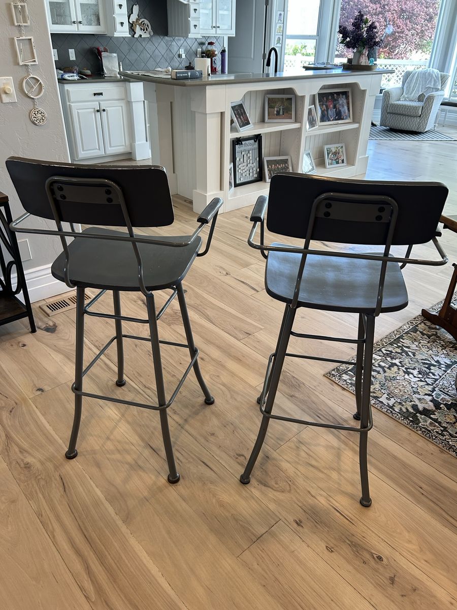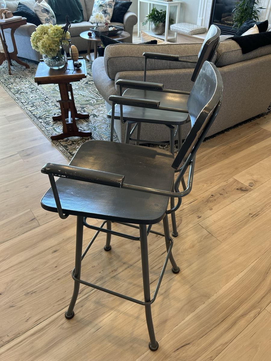 VenmoSolid construction. Seat and backrest can be removed easily with Allen Wrench for painting another color. These are high stools similar to stools in breakfast bars. Modern design. Seat is 31” high and 21” wide. Chair top sits at 45”. Slightly worn.
