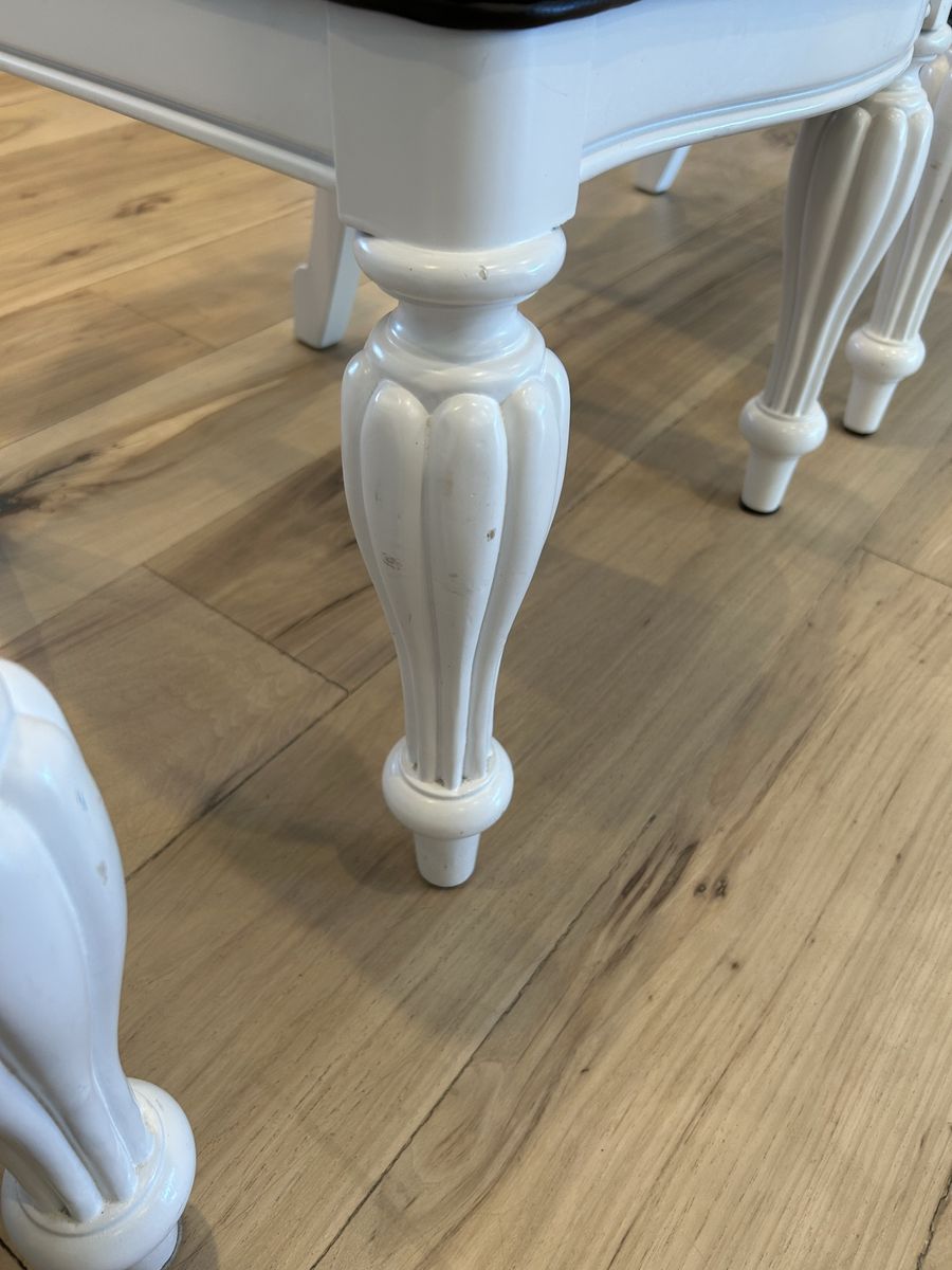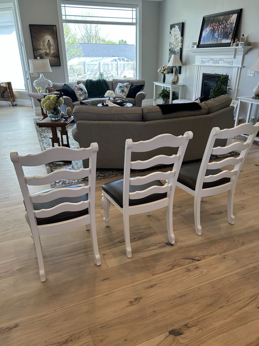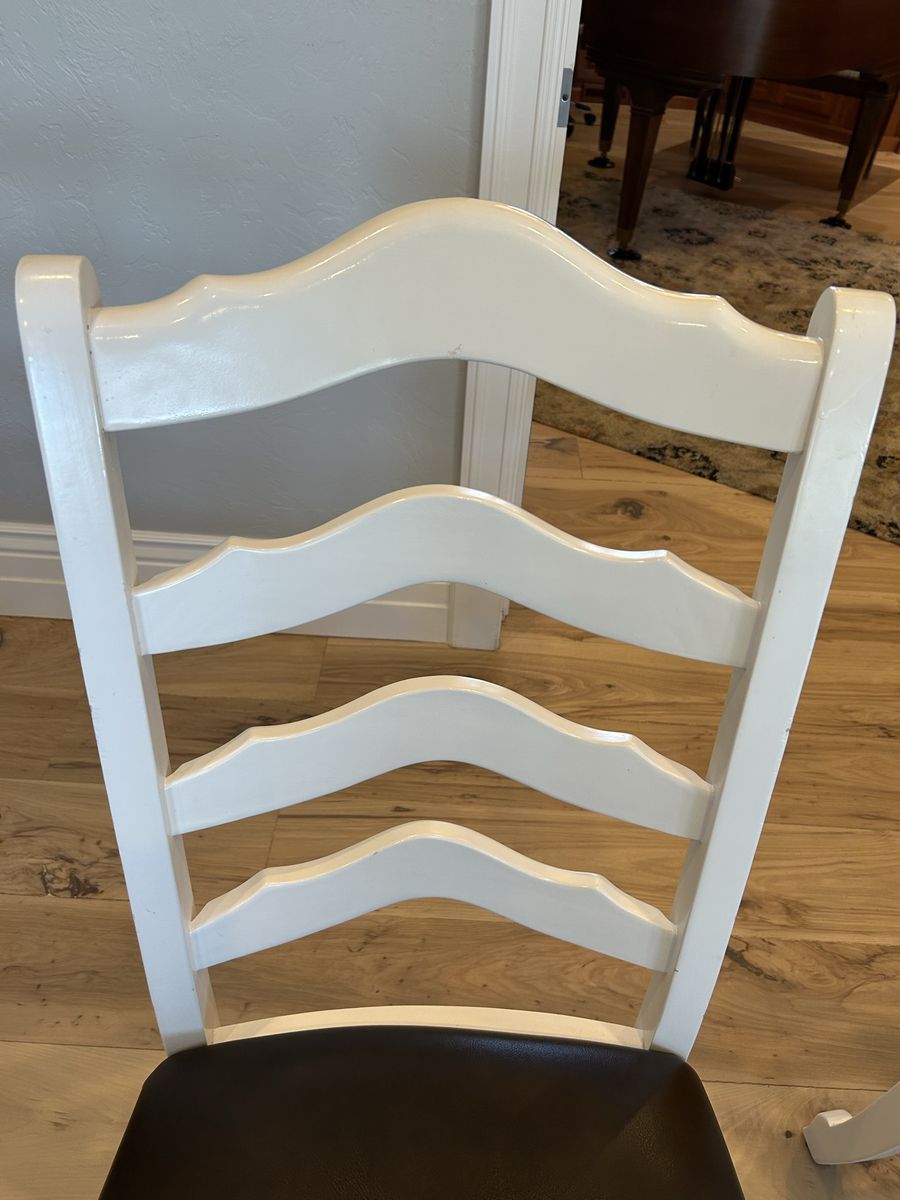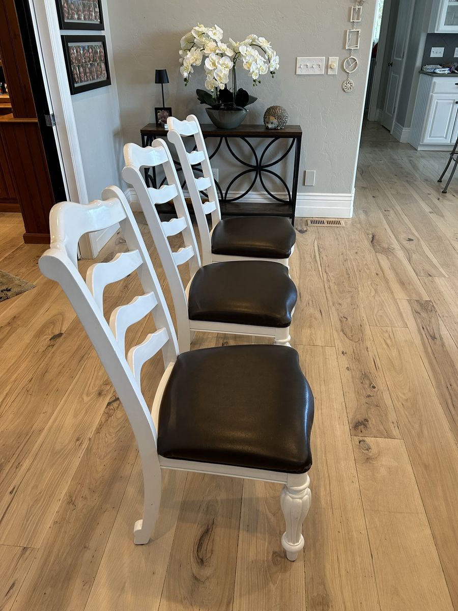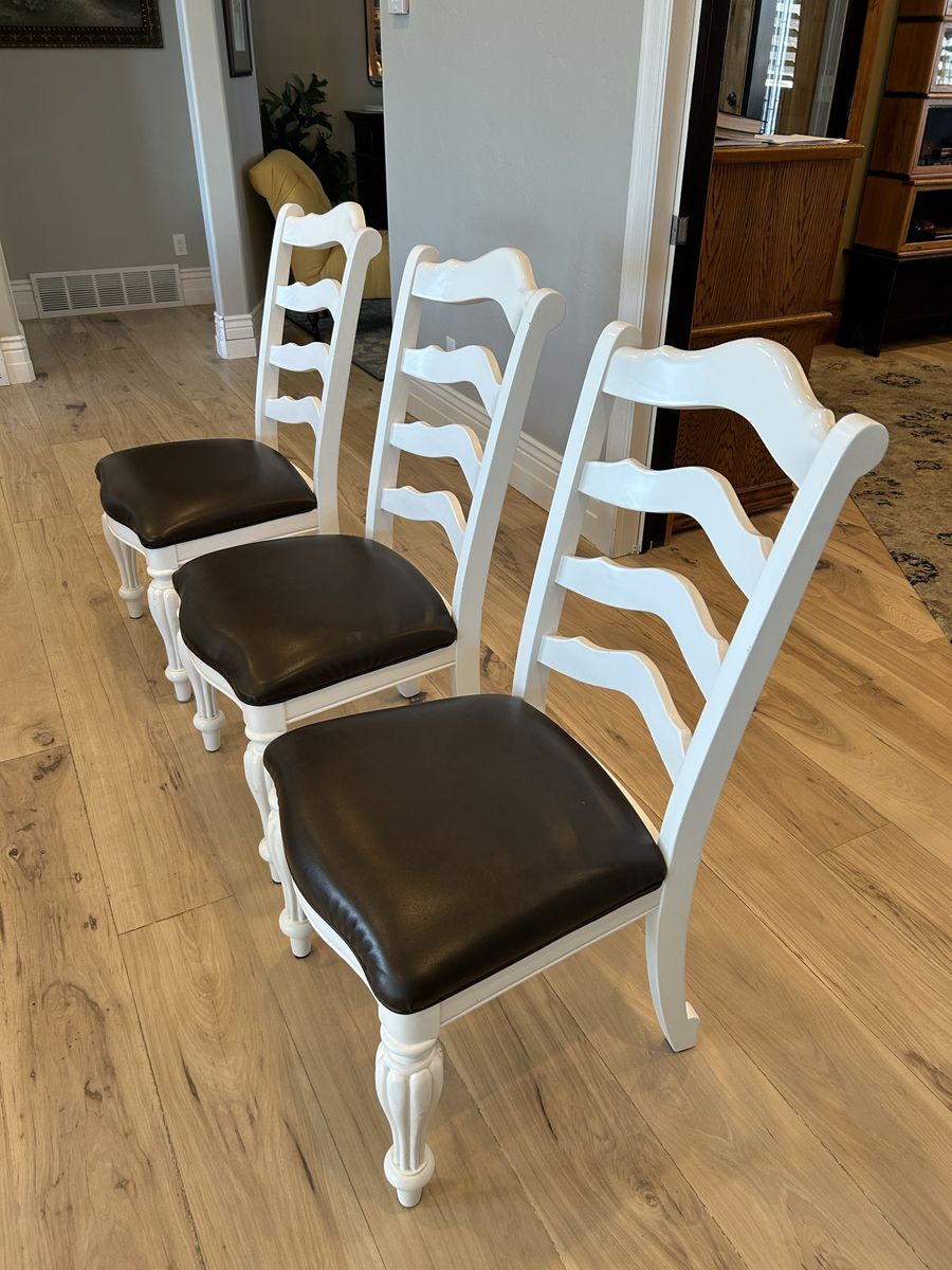 VenmoThese are heavy dining room chairs with a tall back. They are painted white and have a seated cushion with faux leather. They are 18 inches high to the seat and. 40 inches high to the top of the chair back.. they are in slightly used condition. There are only three available.