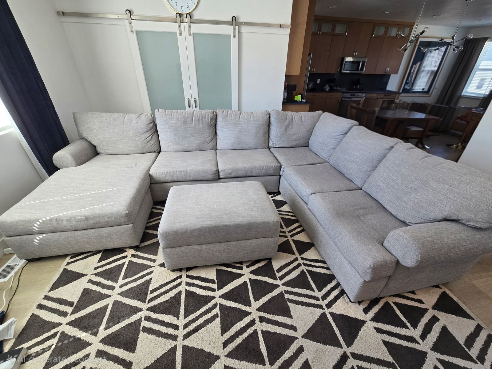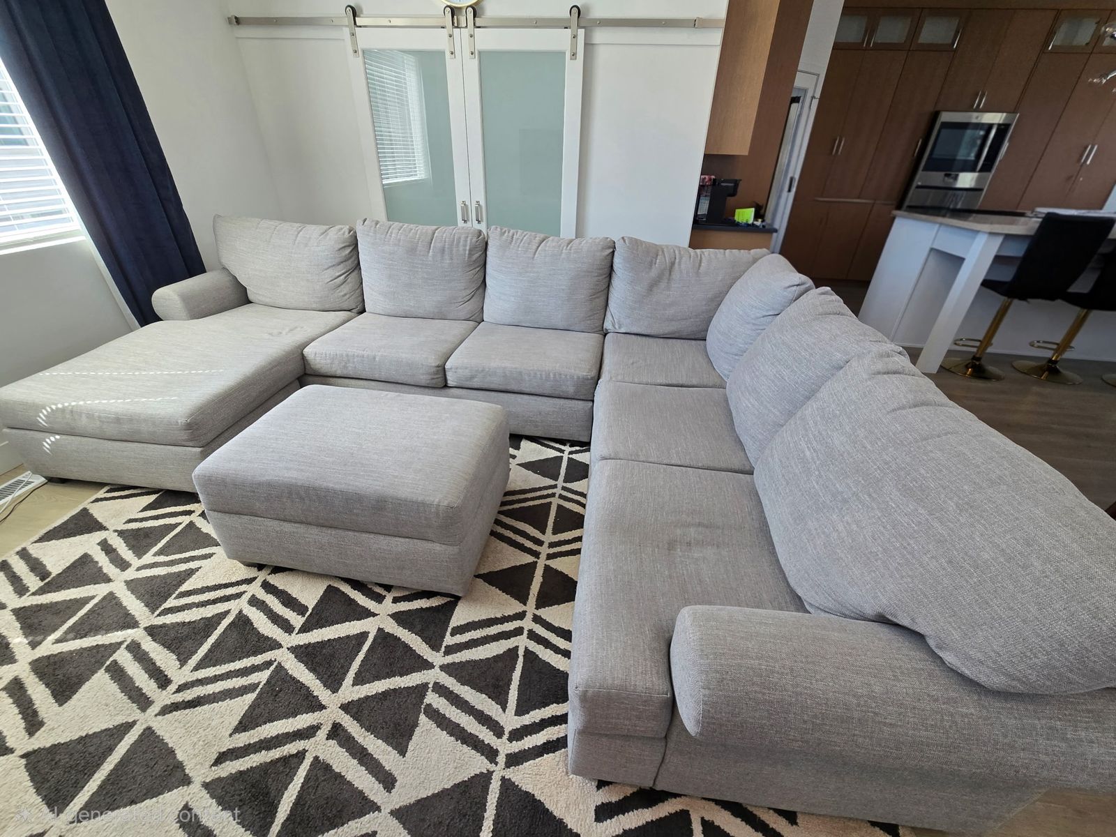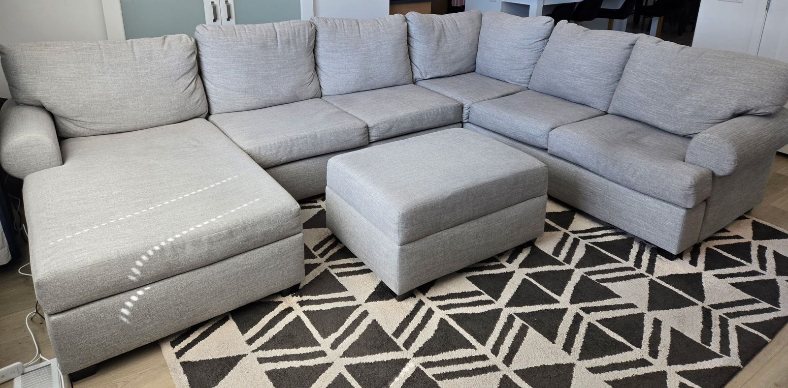 PayPalSpacious and comfortable light gray sectional sofa in Excellent Condition!! Less than 2 years old. Has a comfy chaise lounge and a matching ottoman with storage. Fabric upholstery. Great for living room or family room. Only selling because we are moving and its too big for our new space!! 141x101x71(Chaise) Bought for $2,000 less than 2 years ago from Living Spaces. FCFS. Venmo or Cash only. Come check it out!! Need gone by Friday!!